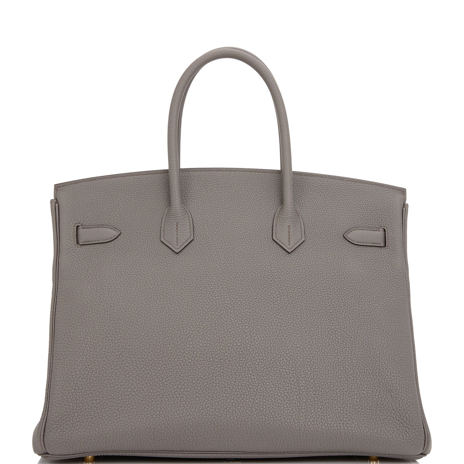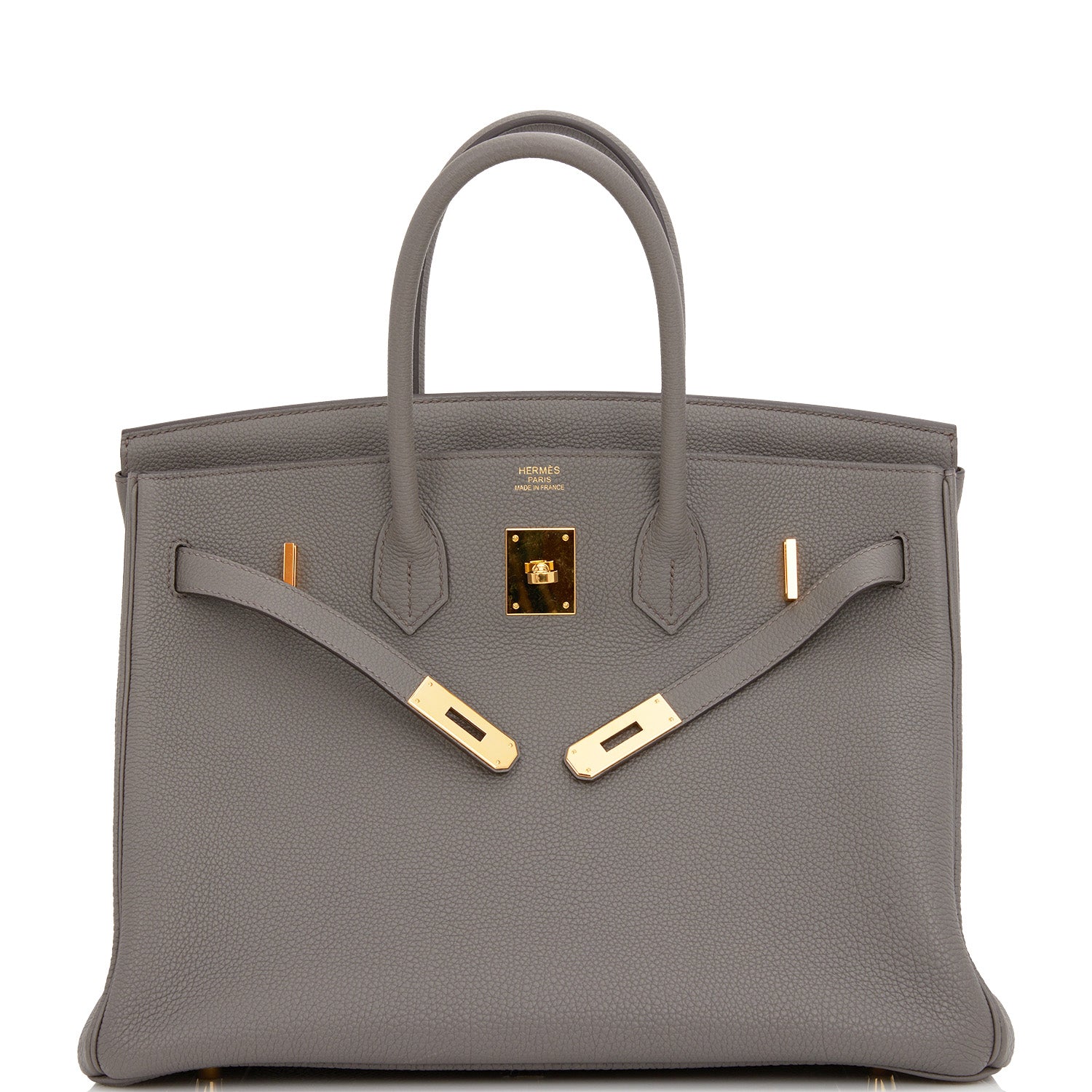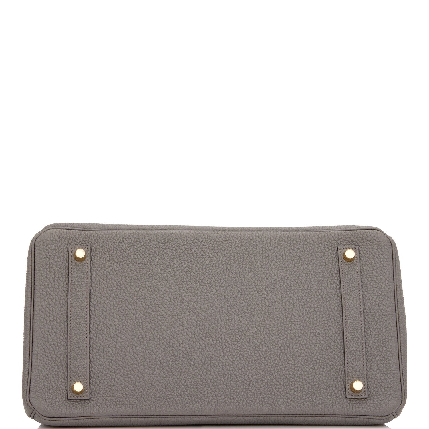 This Birkin is in Etain togo leather with gold hardware and has tonal stitching, two straps with front toggle closure, clochette with lock and two keys and double rolled handles.
