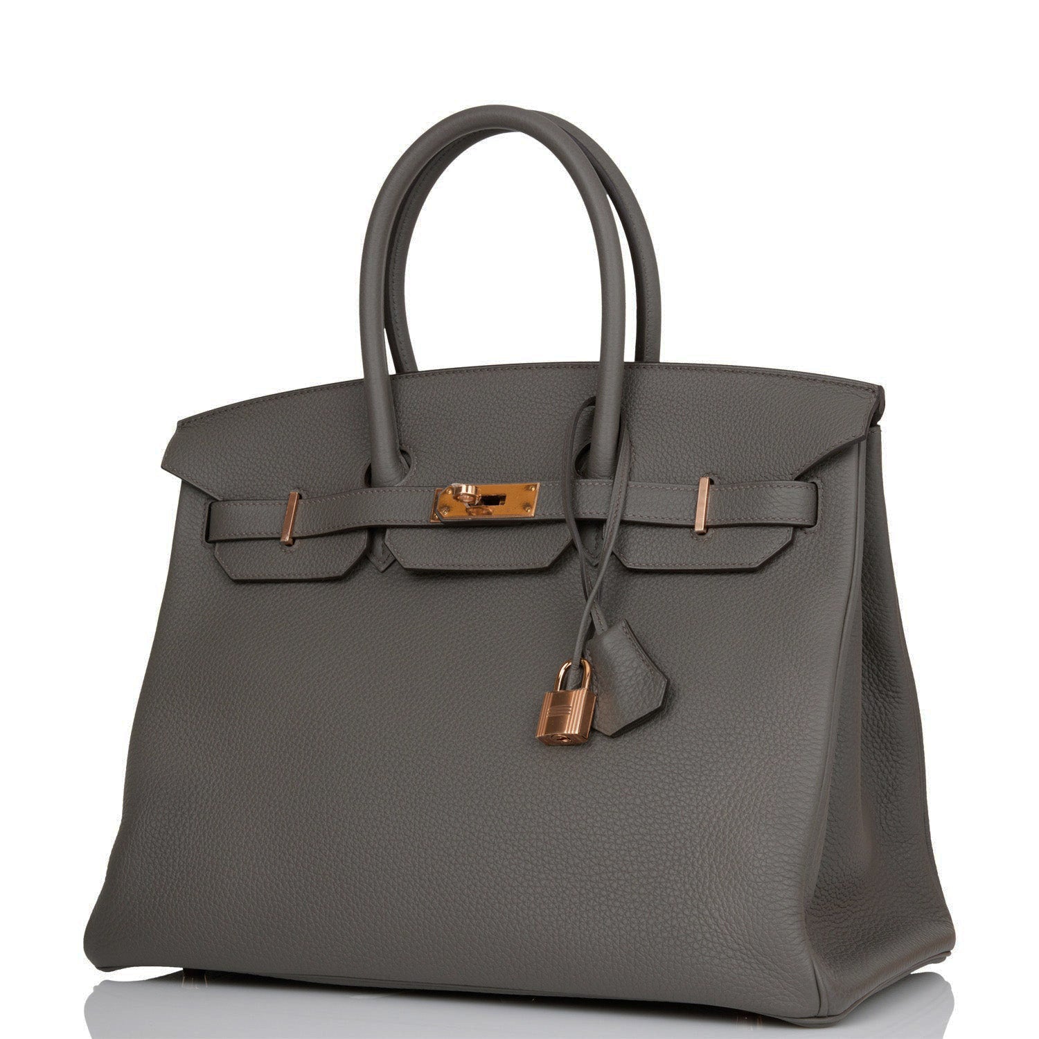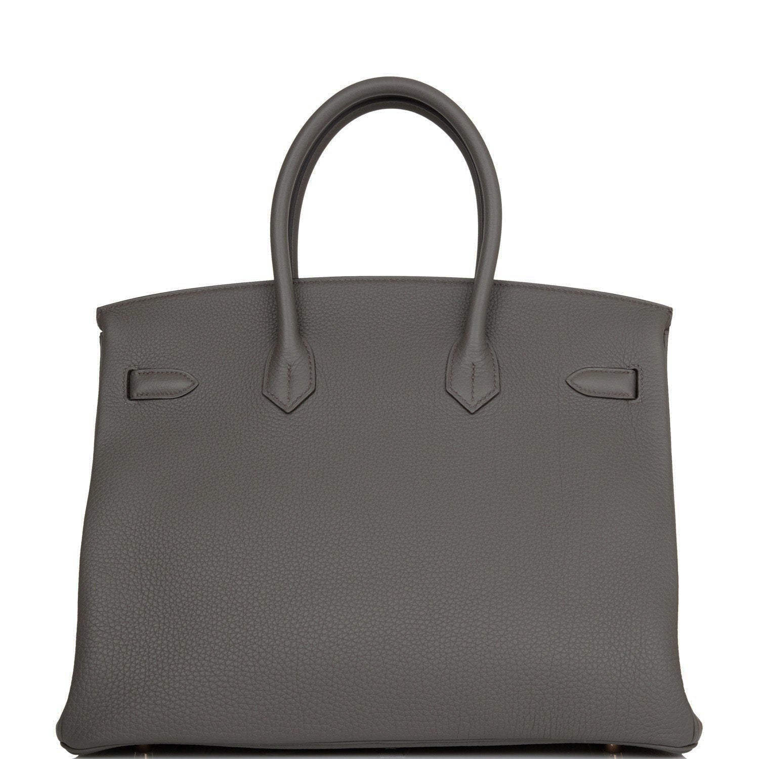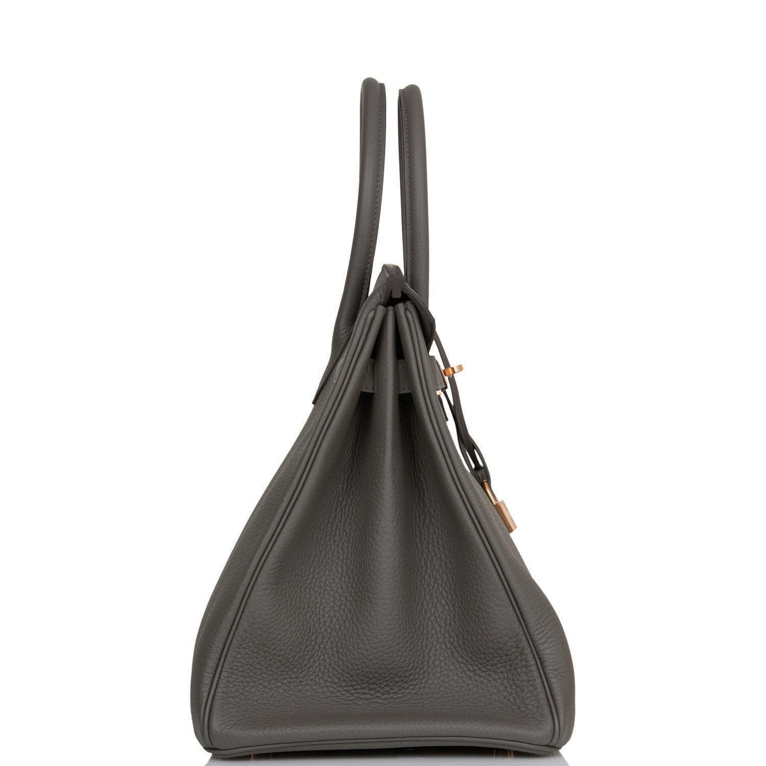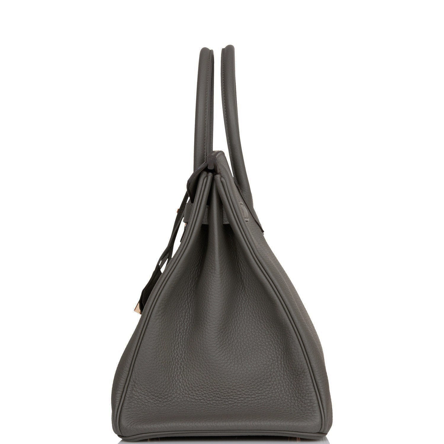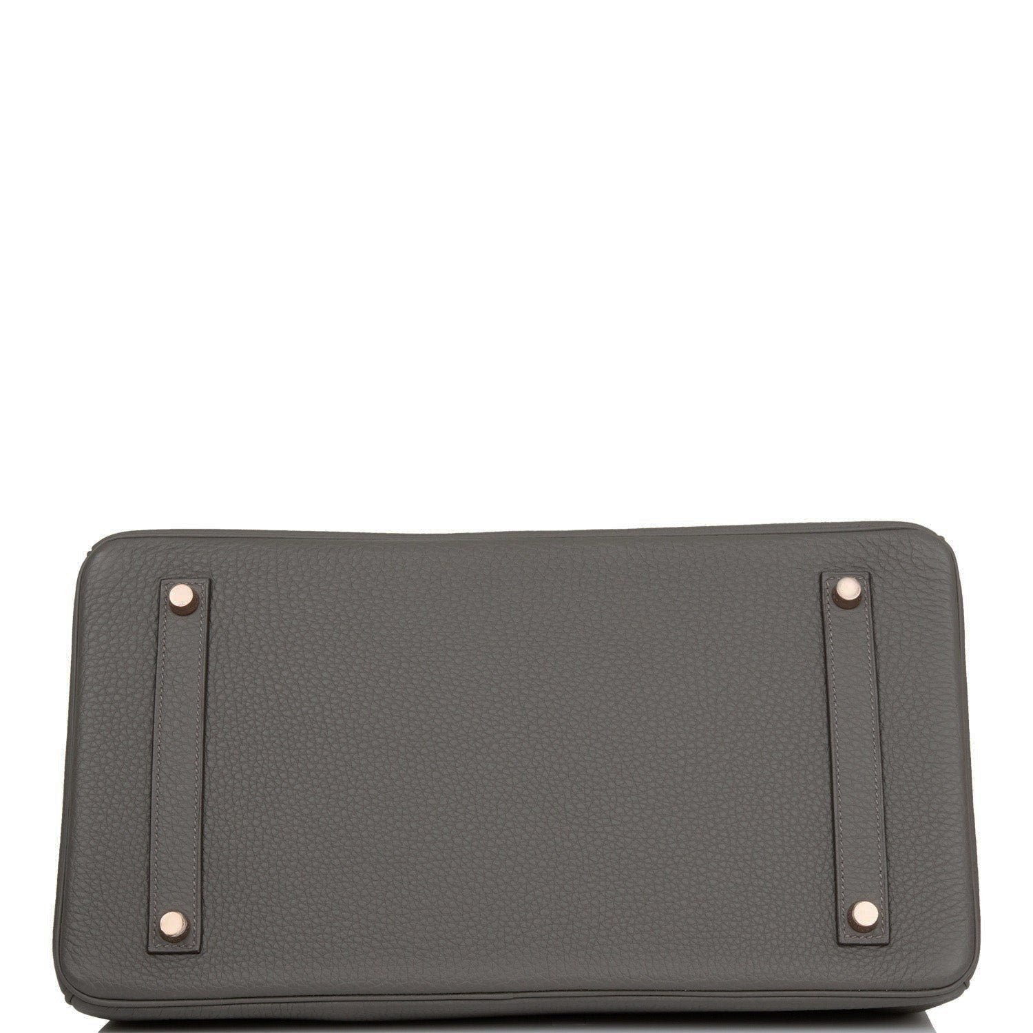This Birkin is in Etain togo leather with rose gold hardware and has tonal stitching, front flap, two straps with center toggle closure, clochette with lock and two keys, and double rolled handles.