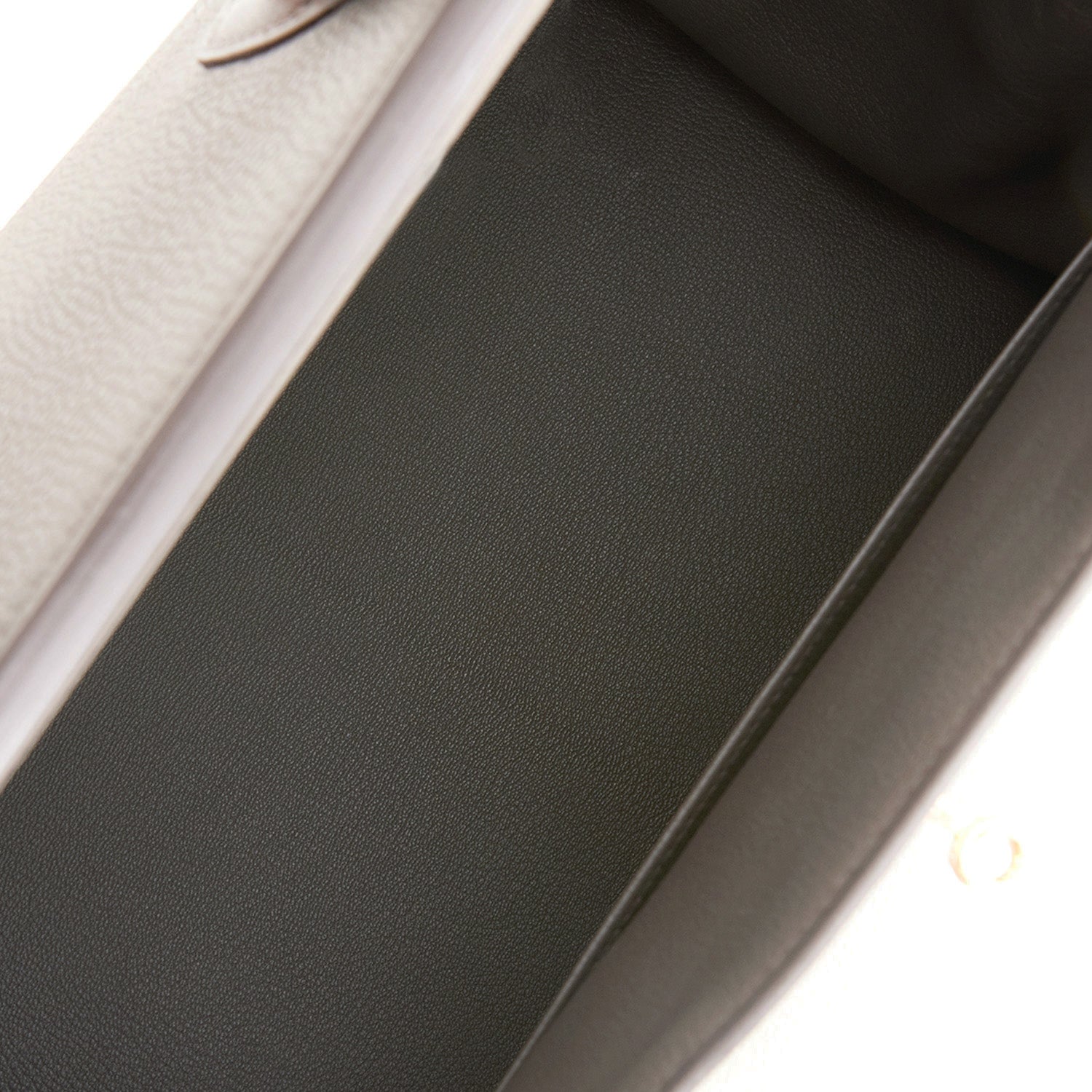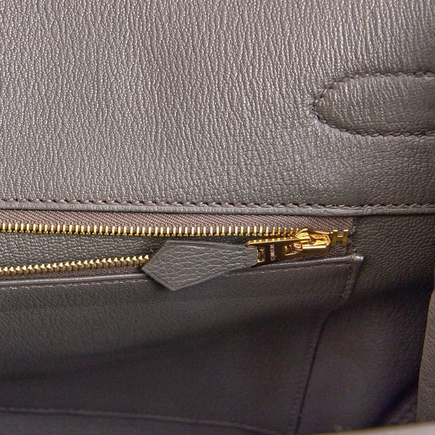 The interior is lined with Etain chevre and has one zip pocket with an Hermes engraved zipper pull and an open pocket on the opposite side.