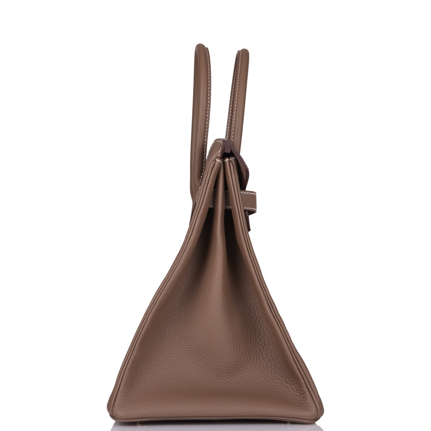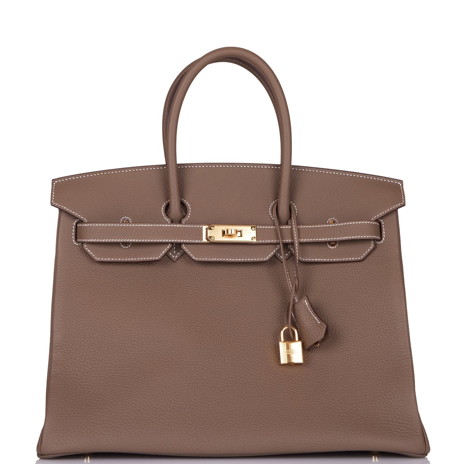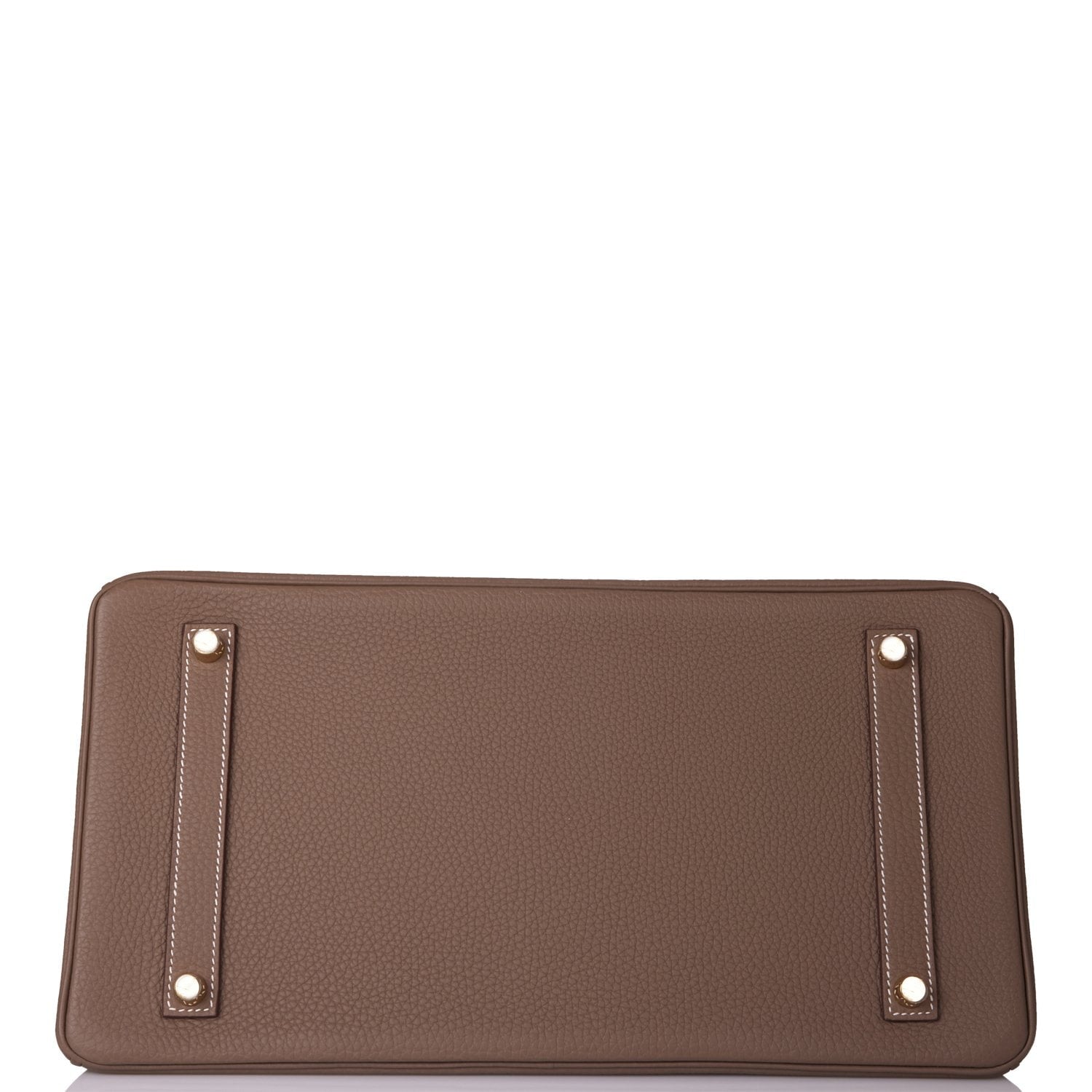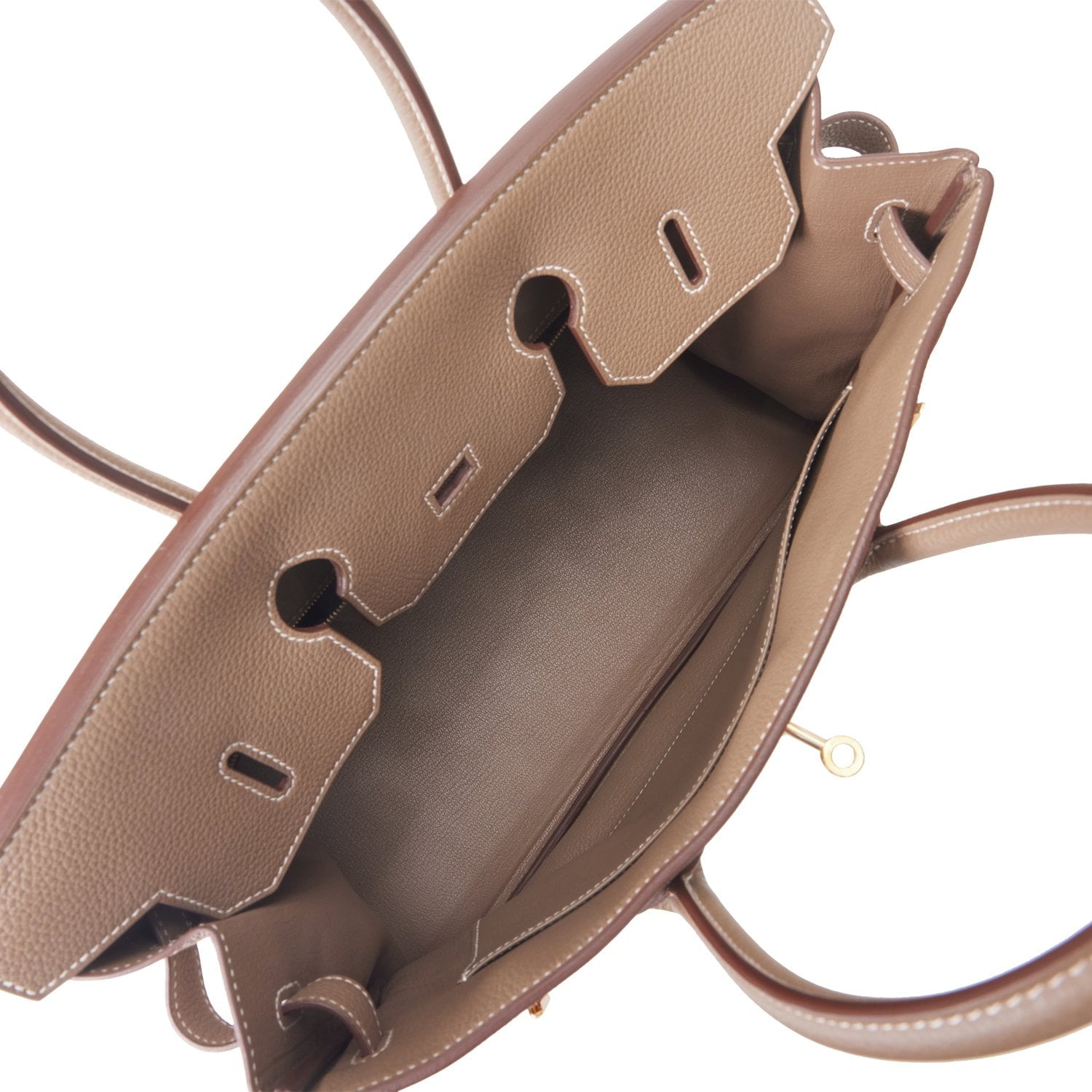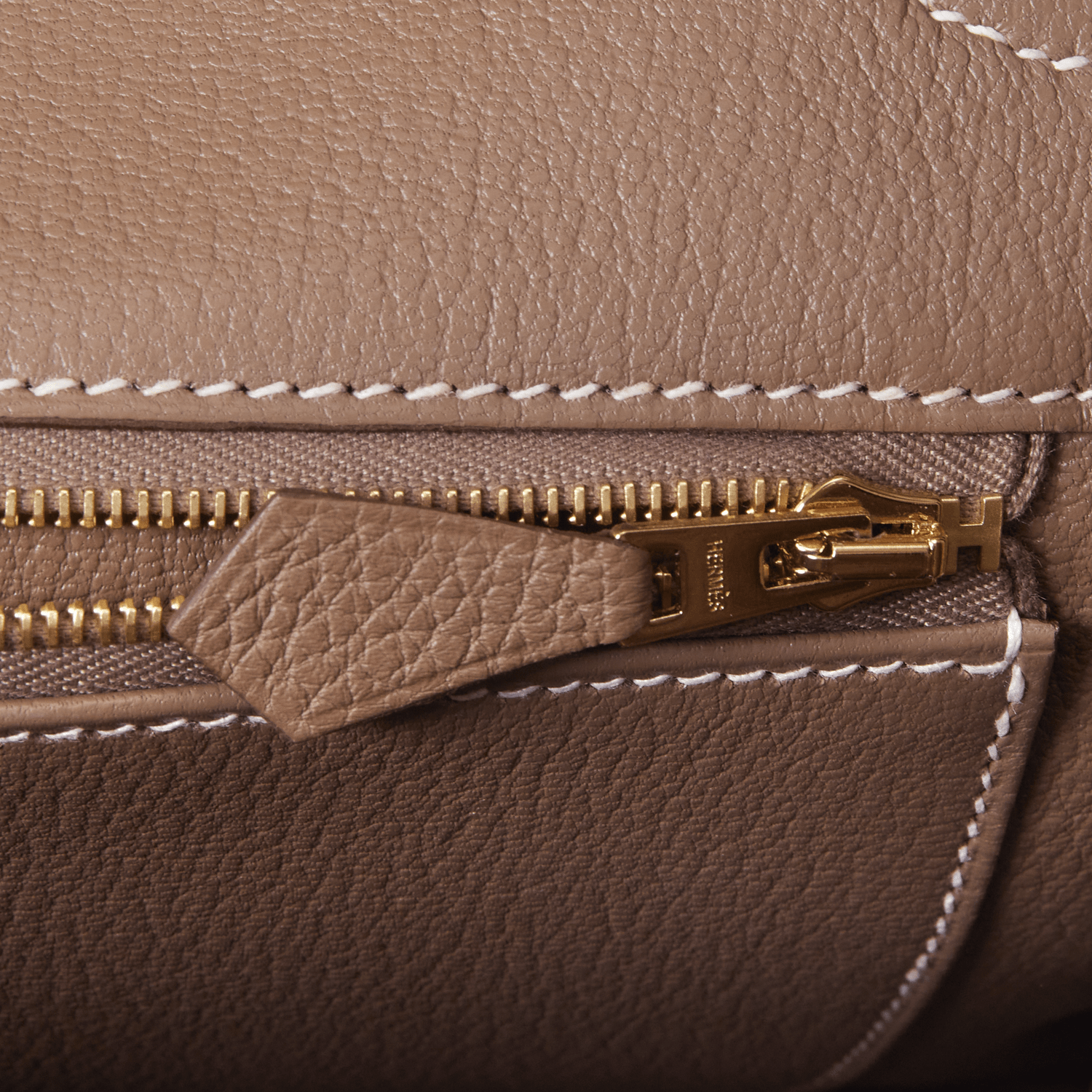 This Birkin is in Etoupe togo leather with gold hardware and has contrast stitching, front flap, two straps with center toggle closure, clochette with lock and two keys, and double rolled handles.