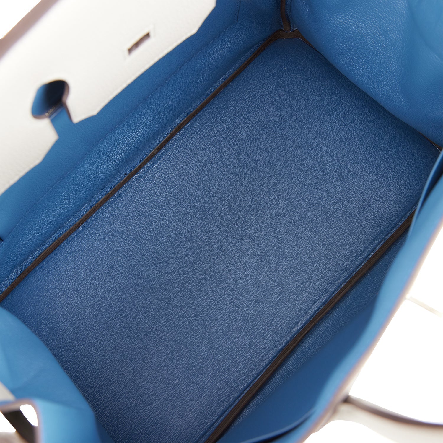 The interior is lined with Bleu Agate chevre and has one zip pocket with an Hermes engraved zipper pull and an open pocket on the opposite side.