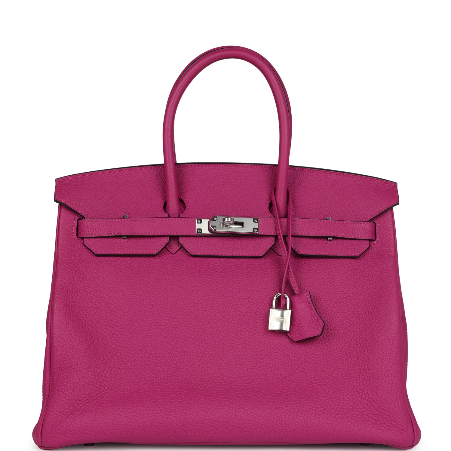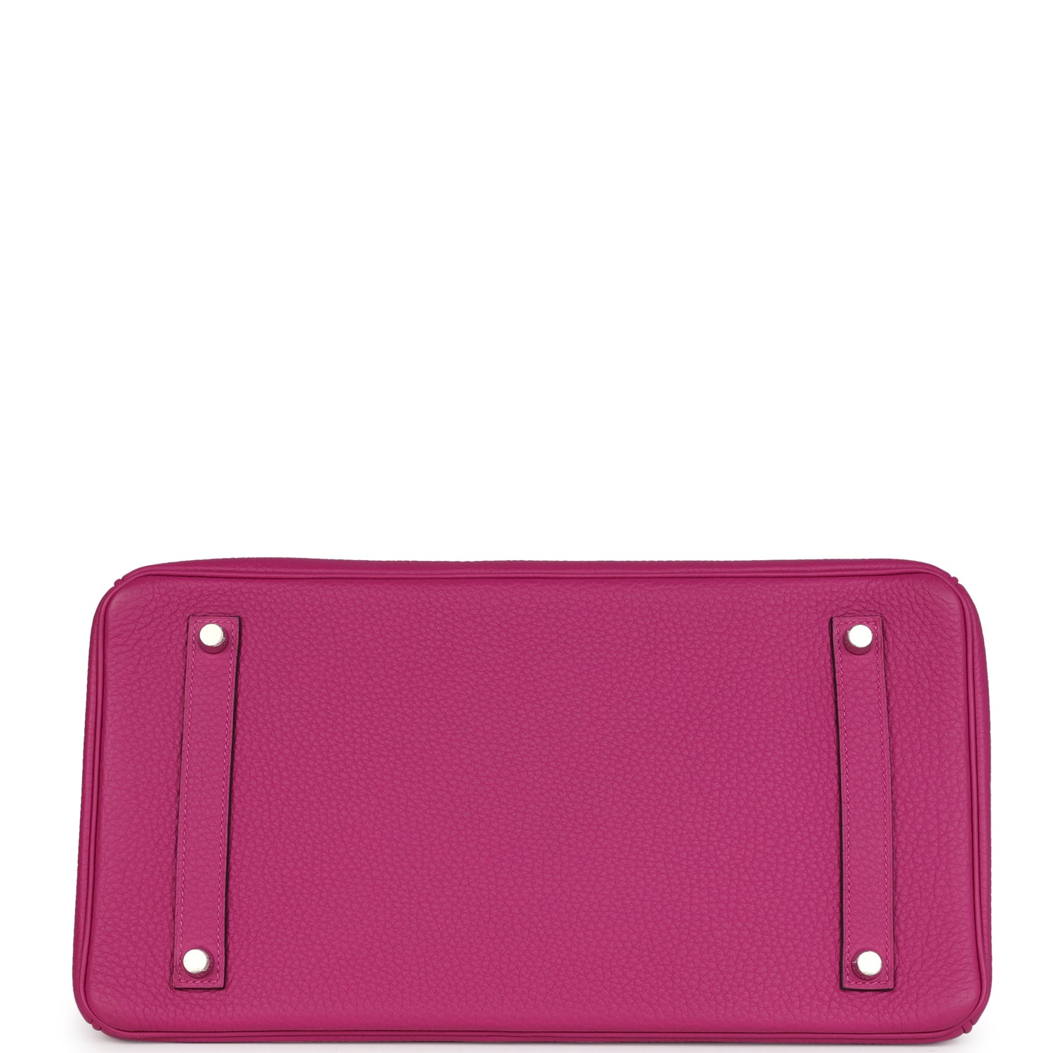 Birkin is in Rose Pourpre togo leather with palladium hardware and has tonal stitching, front flap, two straps with center toggle closure, clochette with lock and two keys, and double rolled handles.