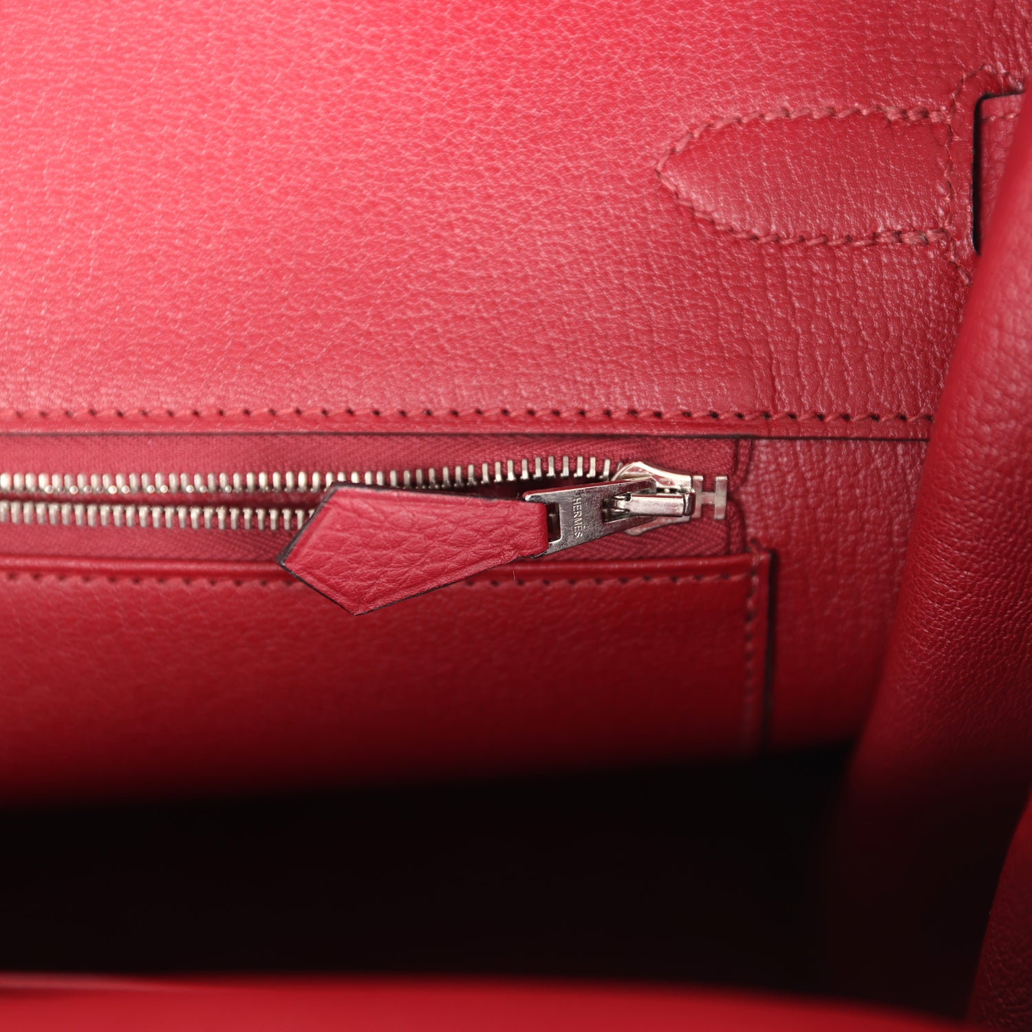The interior is lined with Rouge Grenat chevre and has one zip pocket with an Hermes engraved zipper pull and an open pocket on the opposite side.