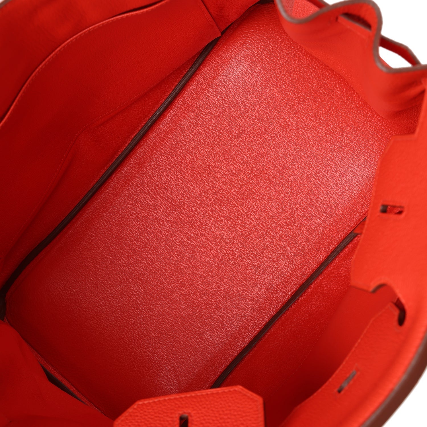 This Birkin is in Rouge Tomate togo leather with palladium hardware and has tonal stitching, front flap, two straps with center toggle closure, clochette with lock and two keys, and double rolled handles.