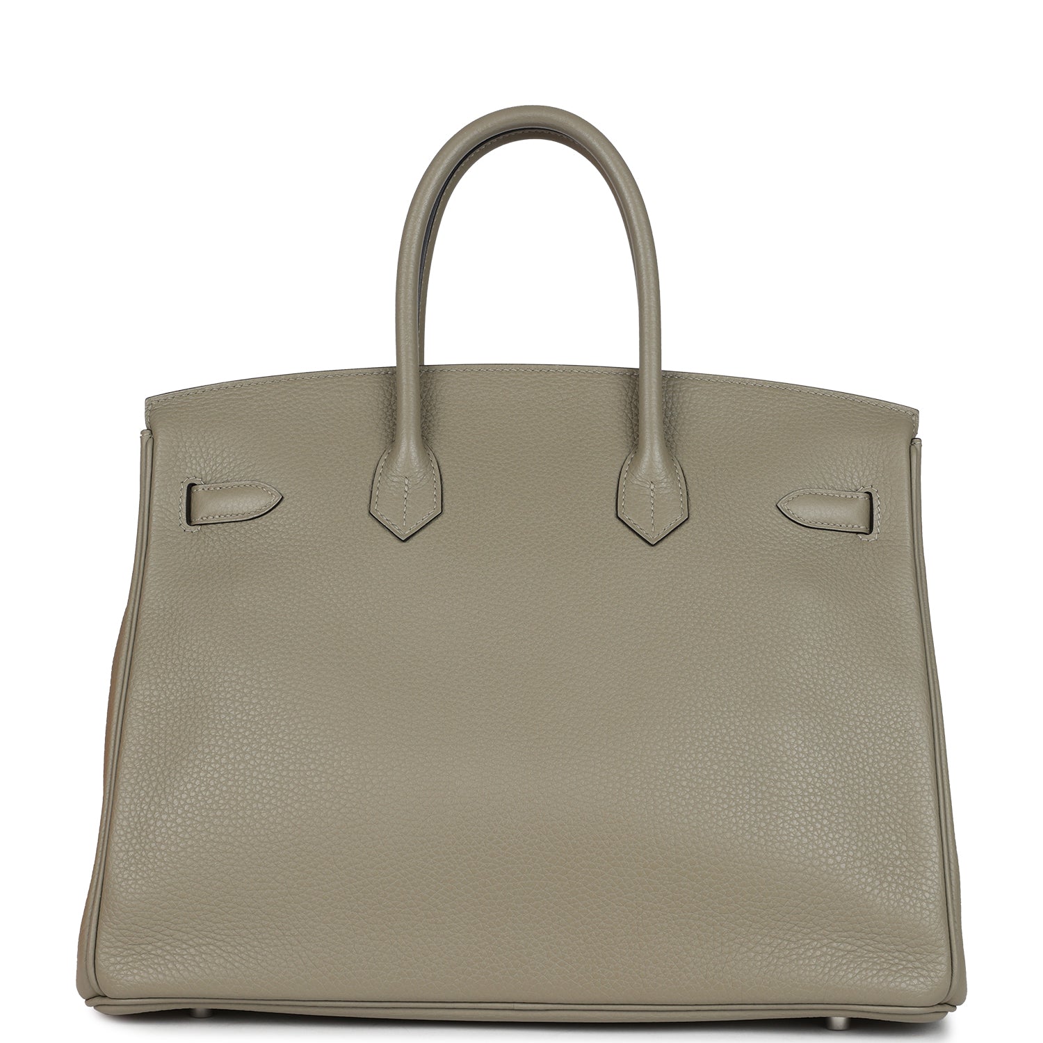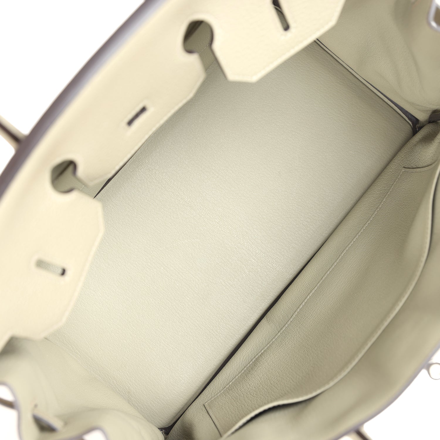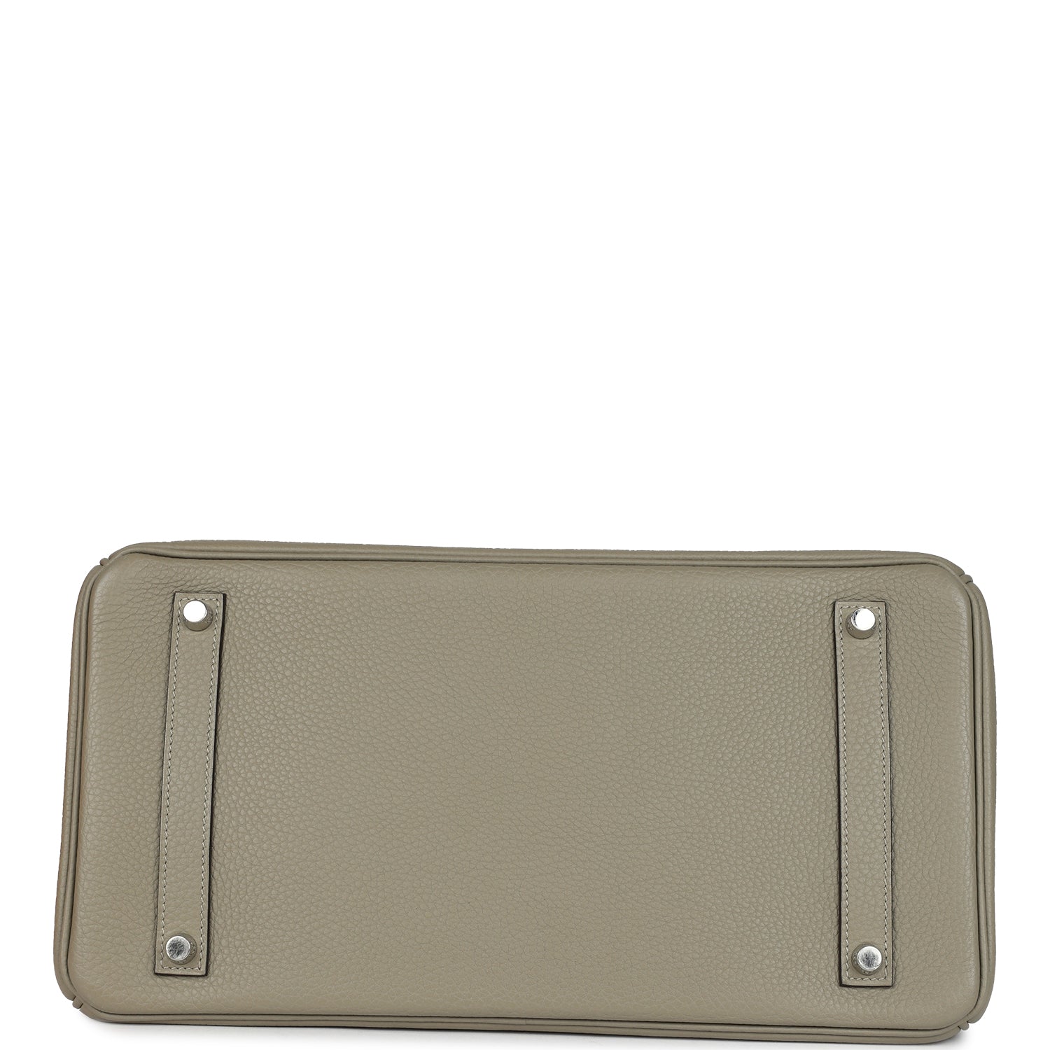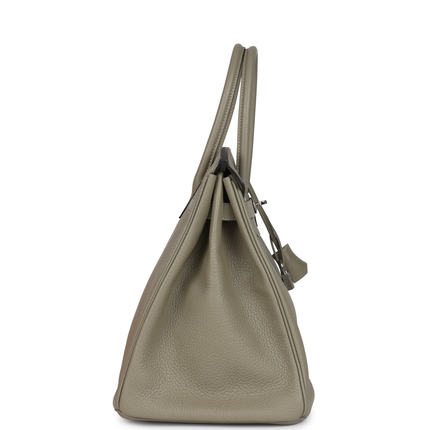 Birkin is in Sauge togo leather with palladium hardware and has tonal stitching, front flap, two straps with center toggle closure, clochette with lock and two keys, and double rolled handles.