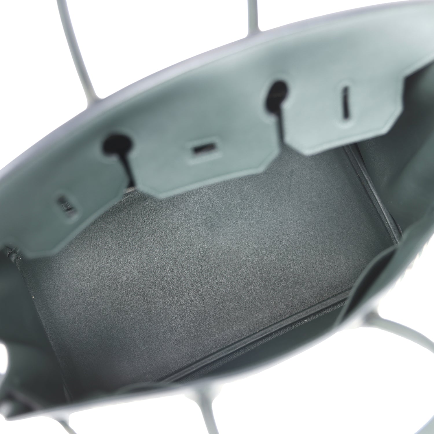 The interior is lined with Vert Anglais chevre leather and has one zip pocket with an Hermes engraved zipper pull and an open pocket on the opposite side.