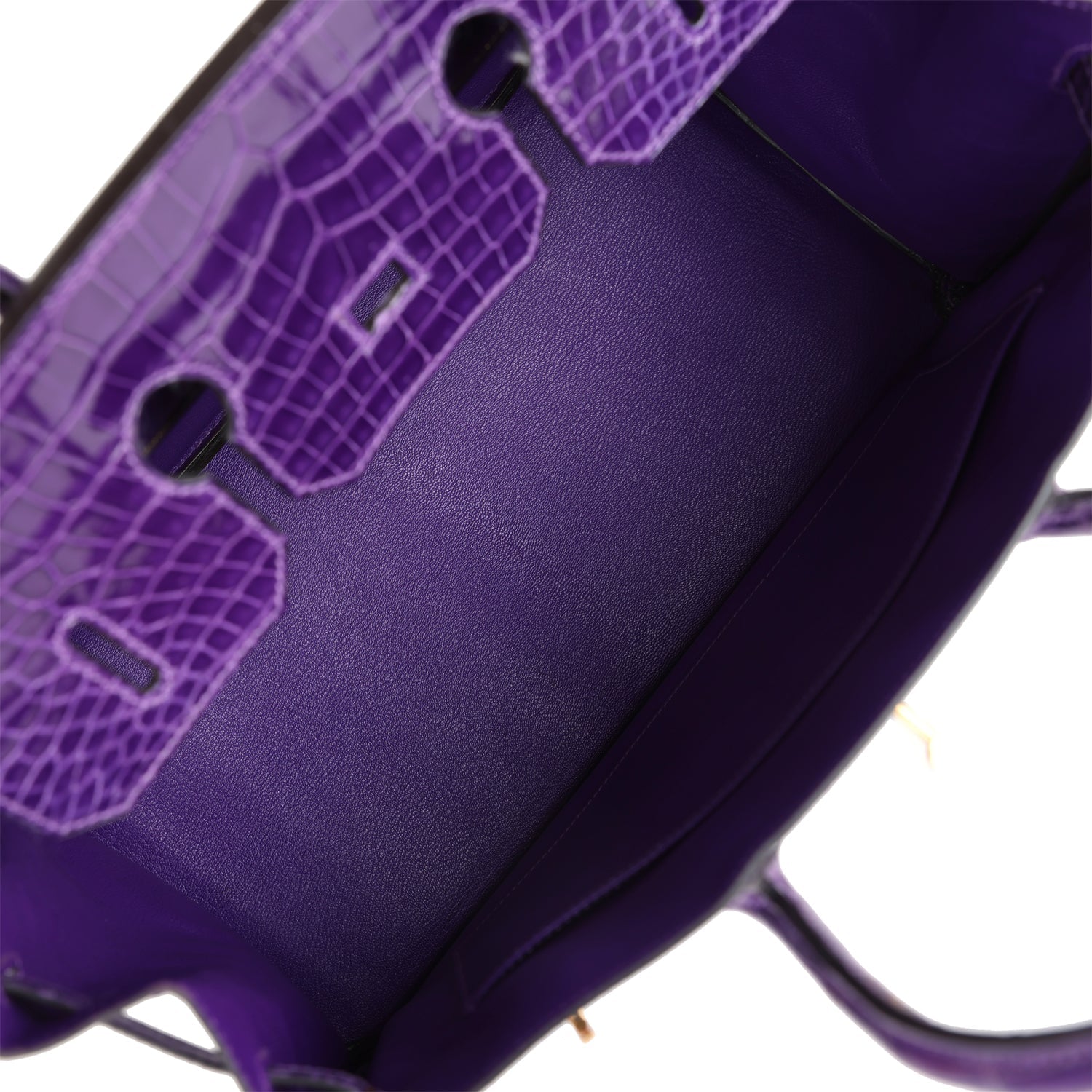 Birkin is of Ultraviolet Shiny Porosus Crocodile leather with gold hardware and features tonal stitching, front flap, two straps with center toggle closure, clochette with lock and two keys, and double rolled handles.