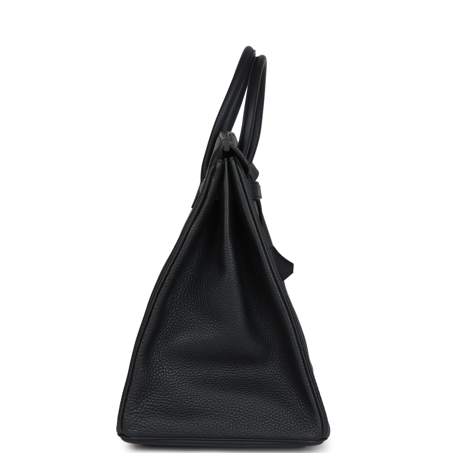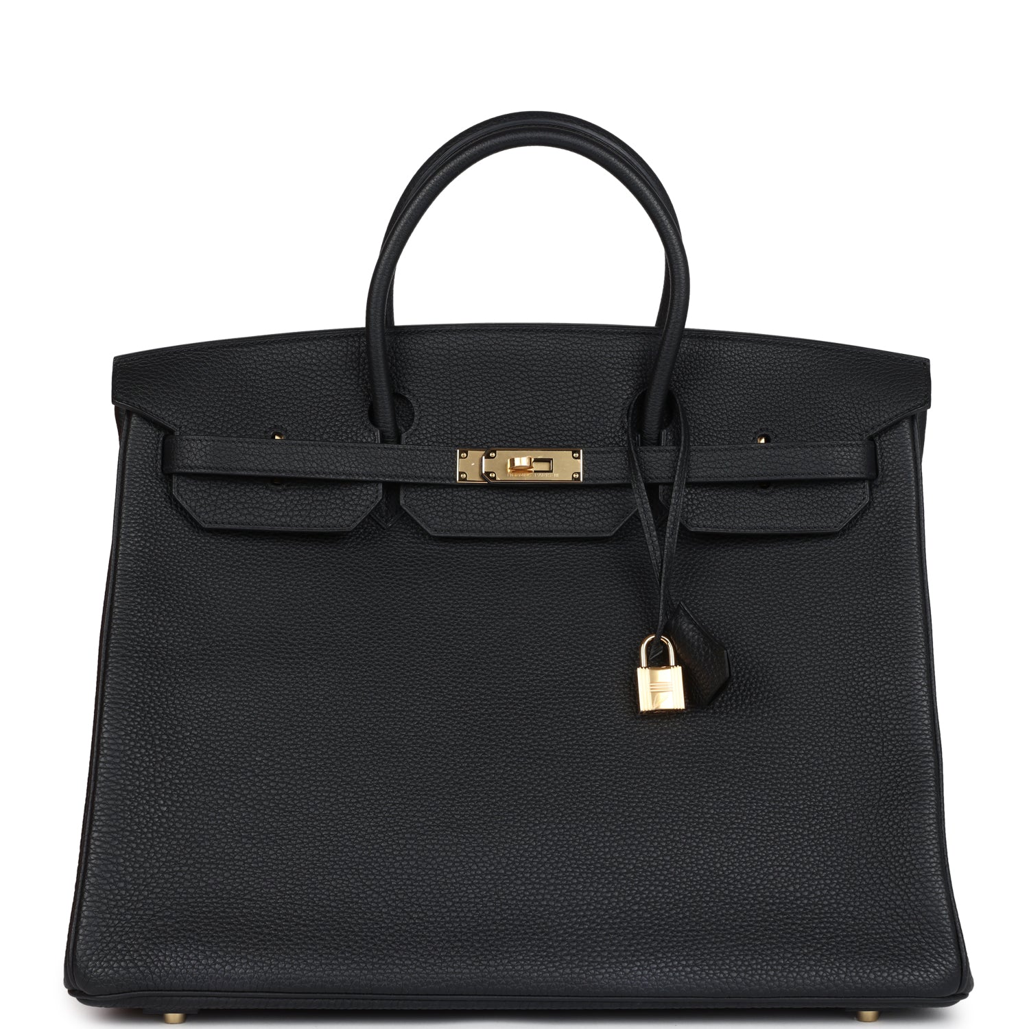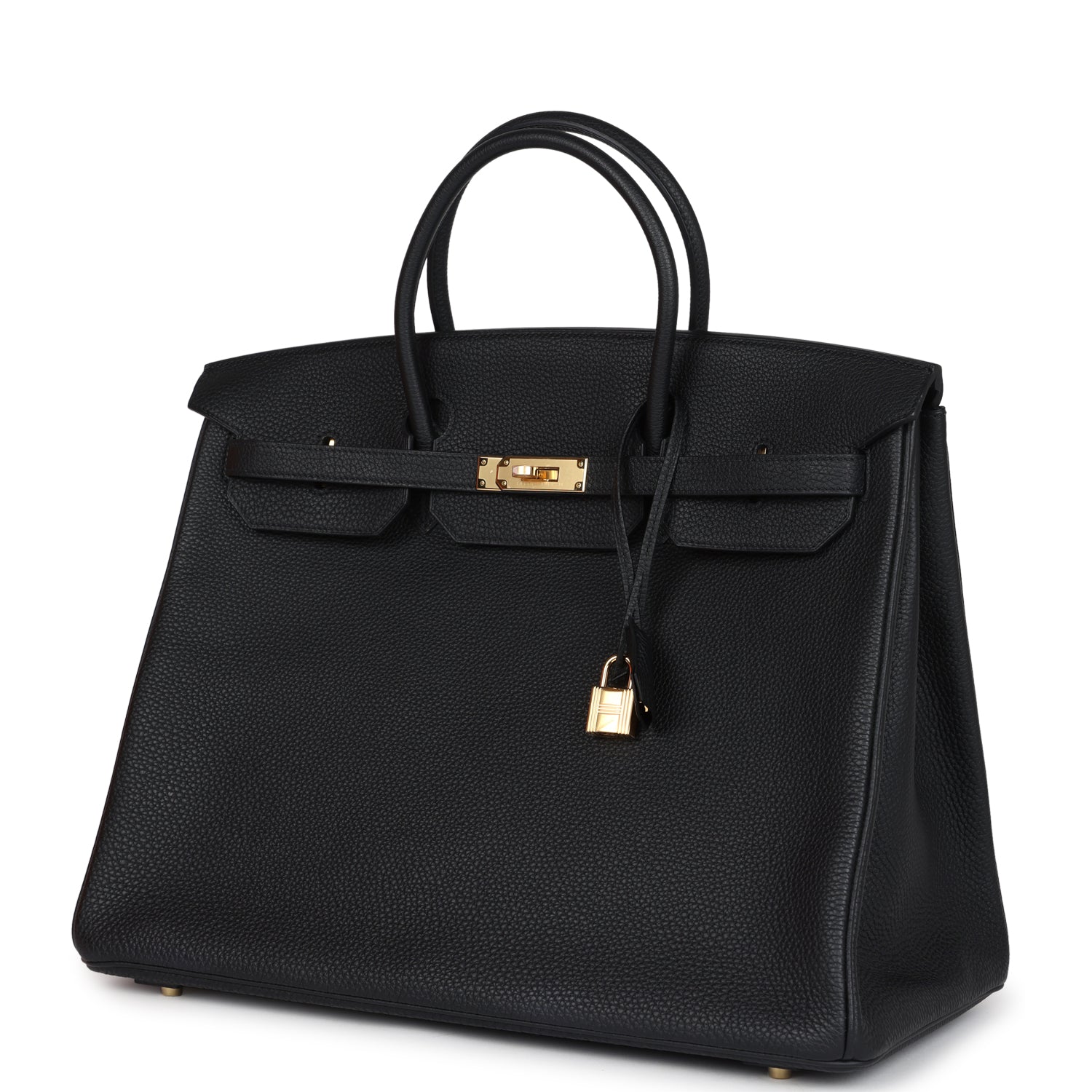 Birkin is in Black togo leather with gold hardware and has tonal stitching, two straps with front toggle closure, clochette with lock and two keys and double rolled handles.