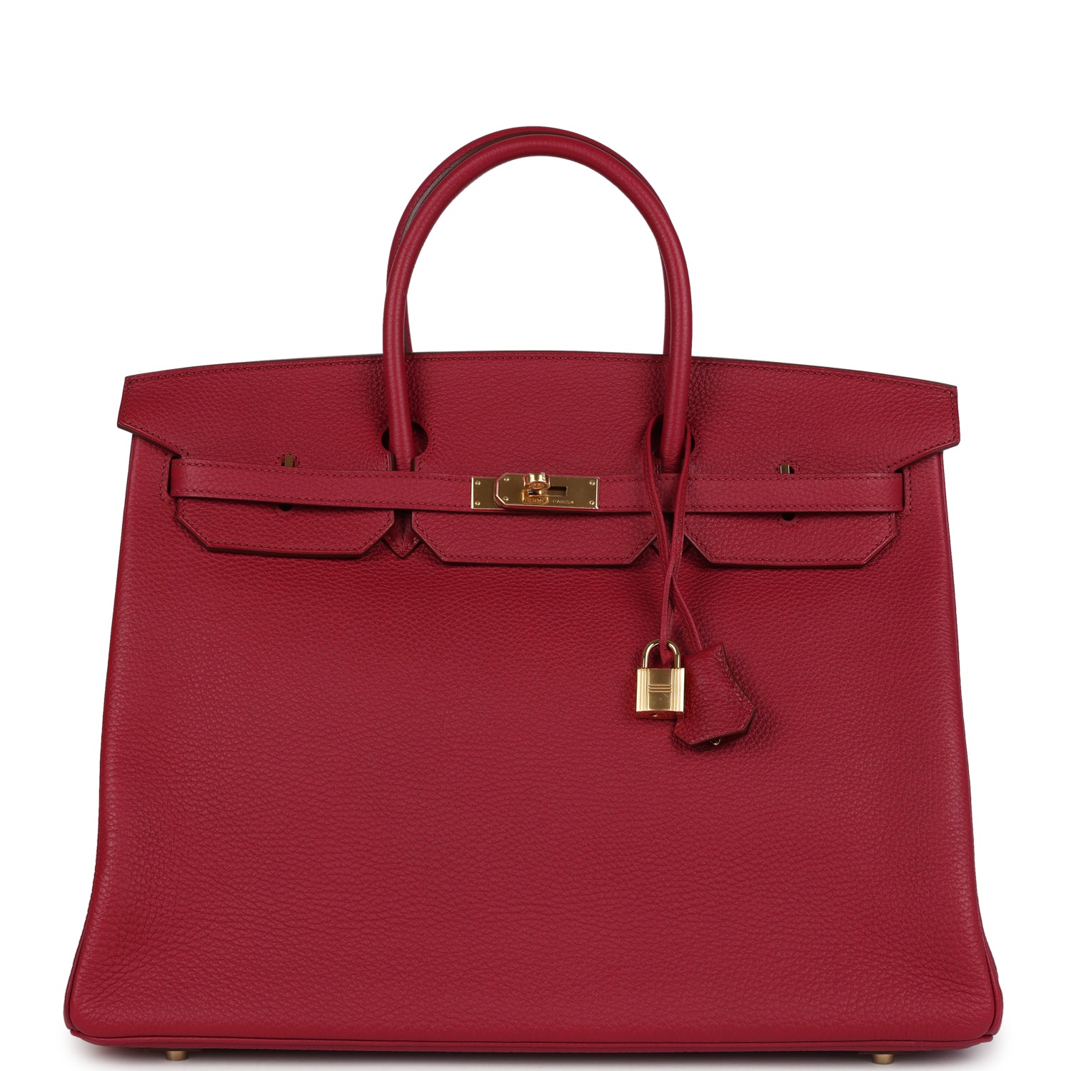 Birkin is in Rubis togo leather with gold hardware and has tonal stitching, two straps with front toggle closure, clochette with lock and two keys and double rolled handles.