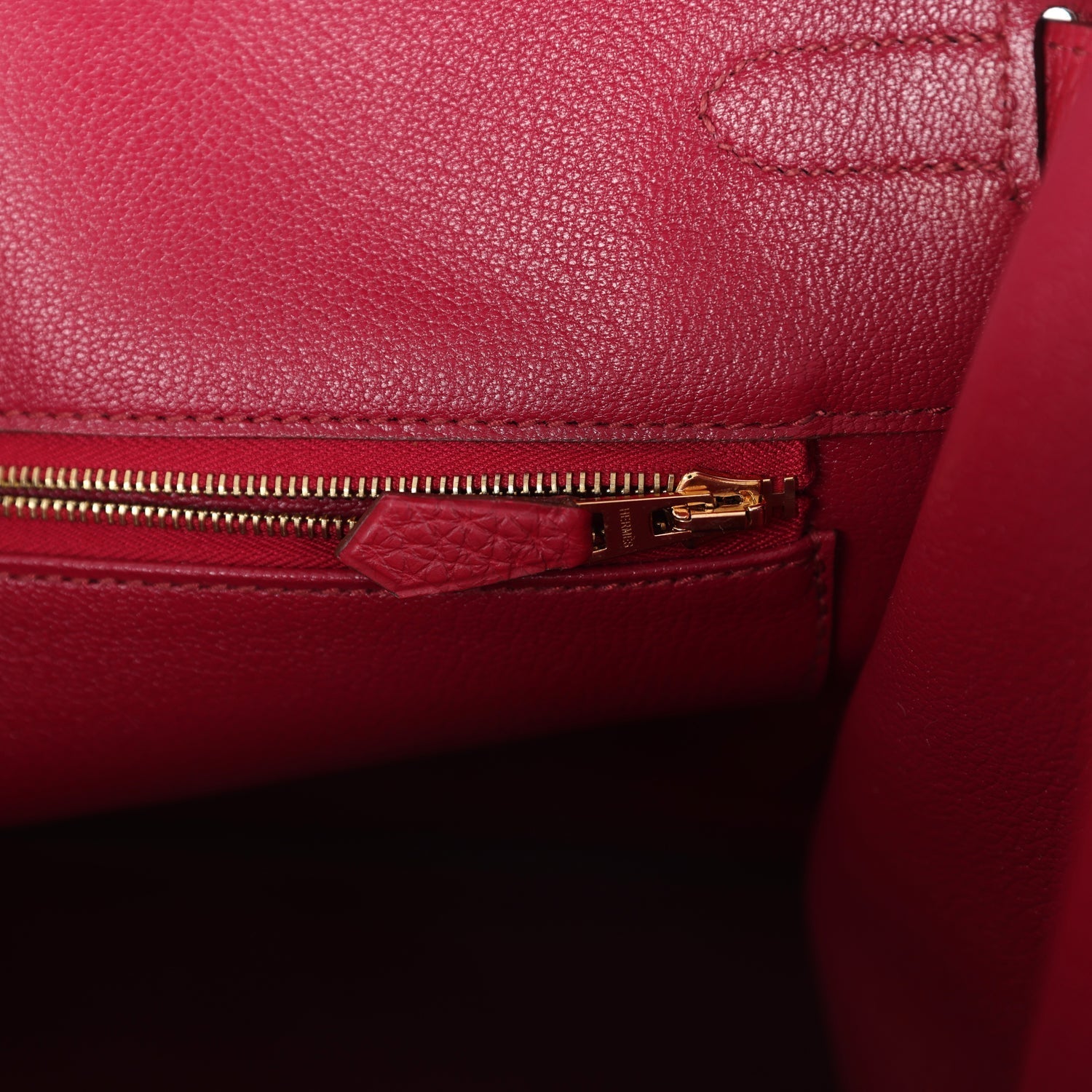 The interior is lined in Rubis chevre with one zip pocket with an Hermes engraved zipper pull and an open pocket on the opposite side.