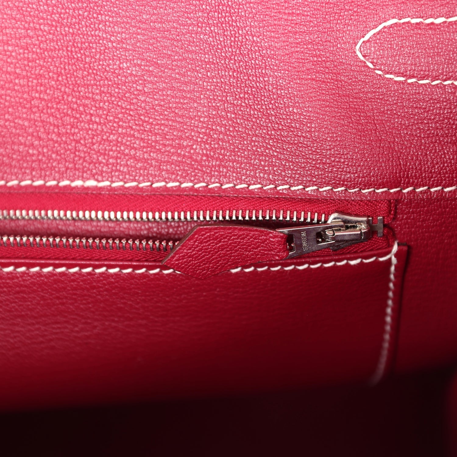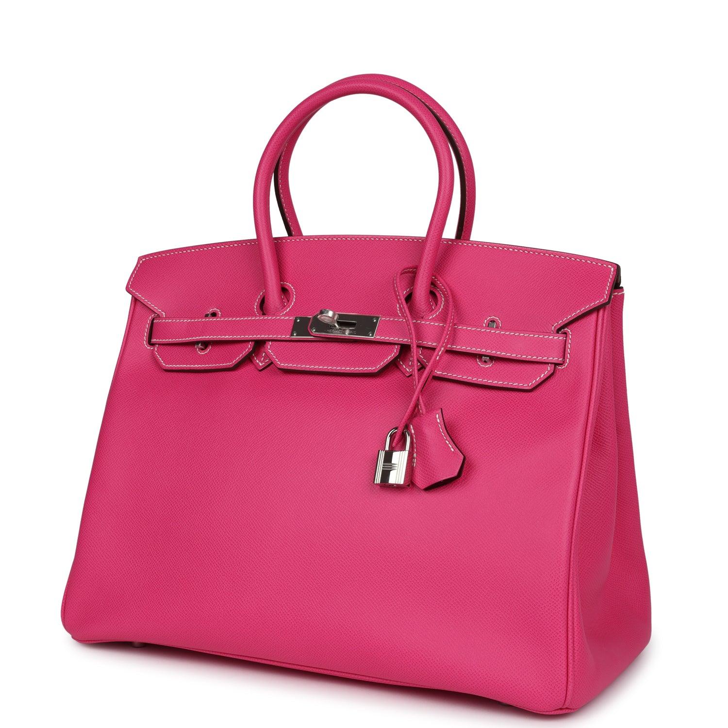 Candy Birkin 35 is in Rose Tyrien epsom leather with palladium hardware and has contrast stitching, front flap with two straps, front toggle closure, clochette with lock and two keys, double rolled handles.