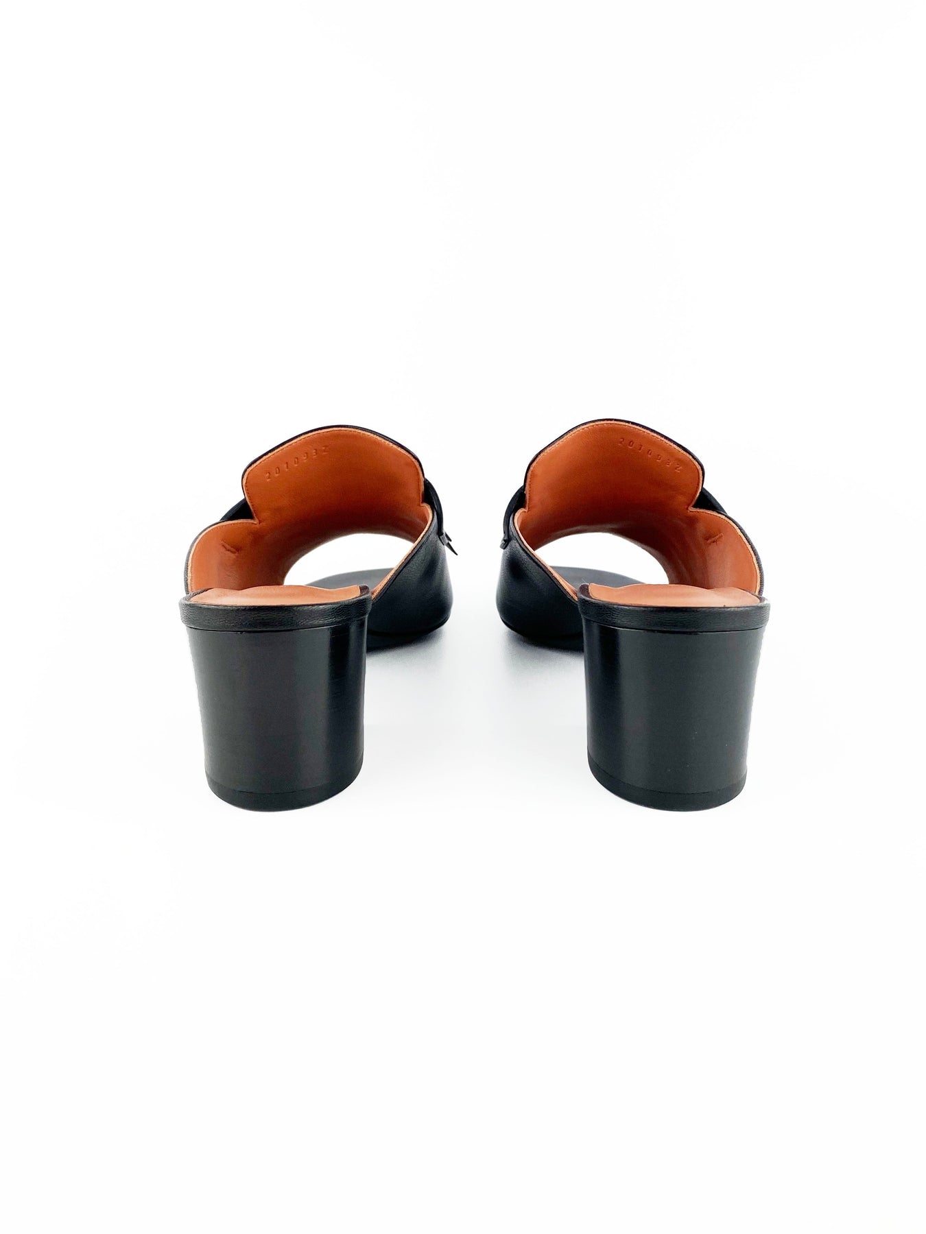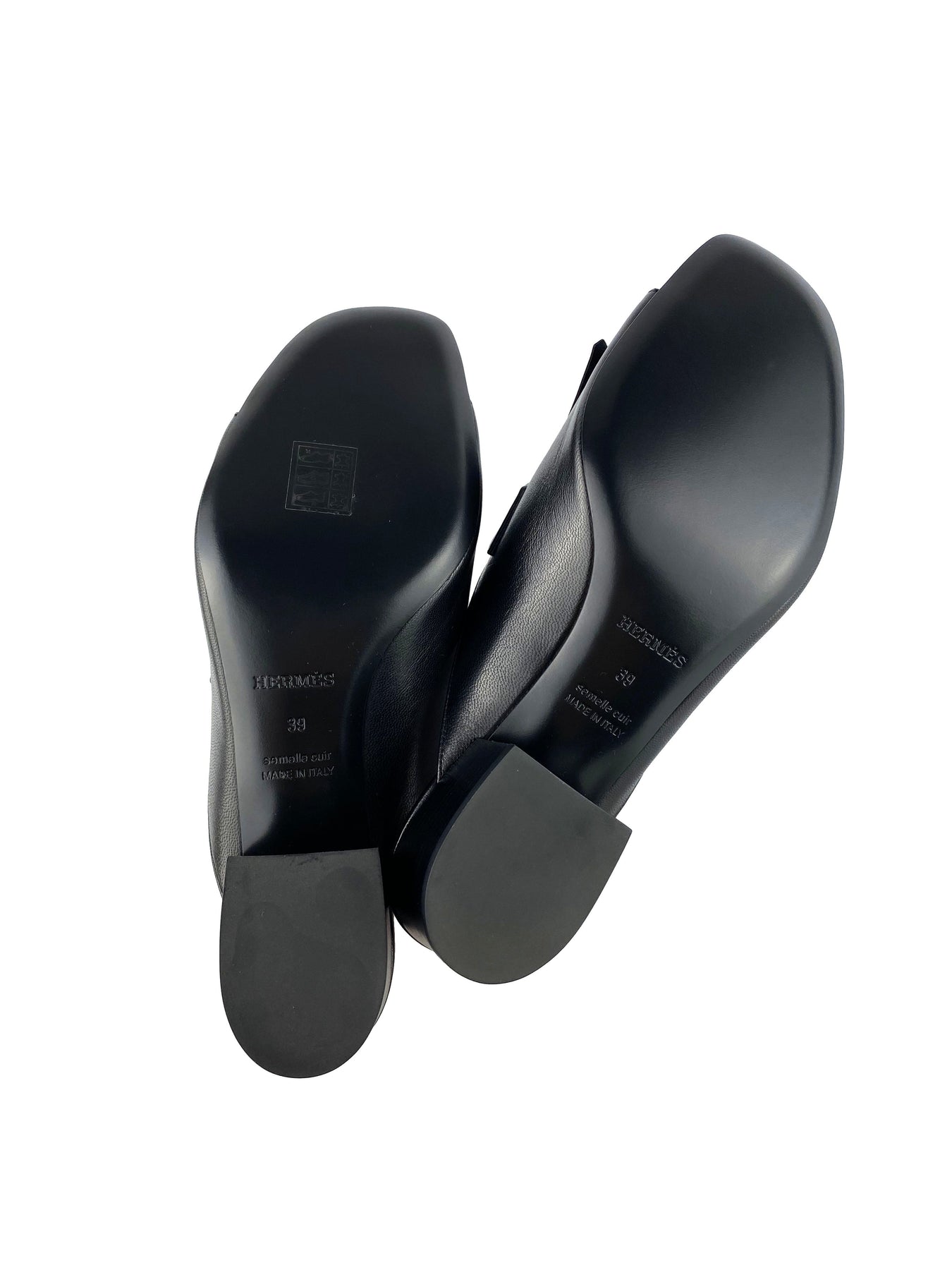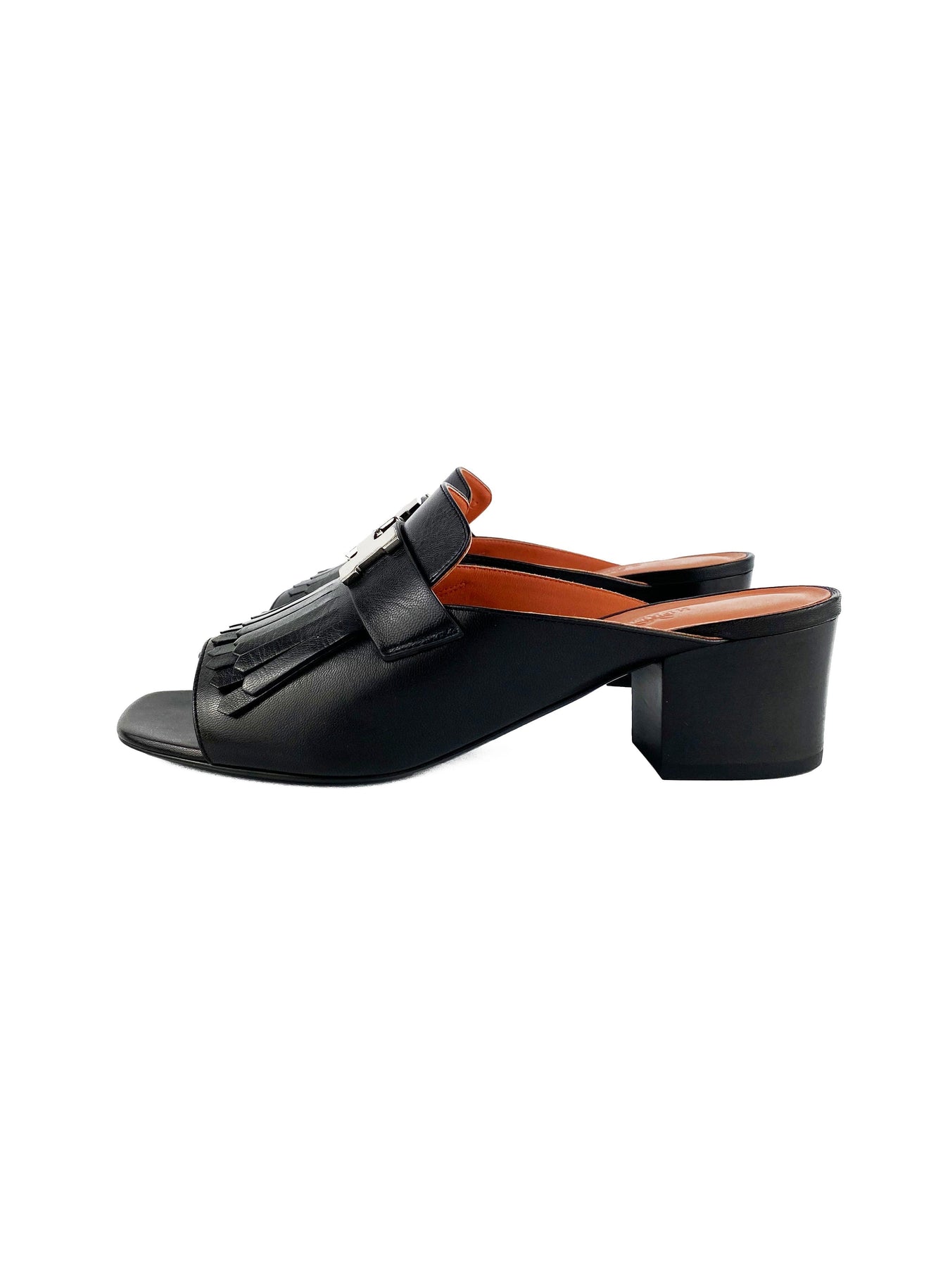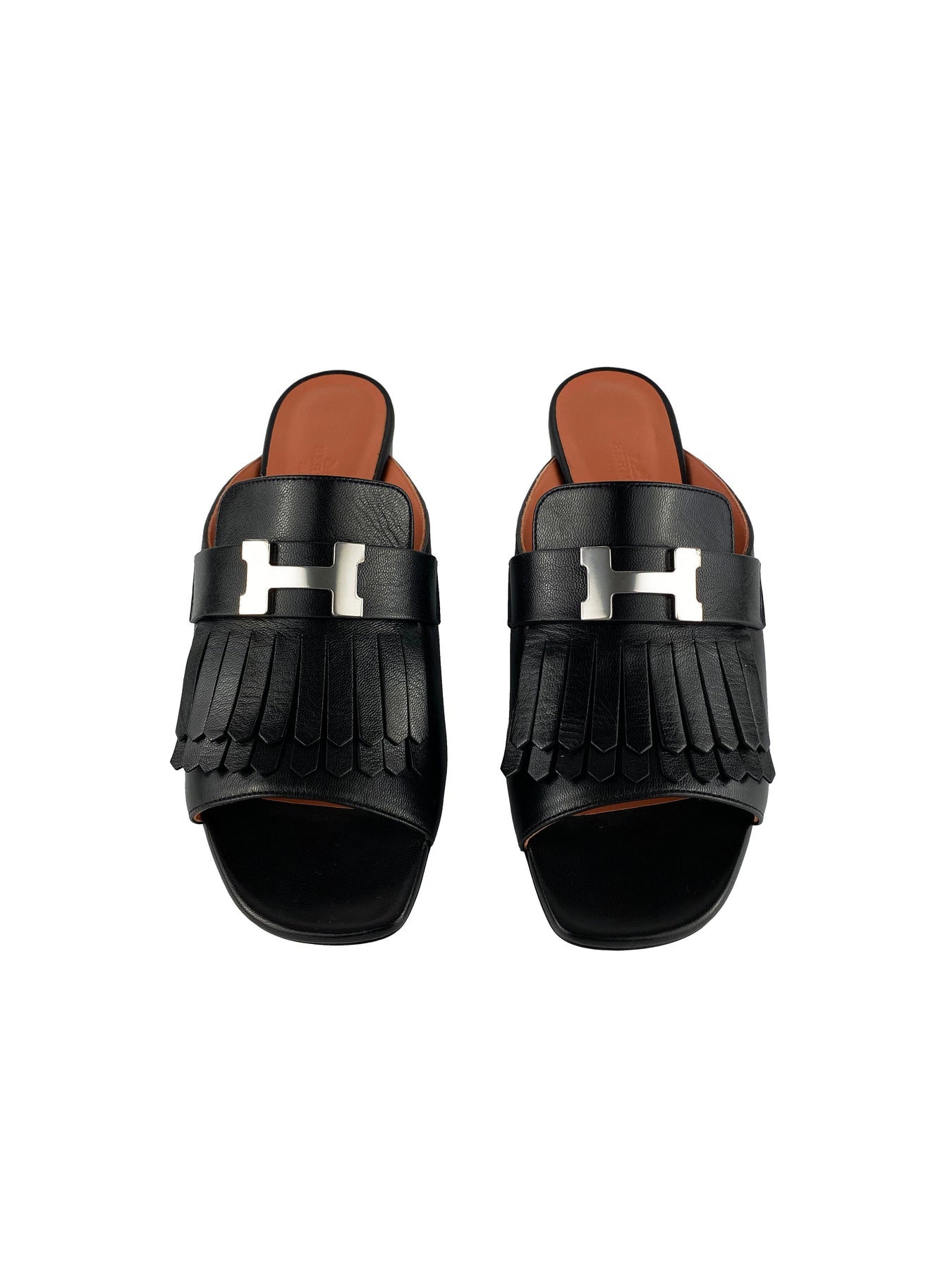Description : Gorgeous Hermes black heeled mules with fringe detail and silver 'H' logo in pristine condition; brand new.