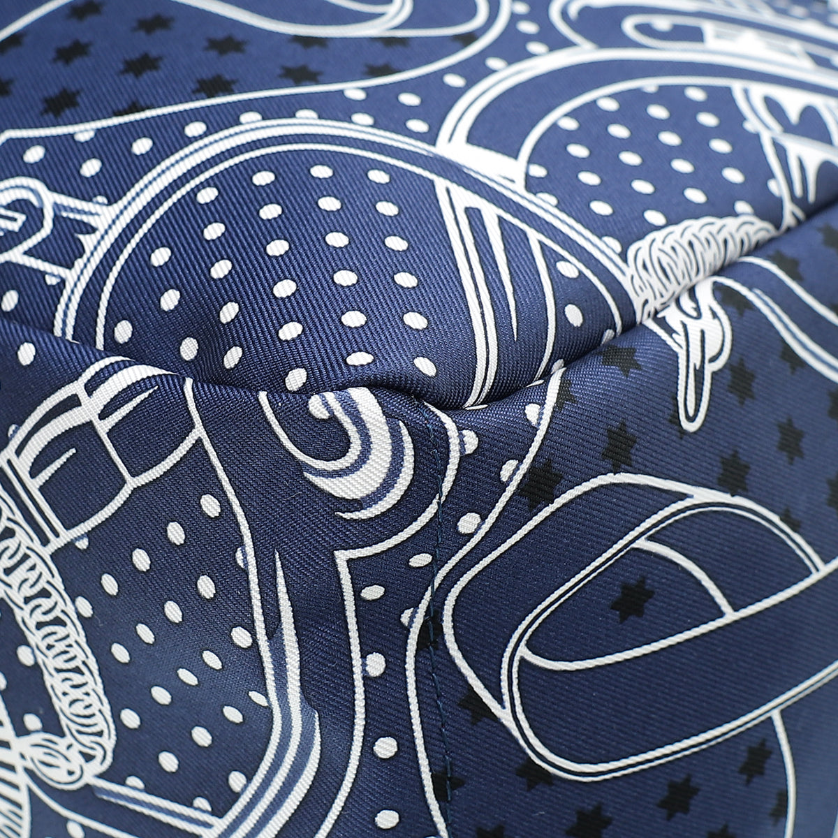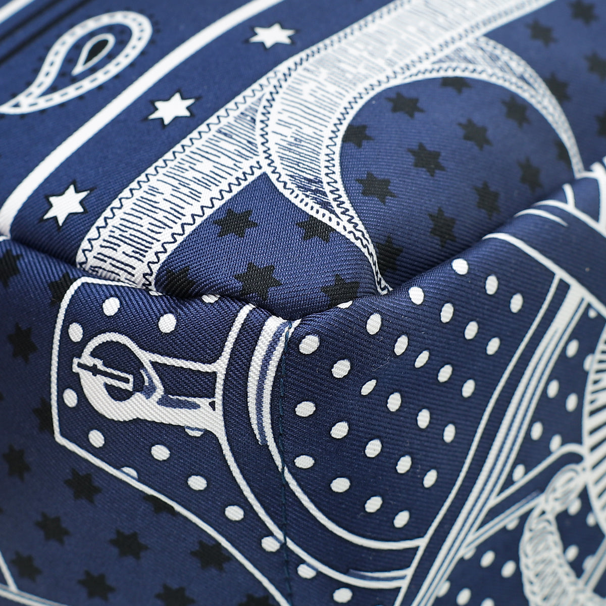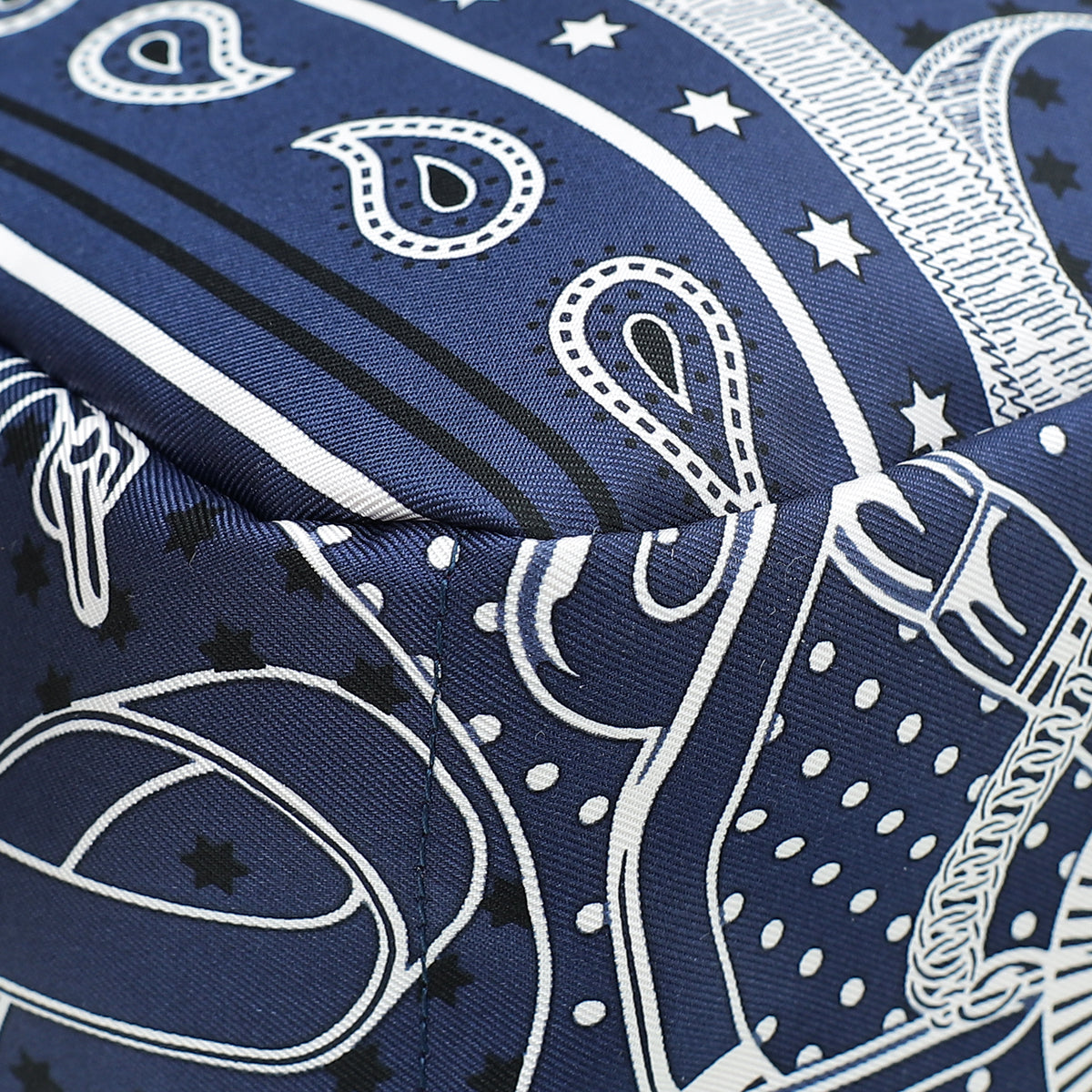 • Material: Bleu Nuit "Eperons d'Or" Printed Silk with Barenia Calfskin Leather Trim