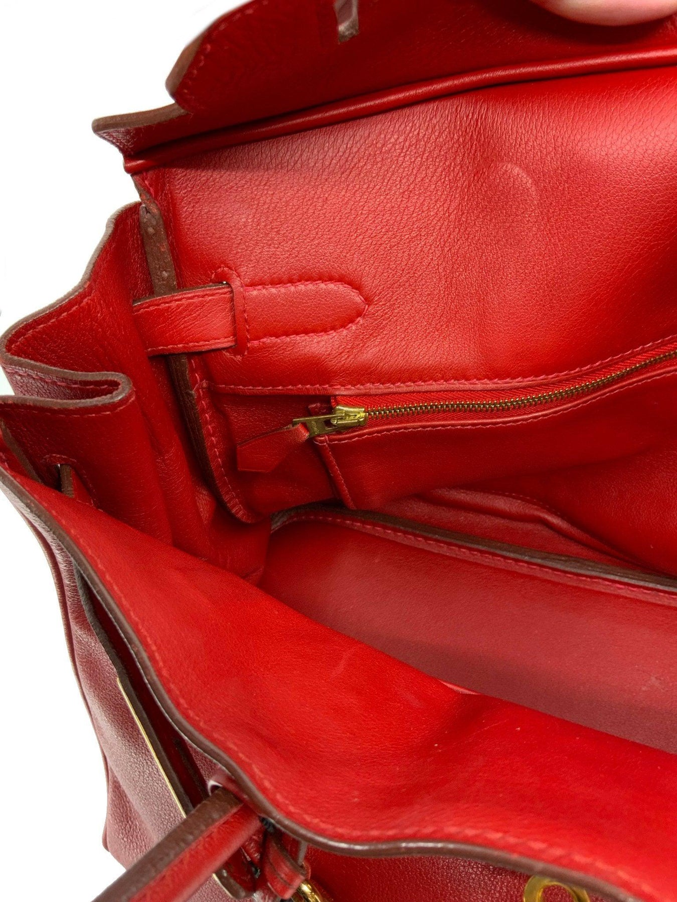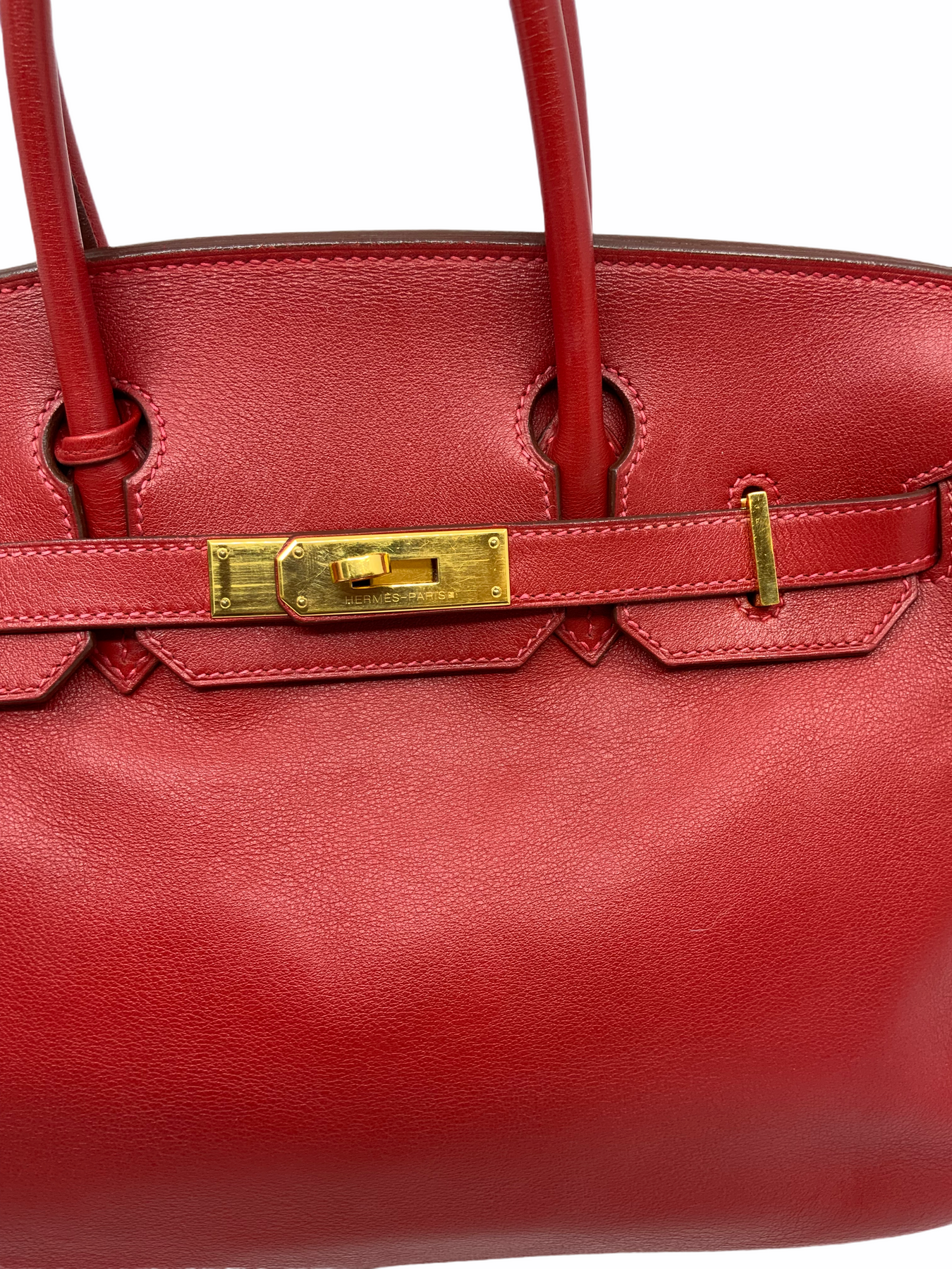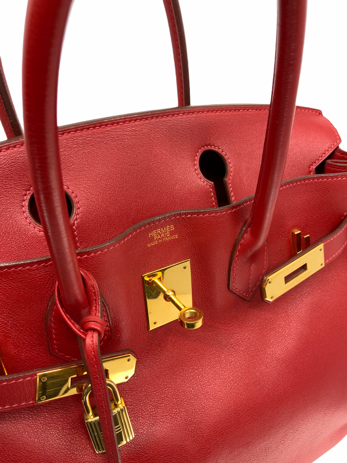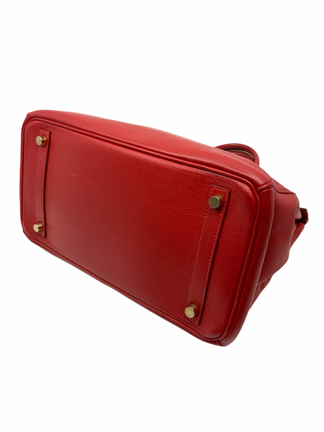 We the ity of this Hermes Calfskin Leather Birkin 30 Bag, crafted in red leather. This highly sought-after and nearly impossible to find collectors piece takes 18 hours to construct by a single highly skilled trained craftsman. This bag is an investment piece, meaning it will either hold or go up in value over time. This timeless handbag features gold-tone hardware, including protective metal feet and rolled leather top handles. The frontal flap is secured with a turn-lock closure that opens to a matching leather interior lining with zipper and patch pockets.