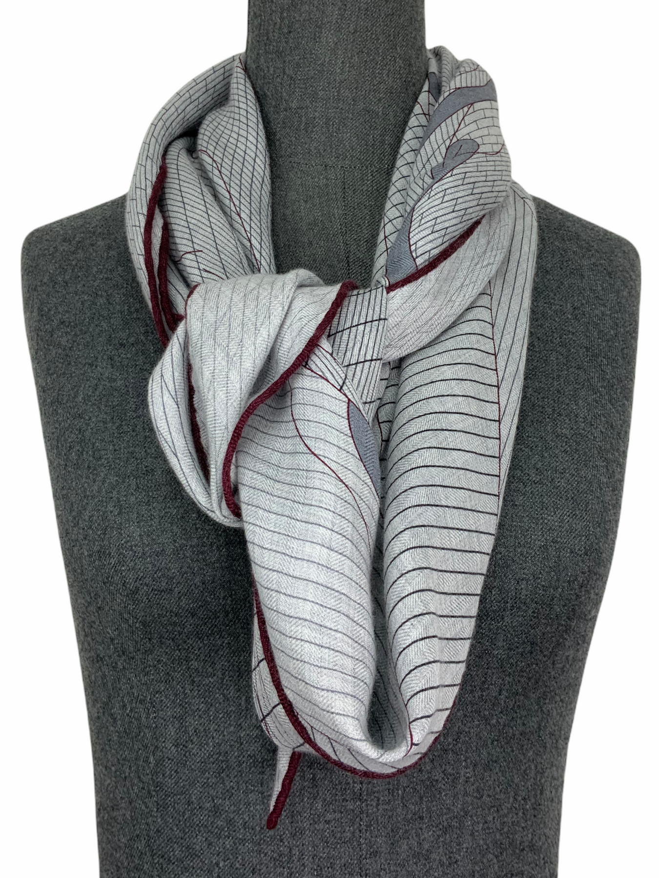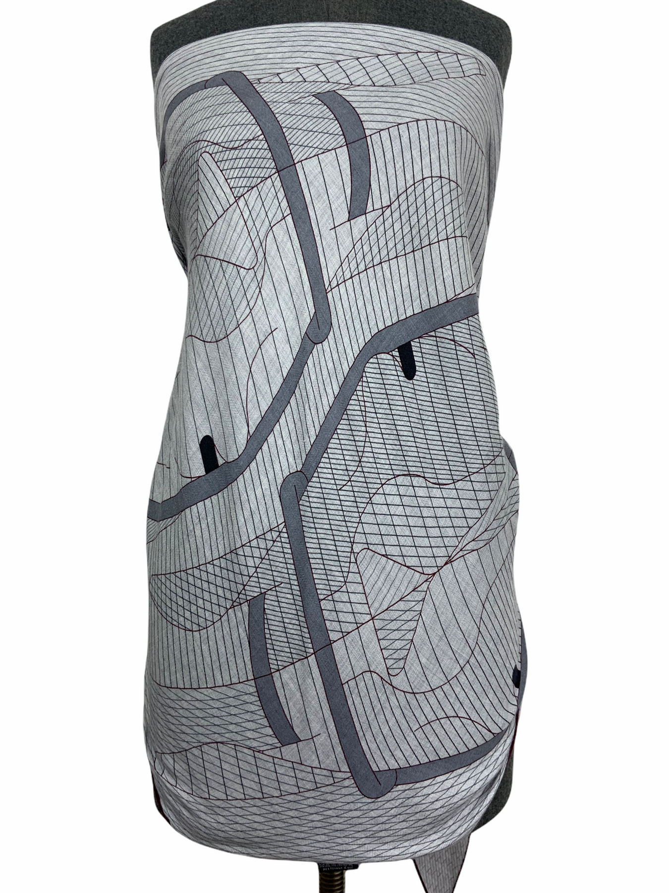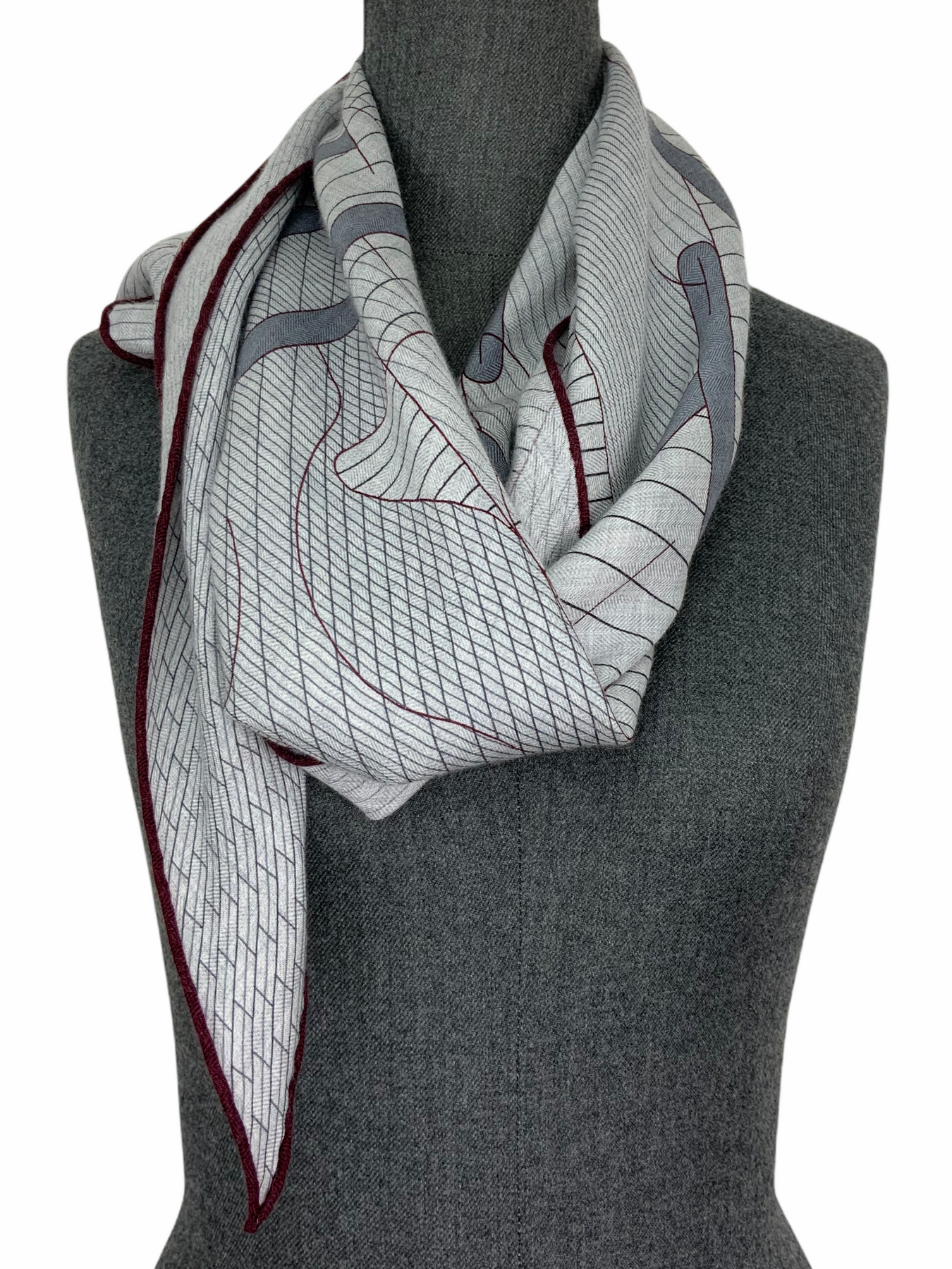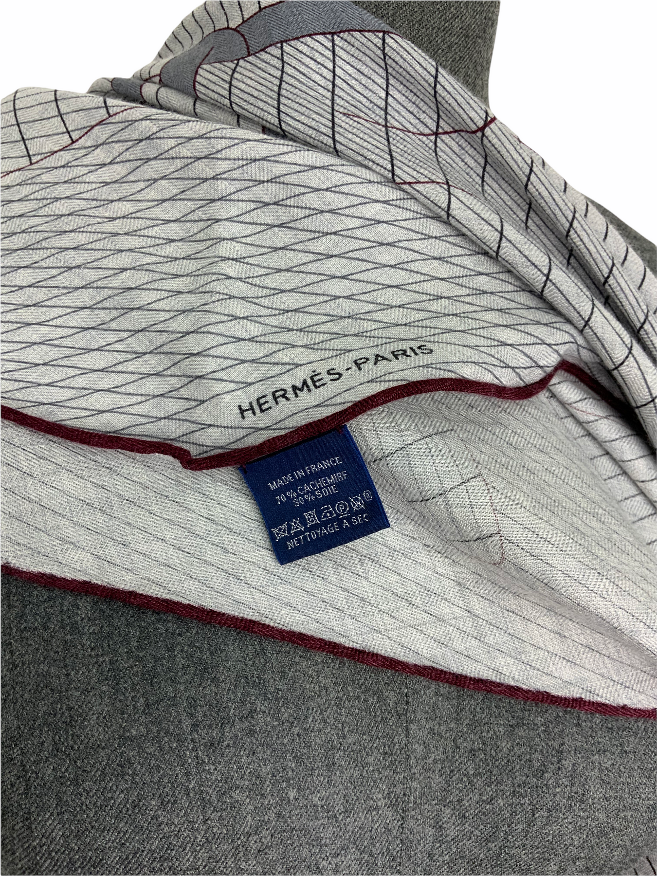 We the ity of this Hermes Cashmere Silk Shawl Scarf 140. Featuring a beautiful geometric, abstract design in light gray, charcoal and burgundy with with hand-rolled edges.