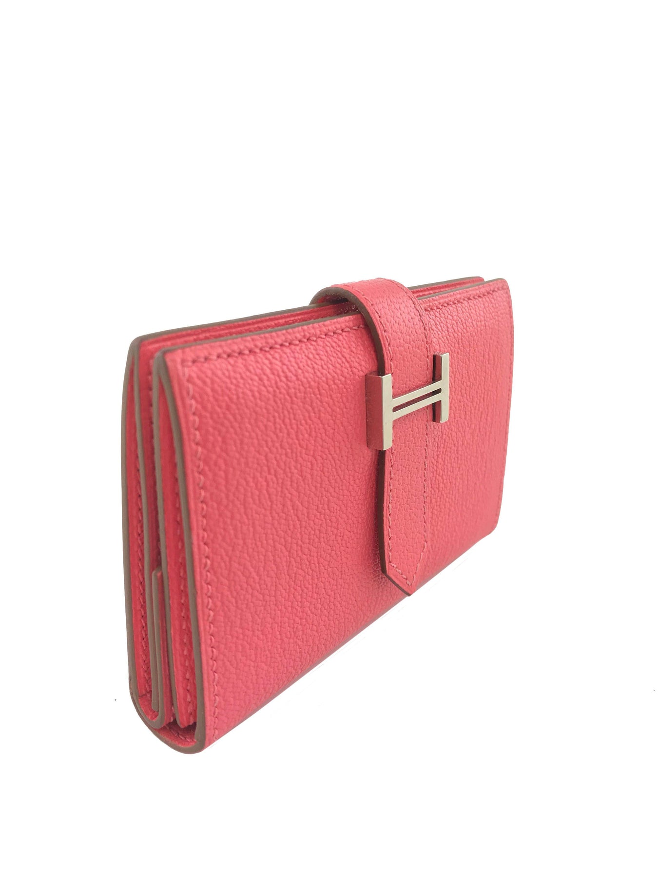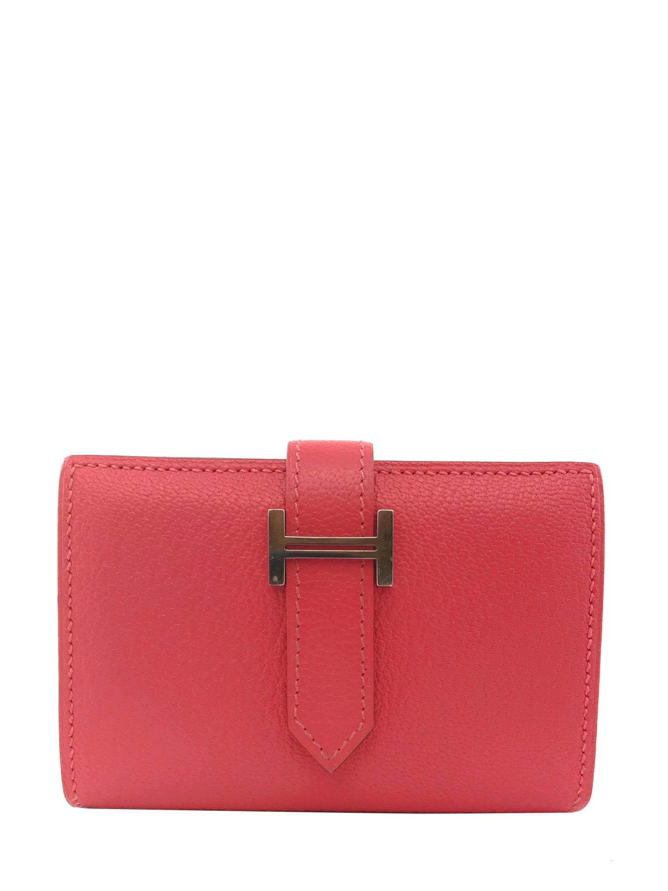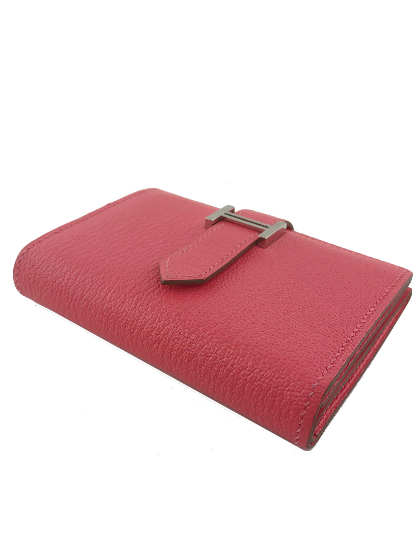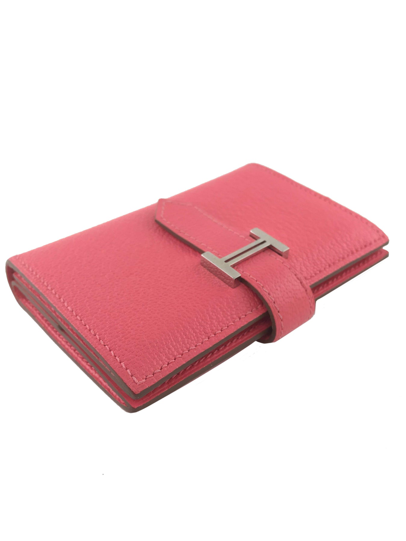 Add to your collection this Hermes Chevre Mini Compact Bearn Card Holder Wallet crafted from rose jaipur goatskin leather with a signature 'H' strap closure. Shop designer accessories by Hermes at Consigned Designs.