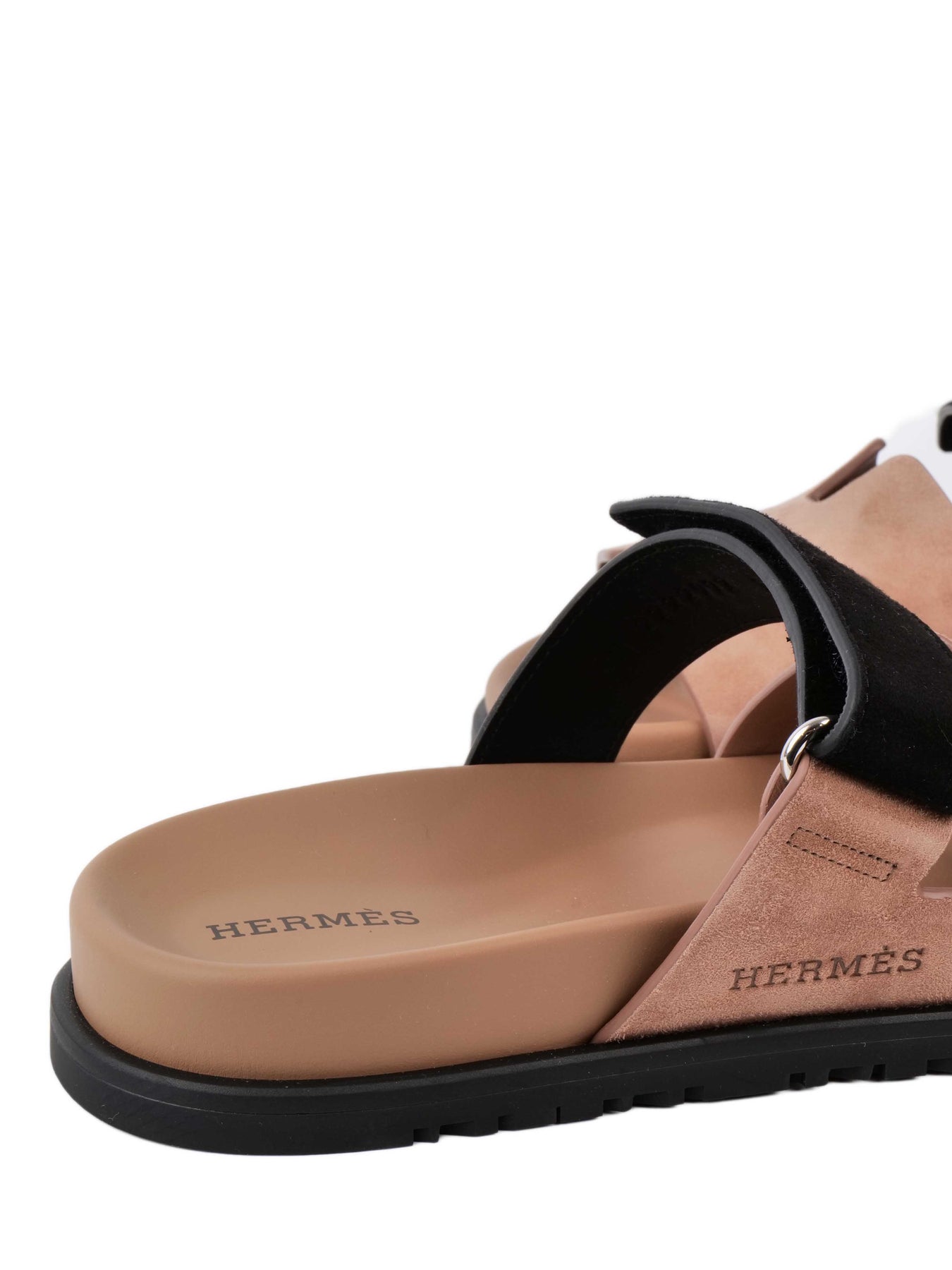 Hermes Chypre Sandals in Suede Rose Perle Noir 37.5.
