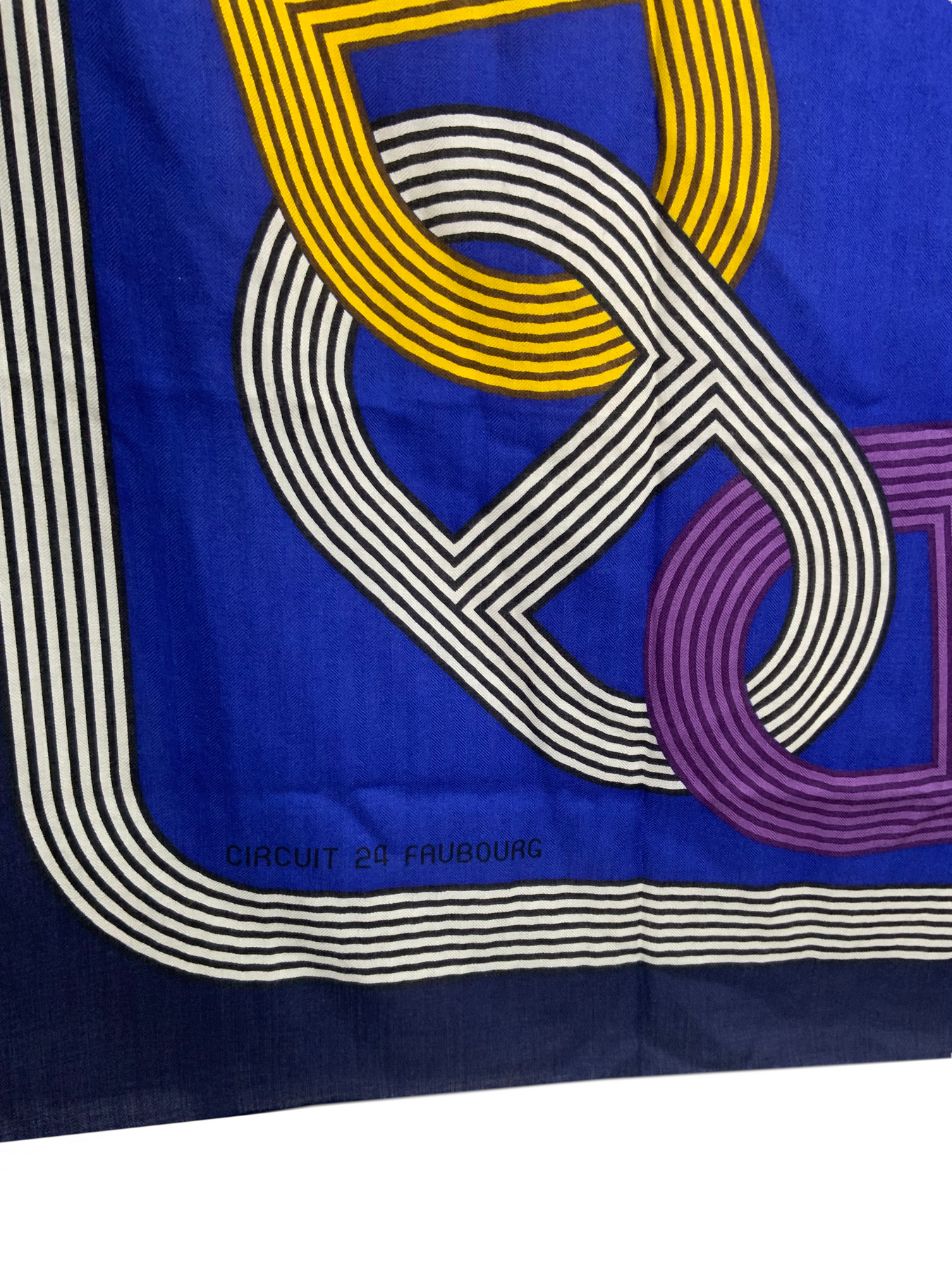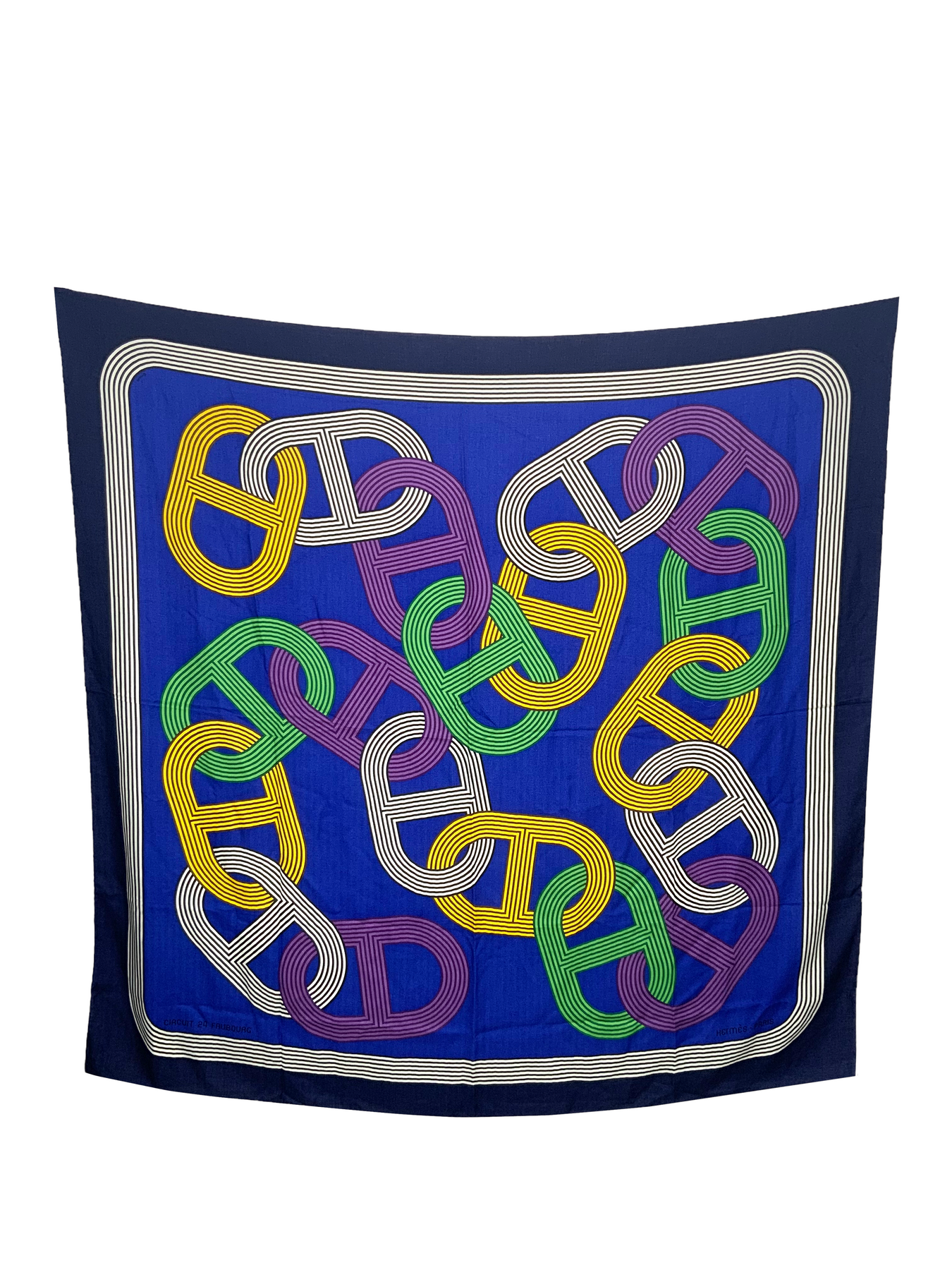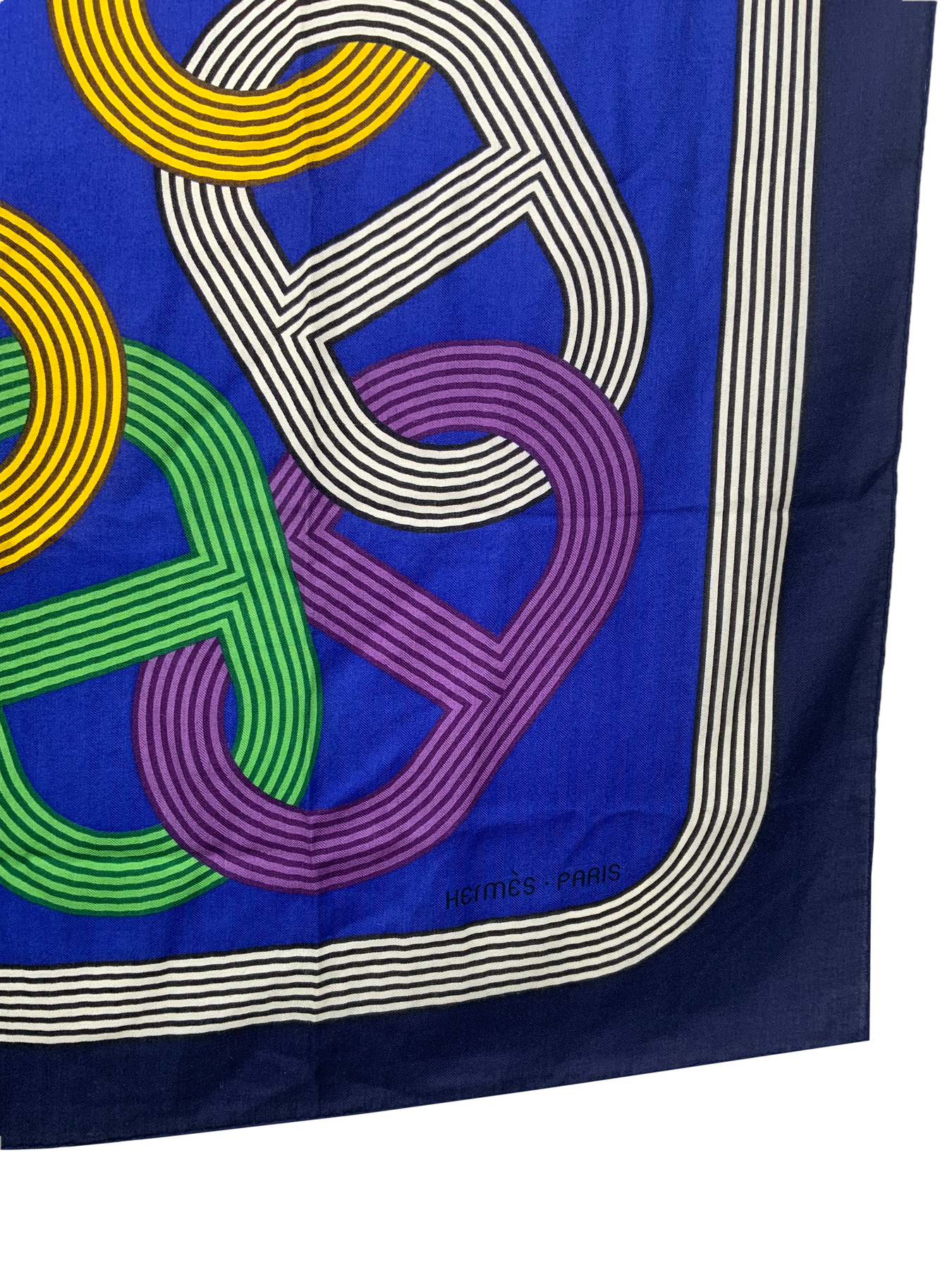 We the ity of this HERMES Circuit 24 Faubourg Cashmere Silk Shawl Scarf 140 designed by Benoit Pierre Emery and was first issued in 2012 which depicts beautiful multicolored chain links on a blue background with hand-rolled edges.