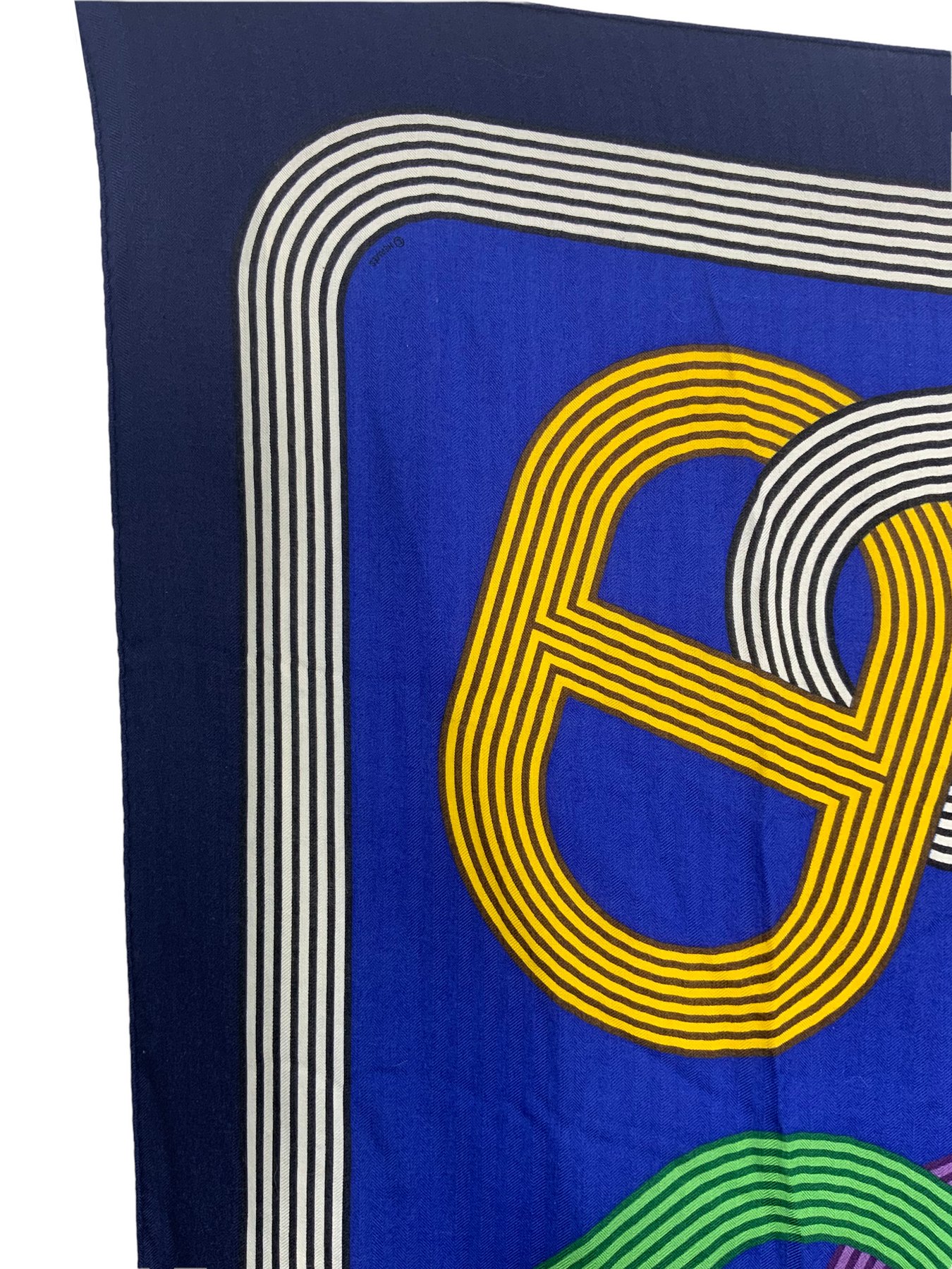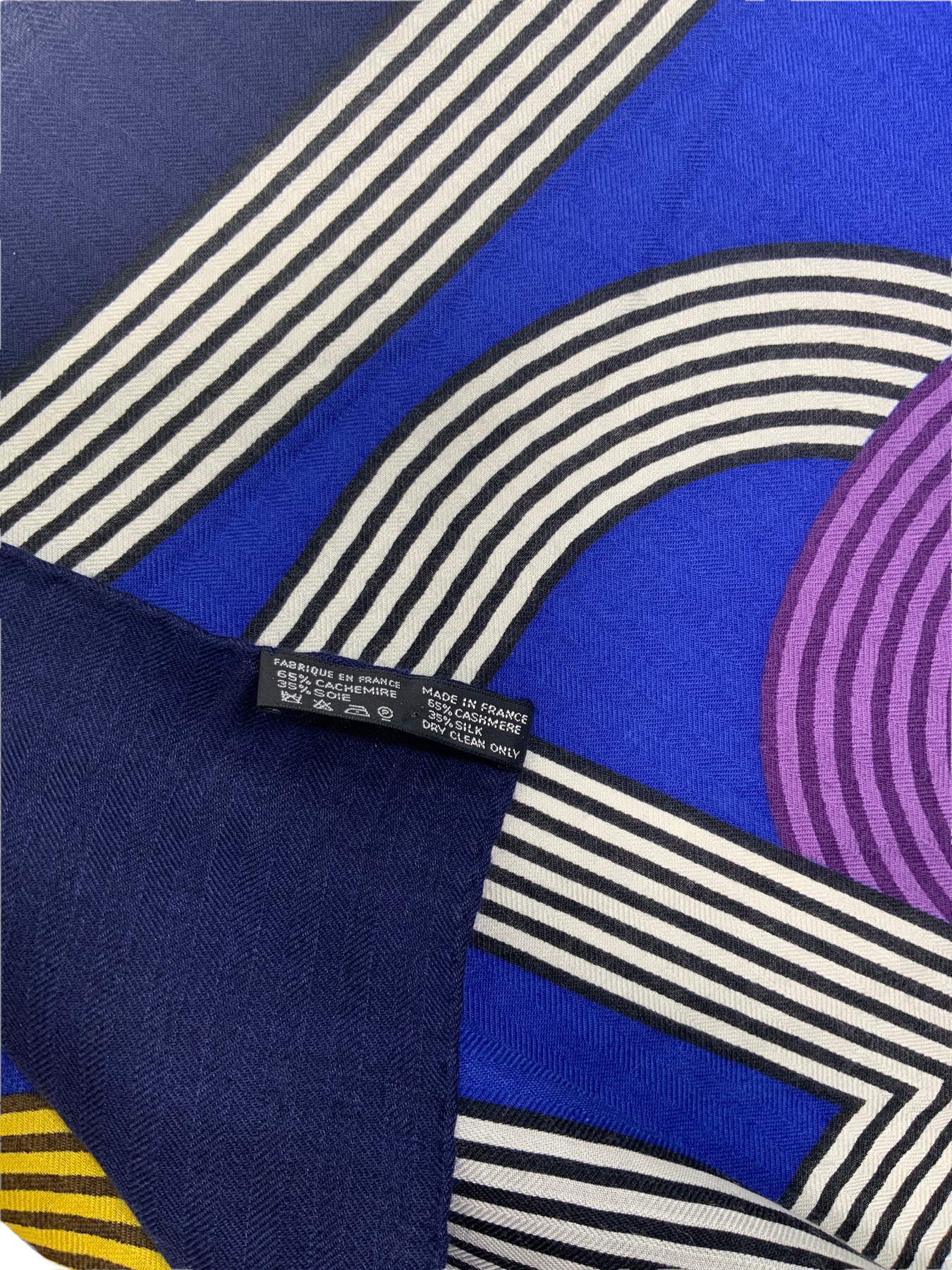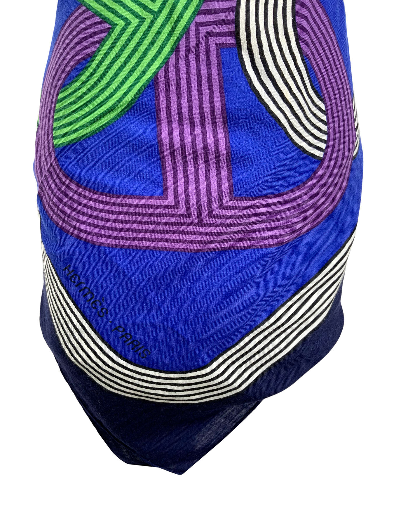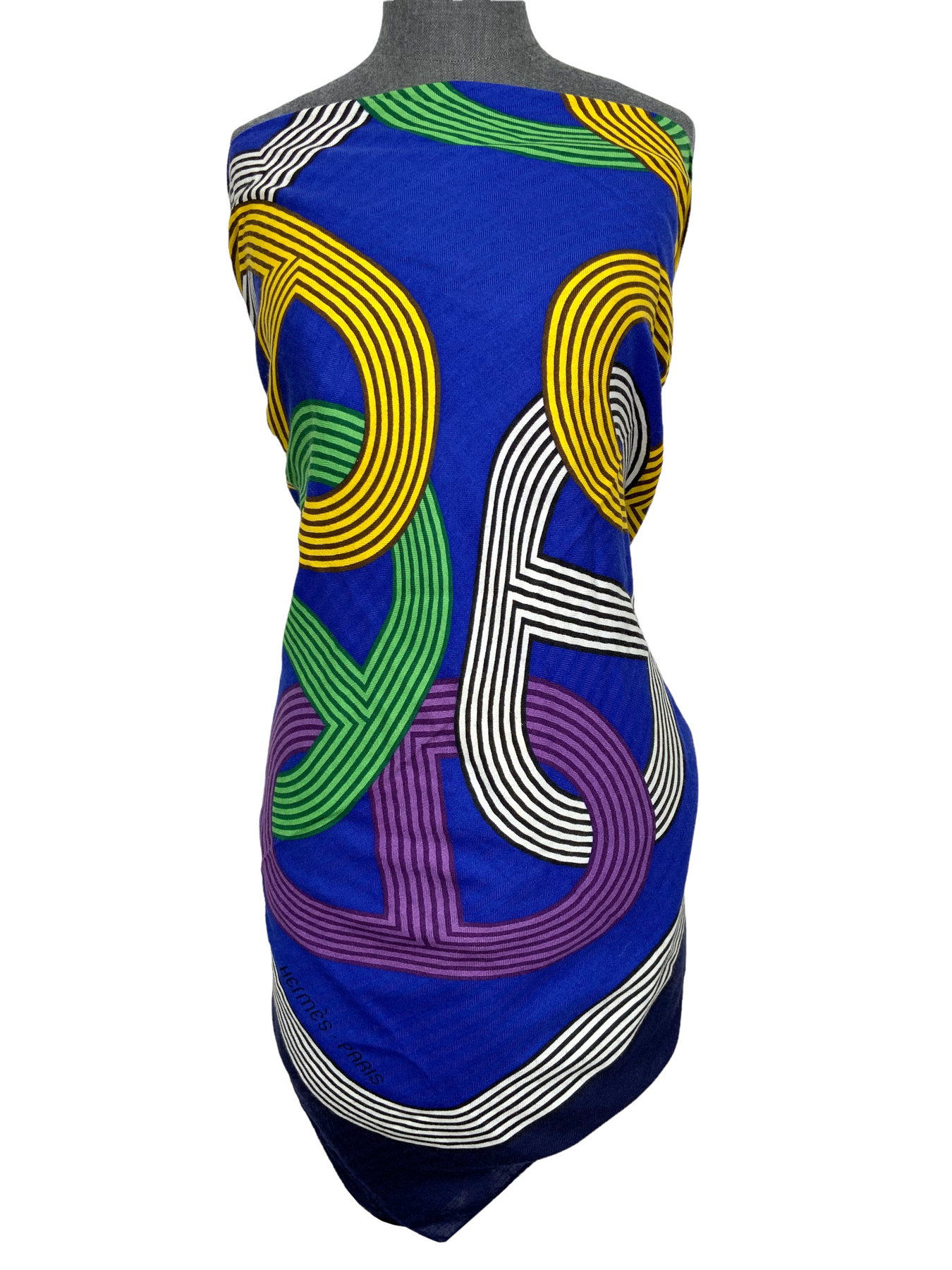 We the ity of this HERMES Circuit 24 Faubourg Cashmere Silk Shawl Scarf 140 designed by Benoit Pierre Emery and was first issued in 2012 which depicts beautiful multicolored chain links on a blue background with hand-rolled edges.