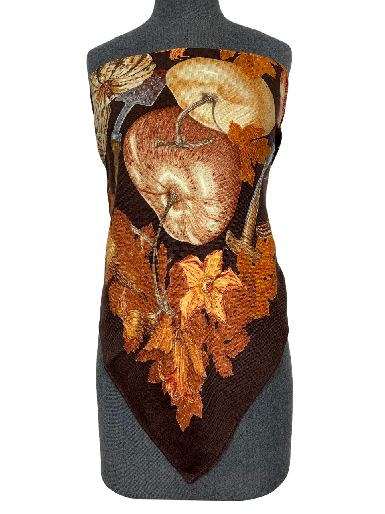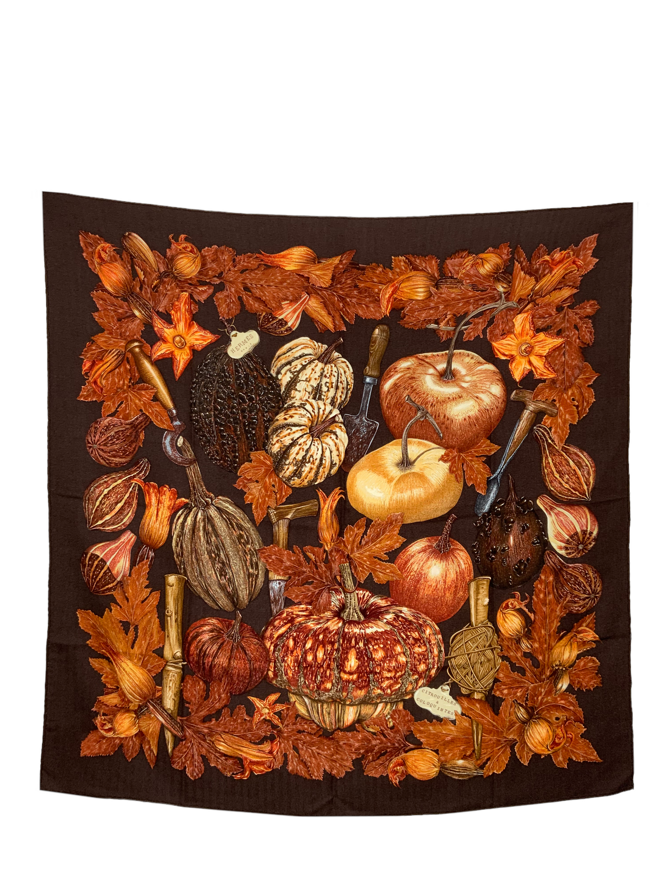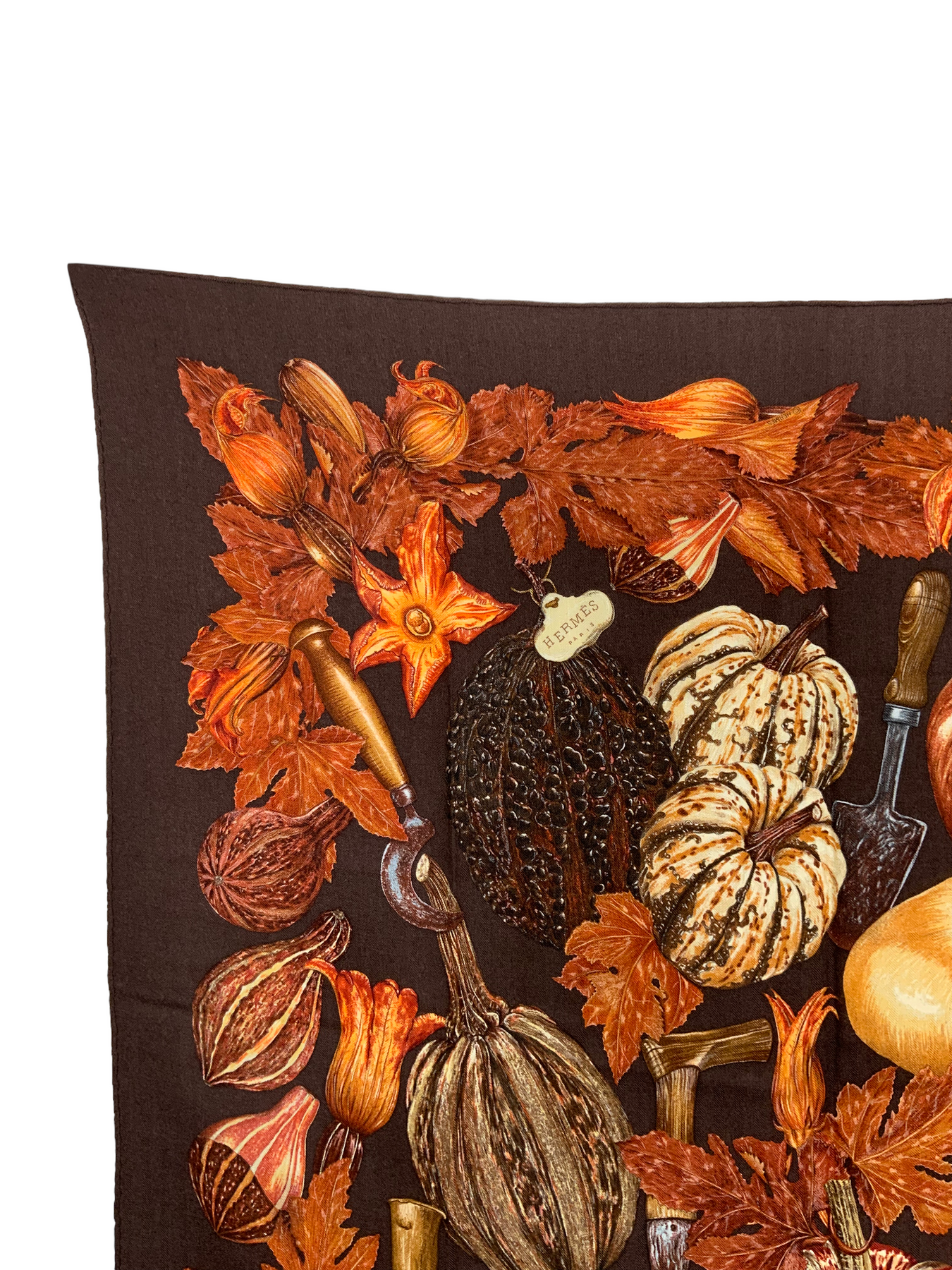We the ity of this HERMES Citrouilles Et Coloquintes Cashmere Scarf 90 designed by Valerie Dawlat Dumoulin and first issued in 1998. Featuring a beautiful autumn theme of pumpkins and leaves on a brown cashmere background.