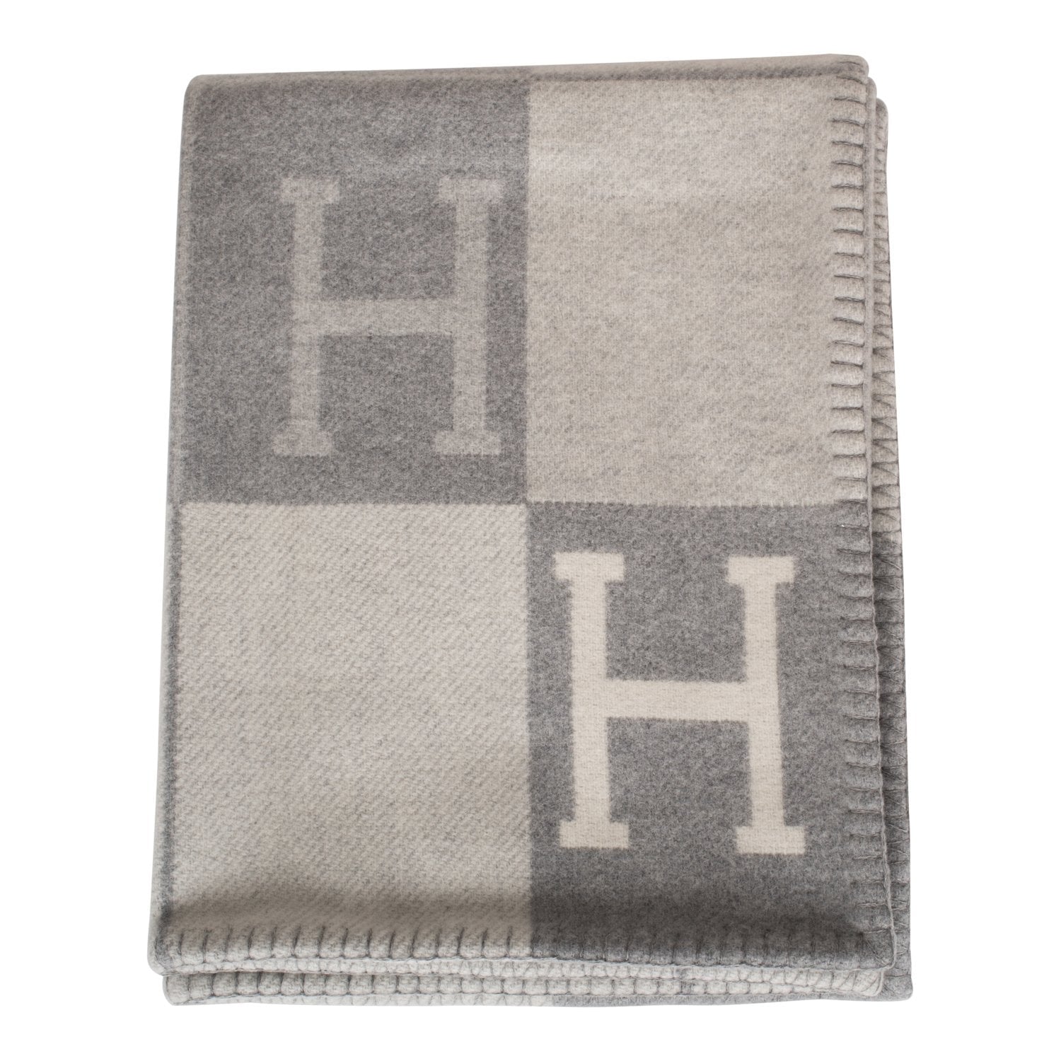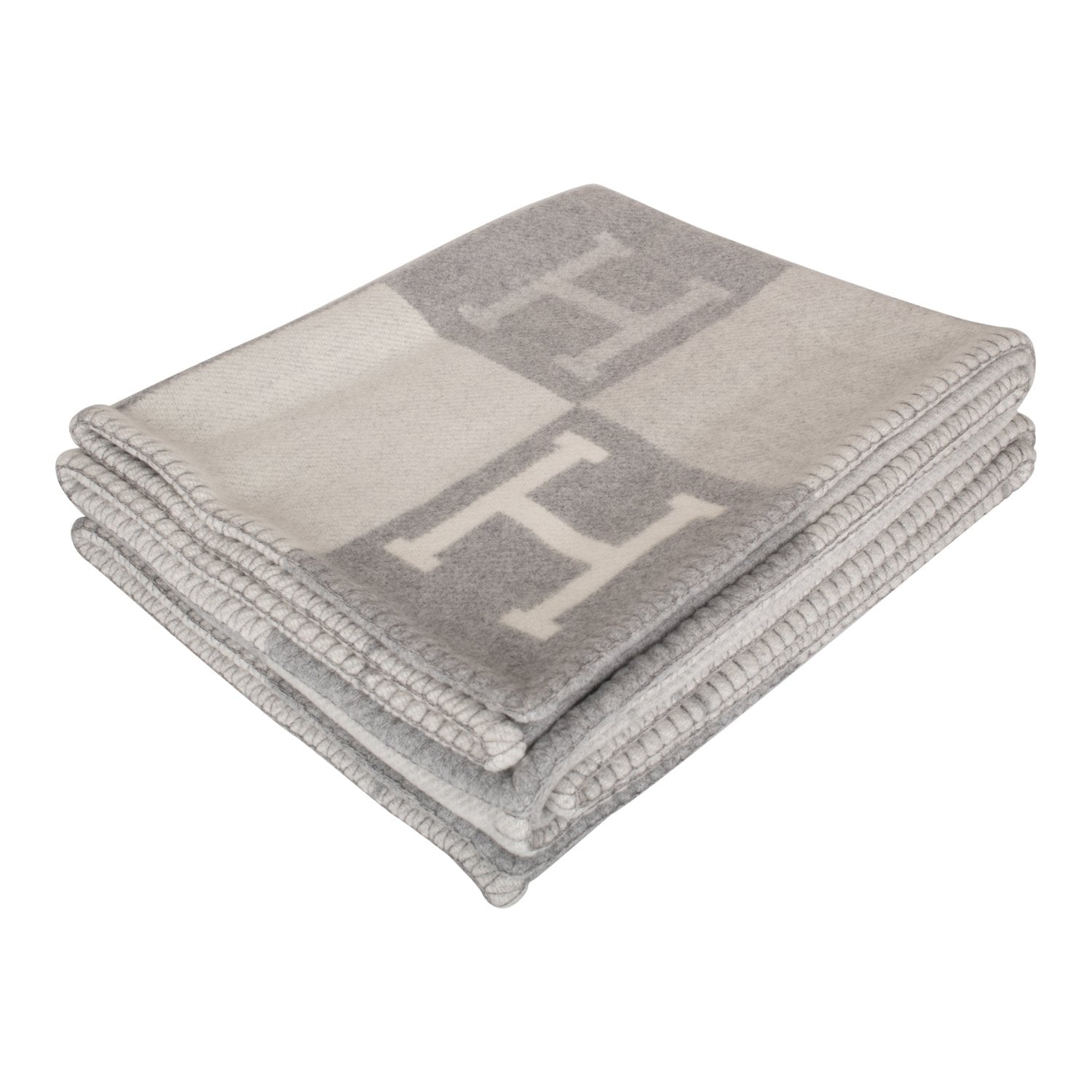 Hermes Classic Avalon Signature H blanket in ecru and gris clair made of 90% merino wool and 10% cashmere.