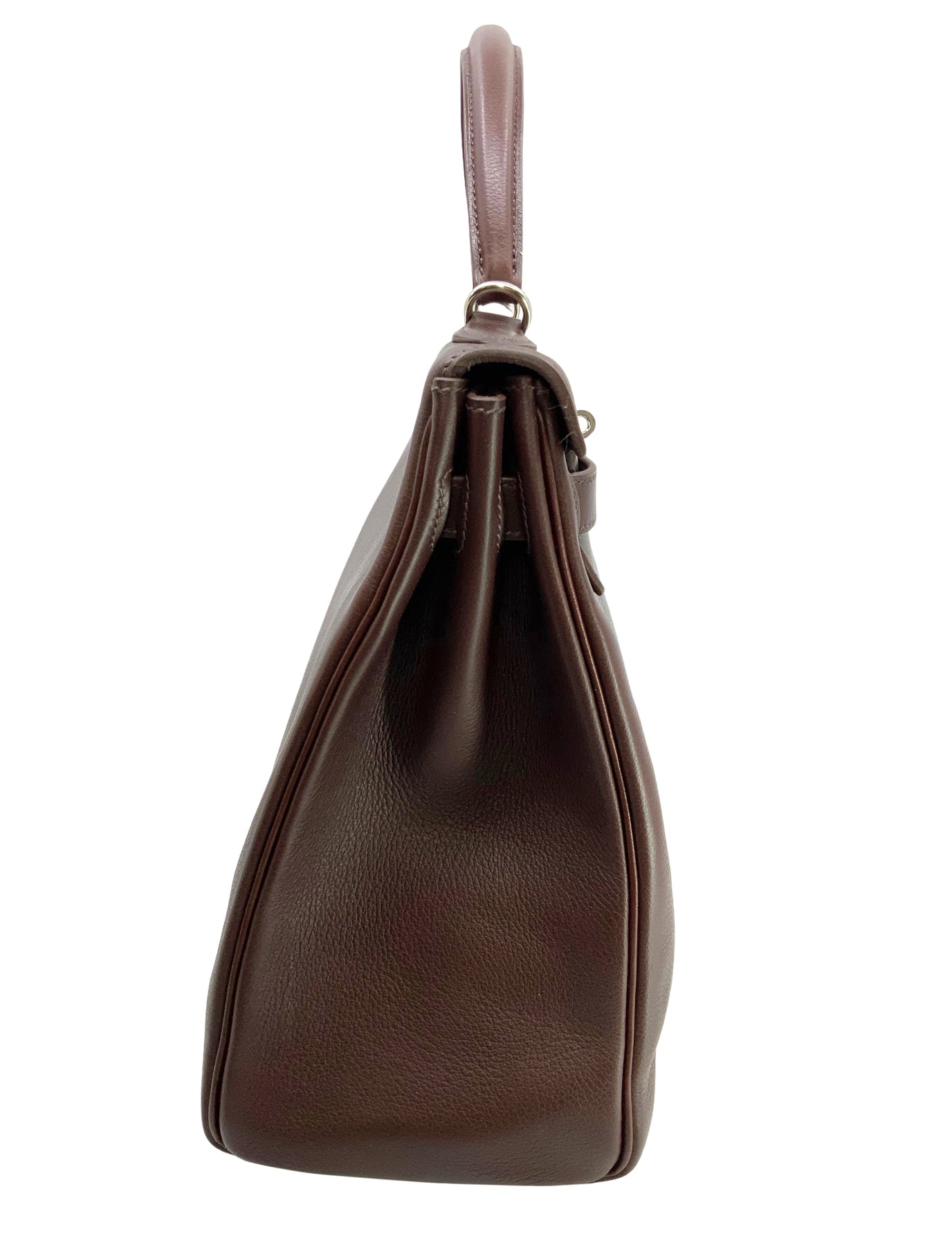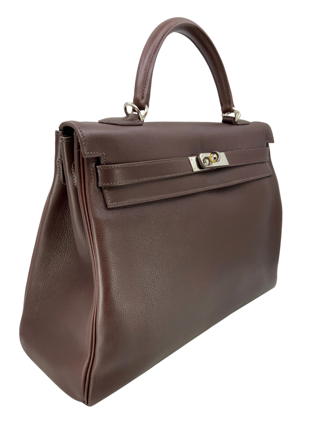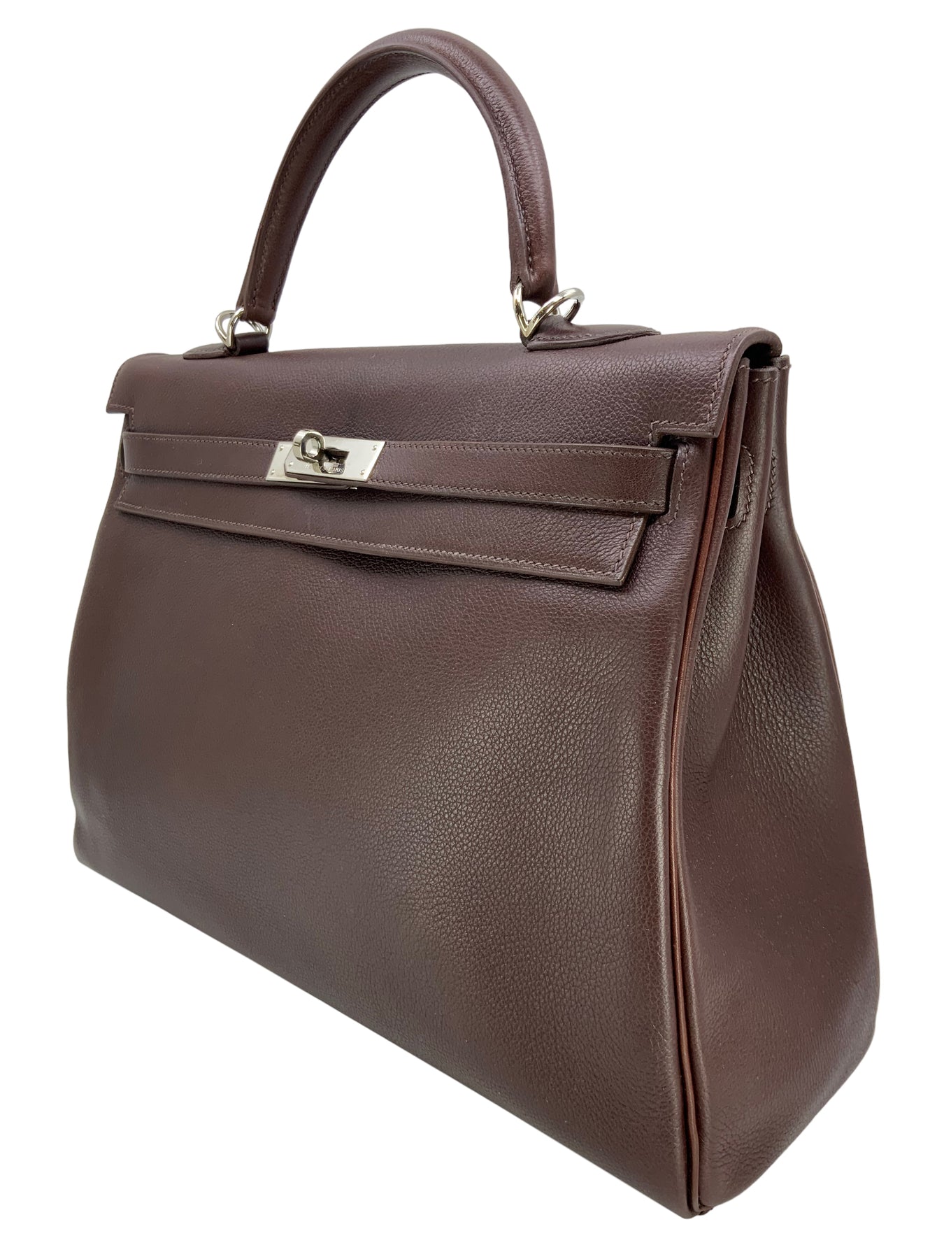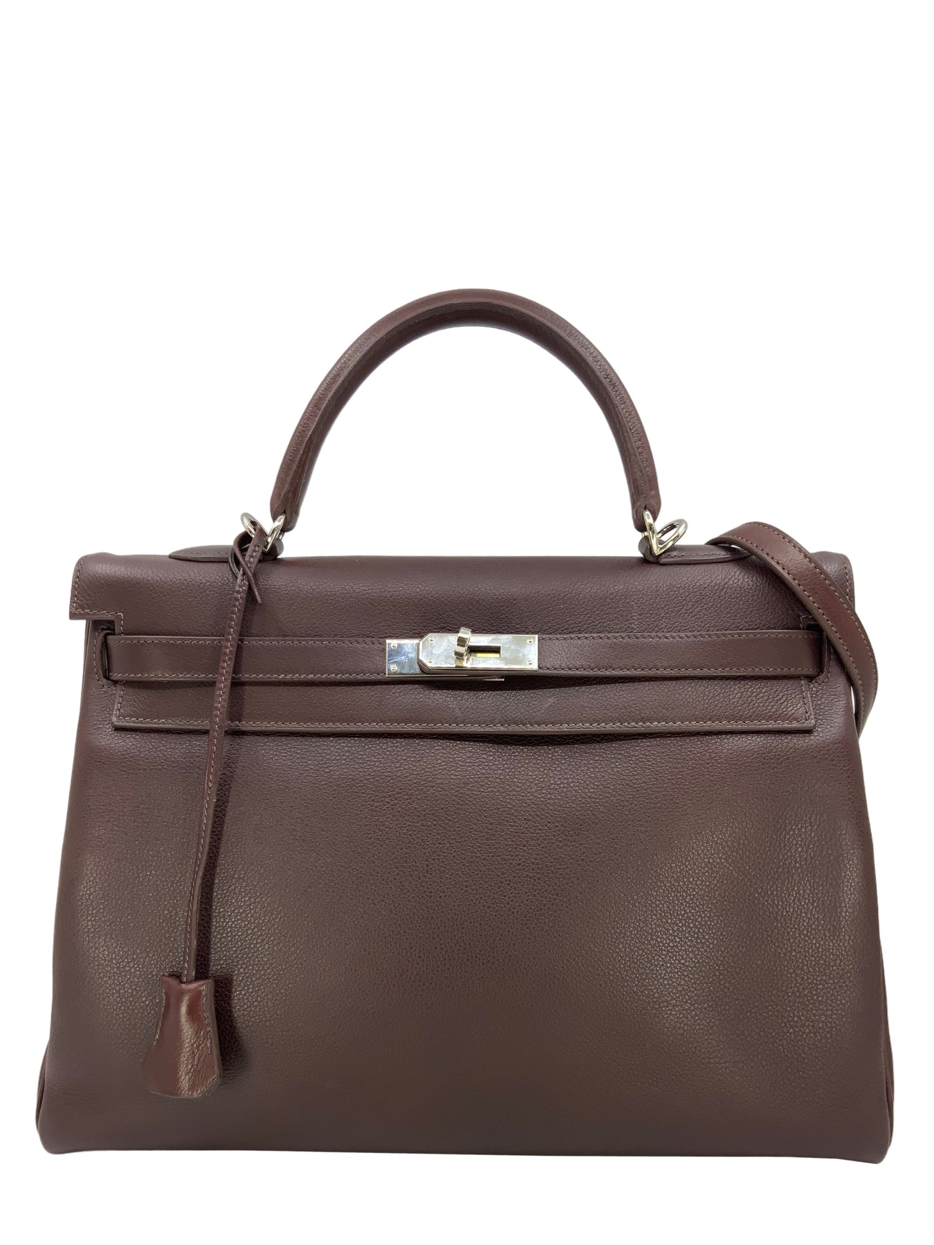 We the ity of this highly sought-after HERMES Clemence Kelly Retourne 35 Bag from 2013. This highly sought-after and nearly impossible to find collectors piece takes up to 20 hours to construct by the hand of a single highly skilled trained craftsman. This bag is a true investment piece, meaning it will either hold its value or increase over time. This timeless handbag features elegant brown leather, palladium protective metal feet, a rolled leather top handle, including a removable shoulder strap and a signature hanging key clochette. The large front flap is secured with a turn-lock closure that opens to a tonal leather interior lining with zip and double leather patch pockets.