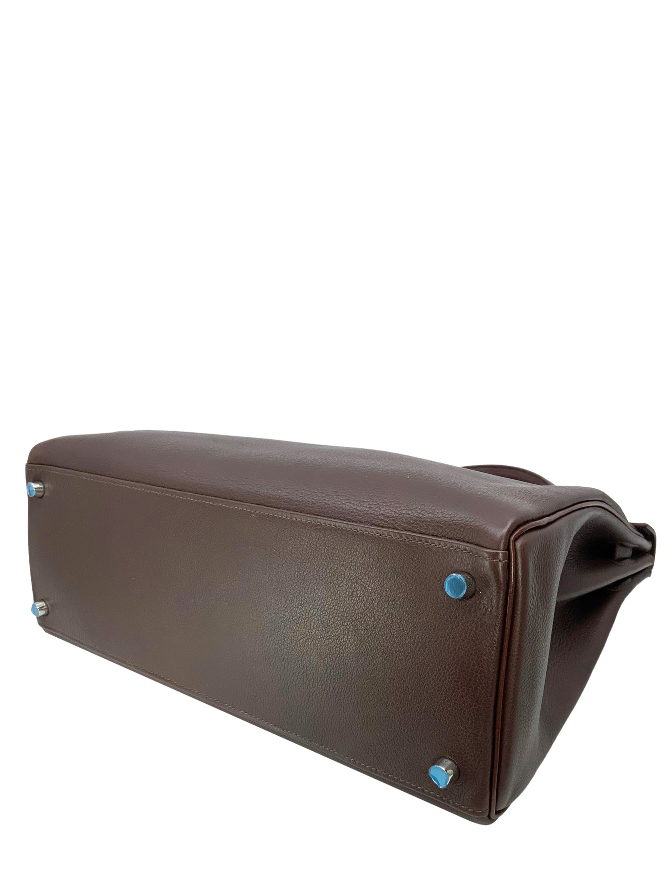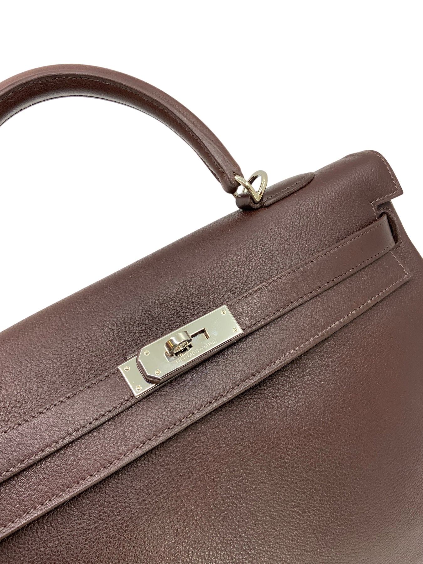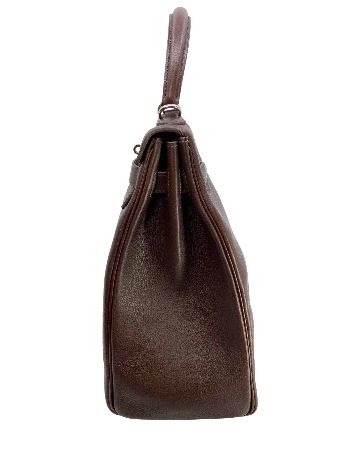 We the ity of this highly sought-after HERMES Clemence Kelly Retourne 35 Bag from 2013. This highly sought-after and nearly impossible to find collectors piece takes up to 20 hours to construct by the hand of a single highly skilled trained craftsman. This bag is a true investment piece, meaning it will either hold its value or increase over time. This timeless handbag features elegant brown leather, palladium protective metal feet, a rolled leather top handle, including a removable shoulder strap and a signature hanging key clochette. The large front flap is secured with a turn-lock closure that opens to a tonal leather interior lining with zip and double leather patch pockets.