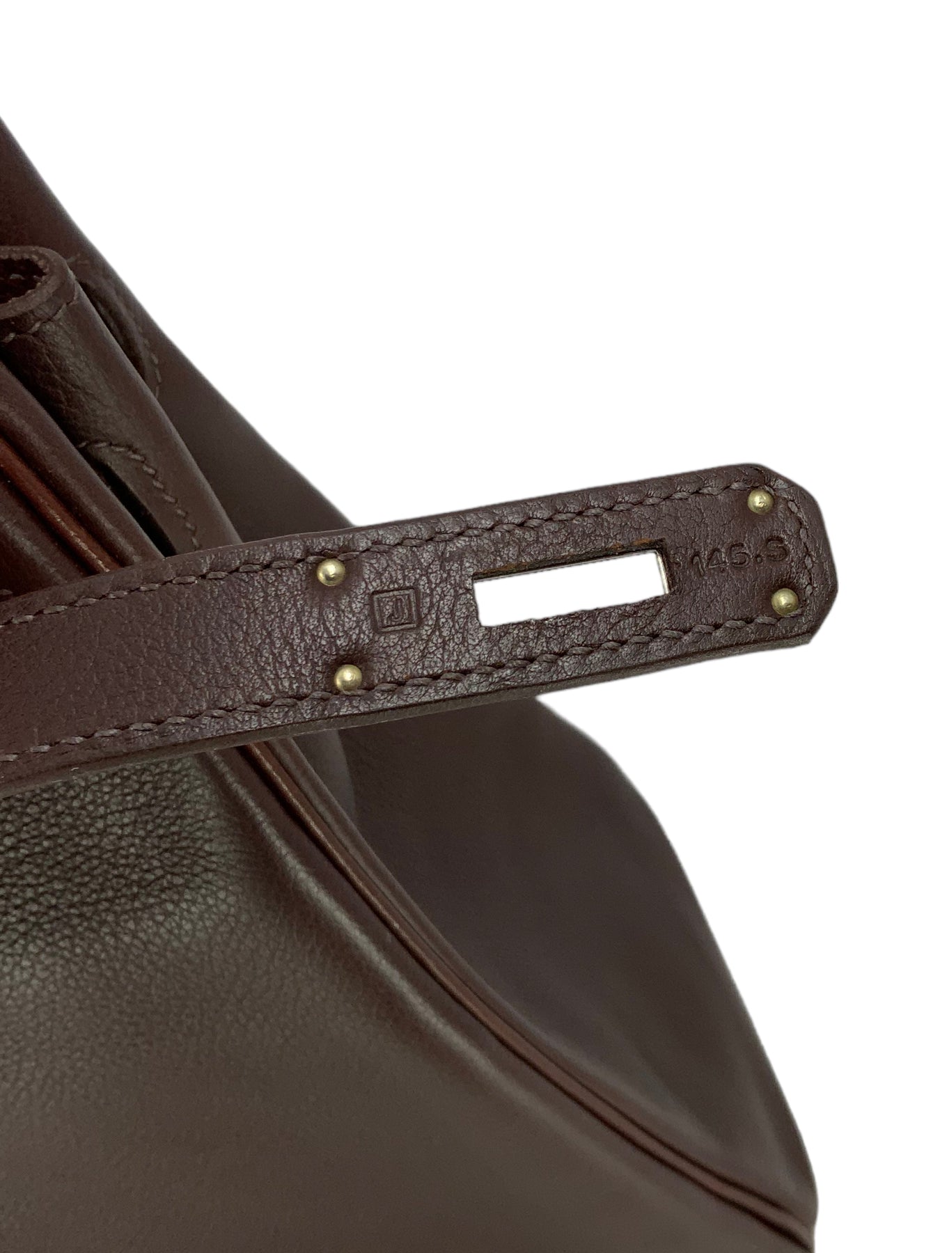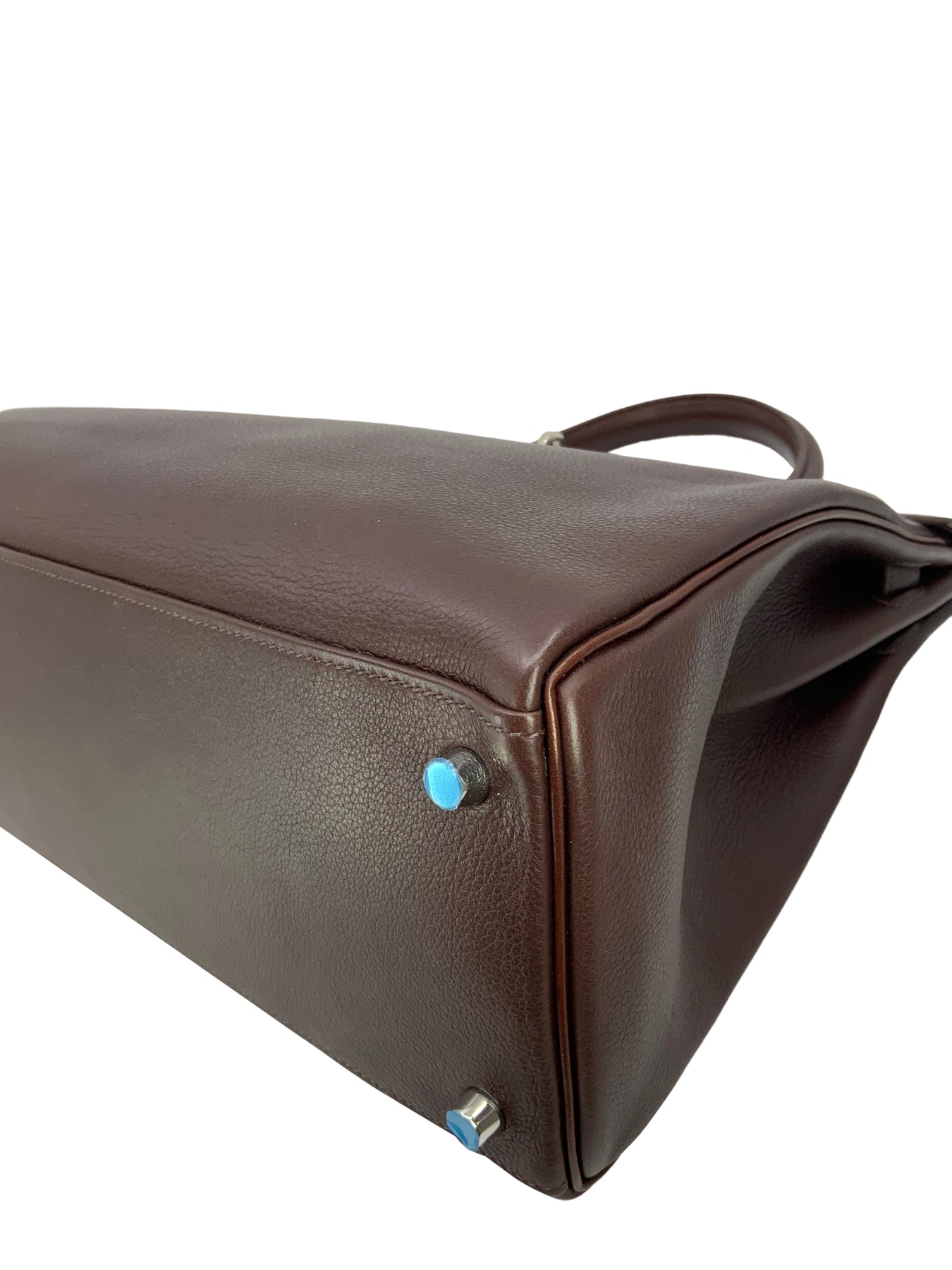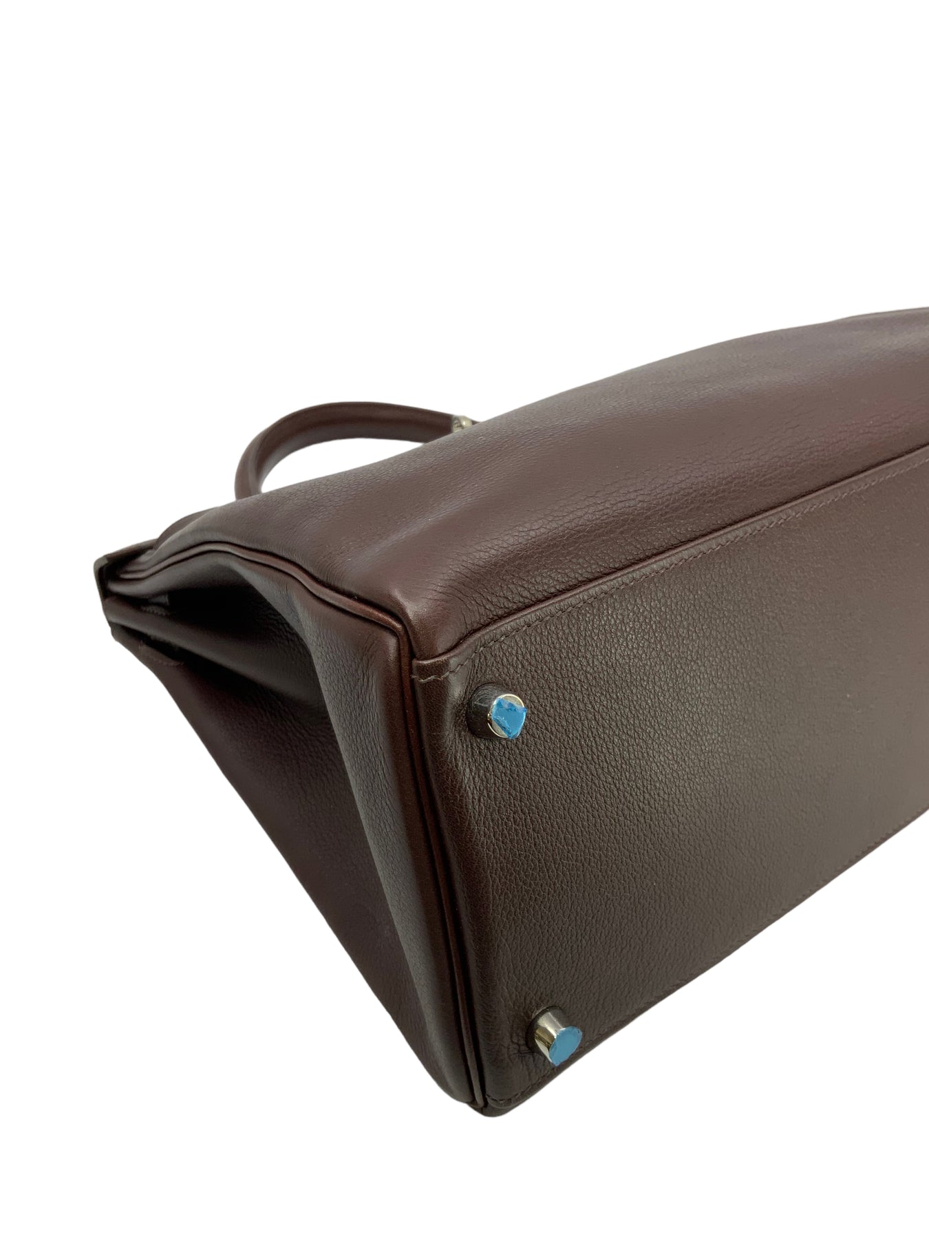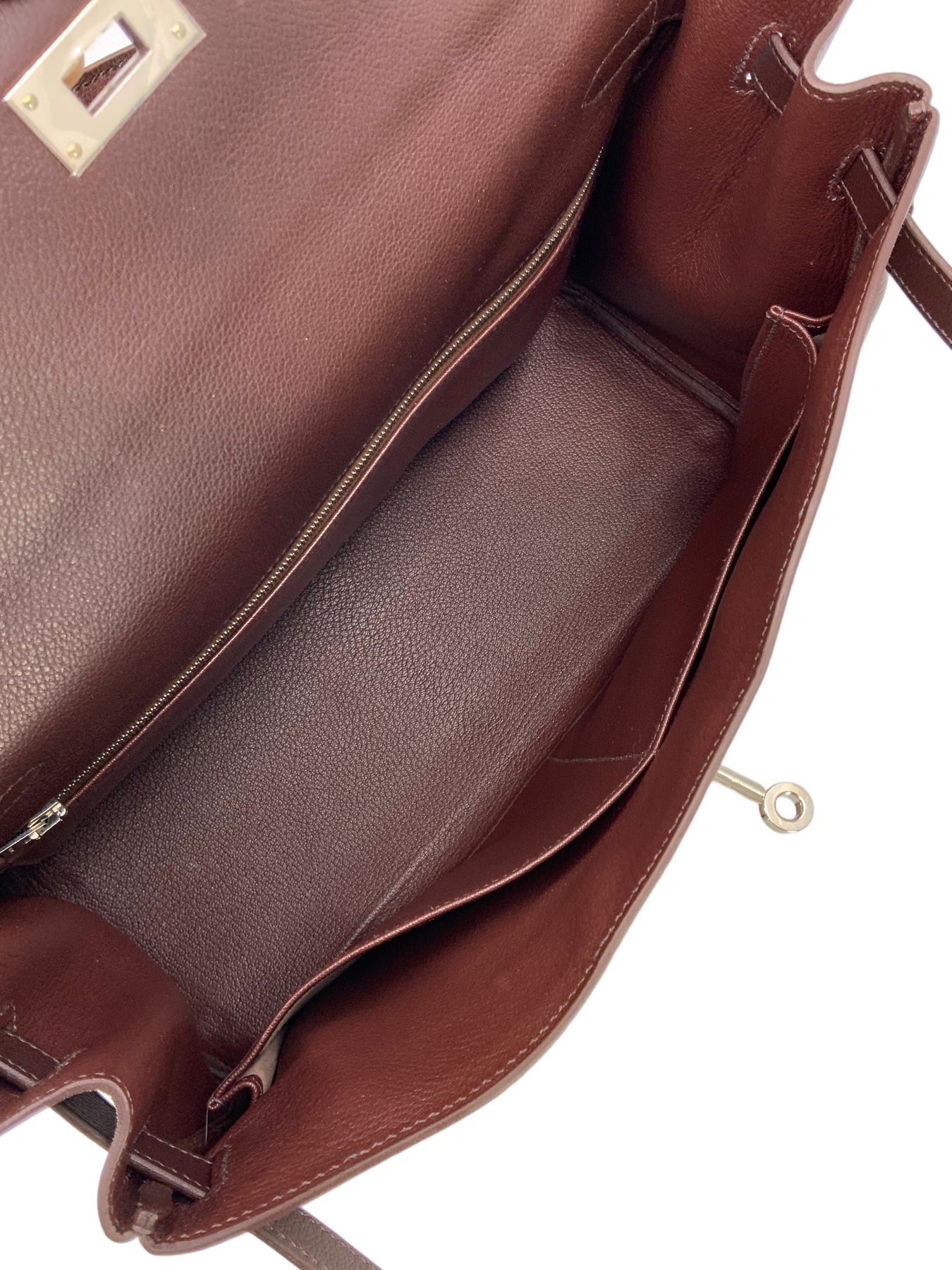 We the ity of this highly sought-after HERMES Clemence Kelly Retourne 35 Bag from 2013. This highly sought-after and nearly impossible to find collectors piece takes up to 20 hours to construct by the hand of a single highly skilled trained craftsman. This bag is a true investment piece, meaning it will either hold its value or increase over time. This timeless handbag features elegant brown leather, palladium protective metal feet, a rolled leather top handle, including a removable shoulder strap and a signature hanging key clochette. The large front flap is secured with a turn-lock closure that opens to a tonal leather interior lining with zip and double leather patch pockets.