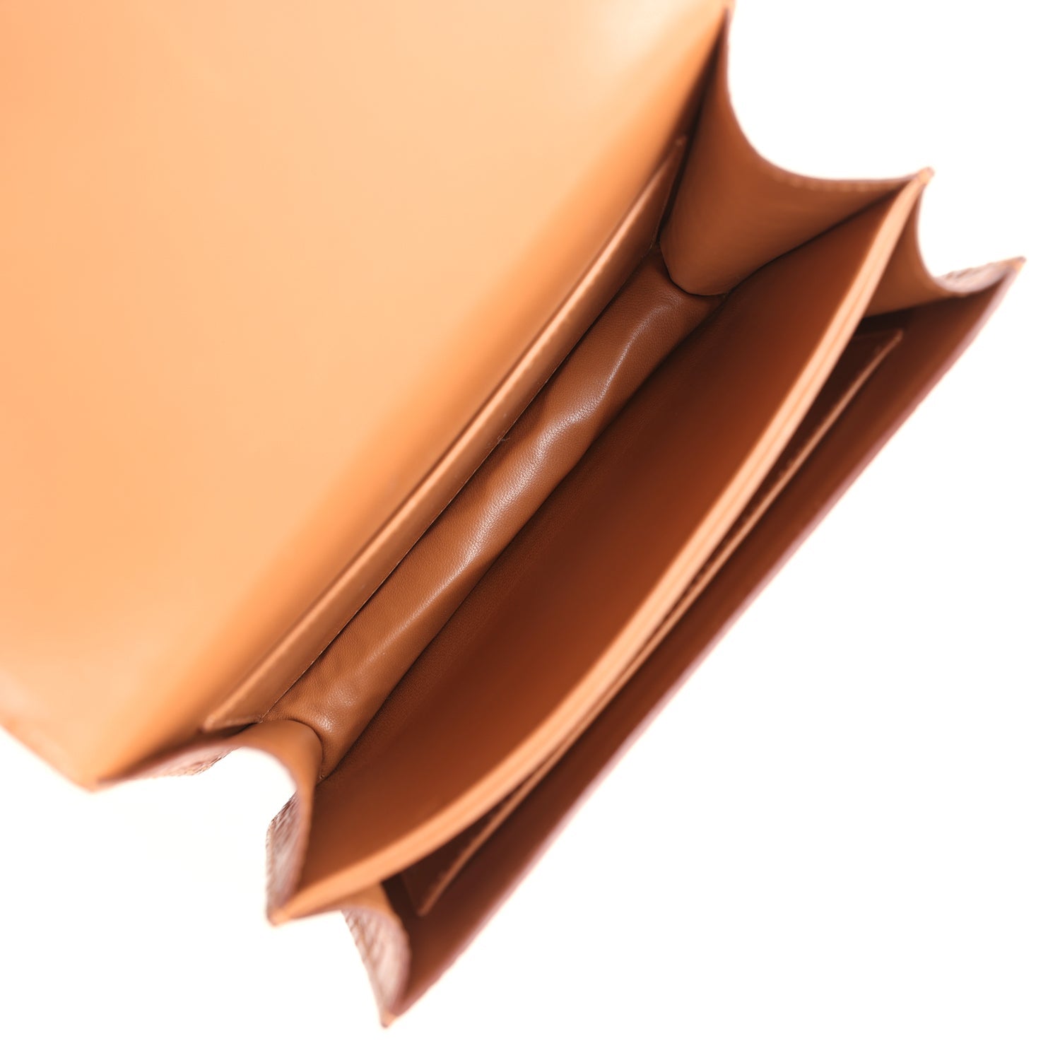 The interior is lined with Chai lambskin and has an open pocket on the front wall, a center divide, and a slit pocket on the back wall.