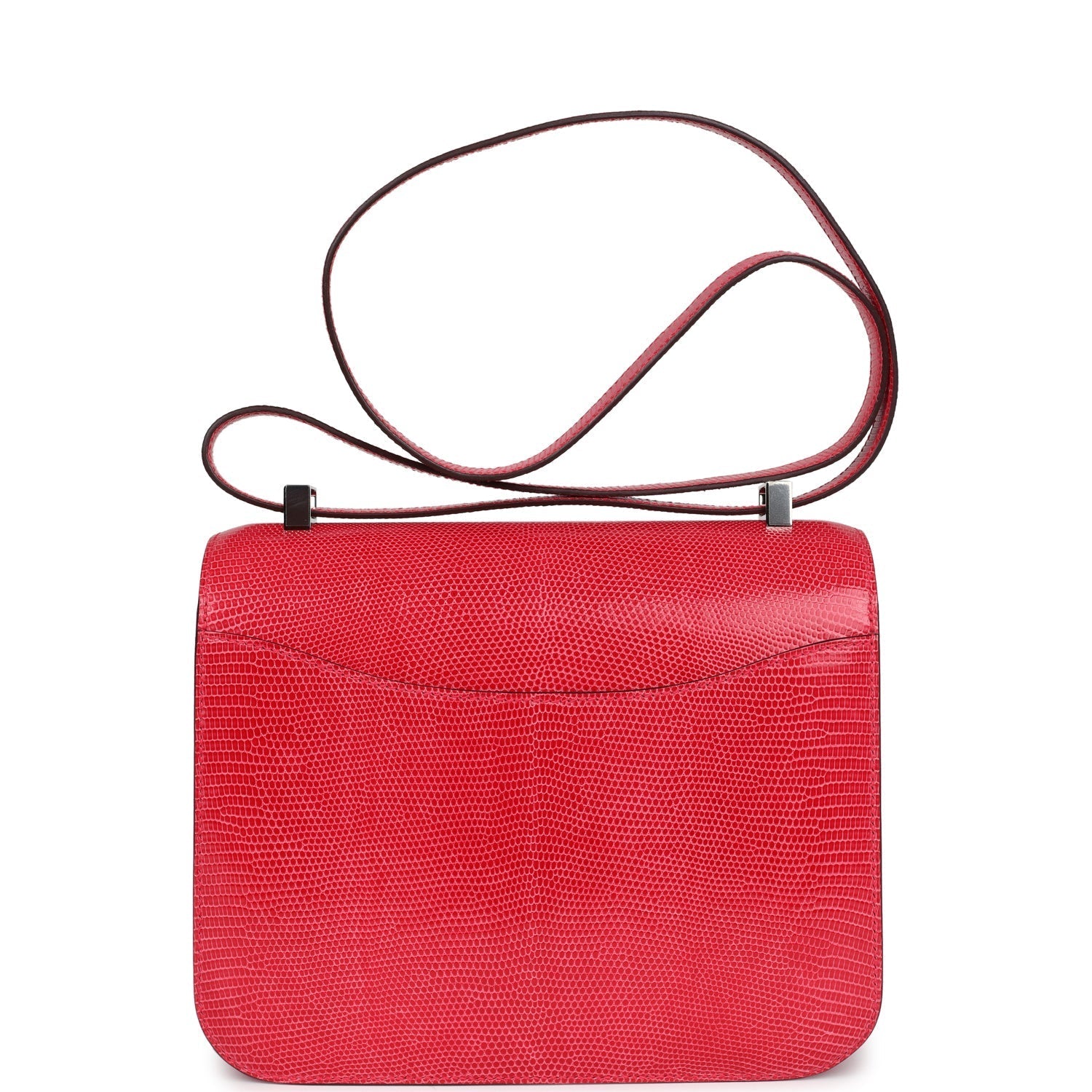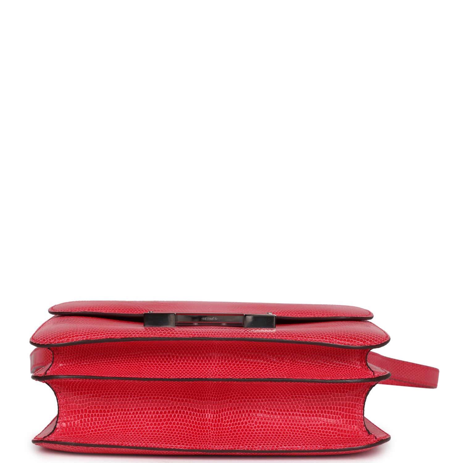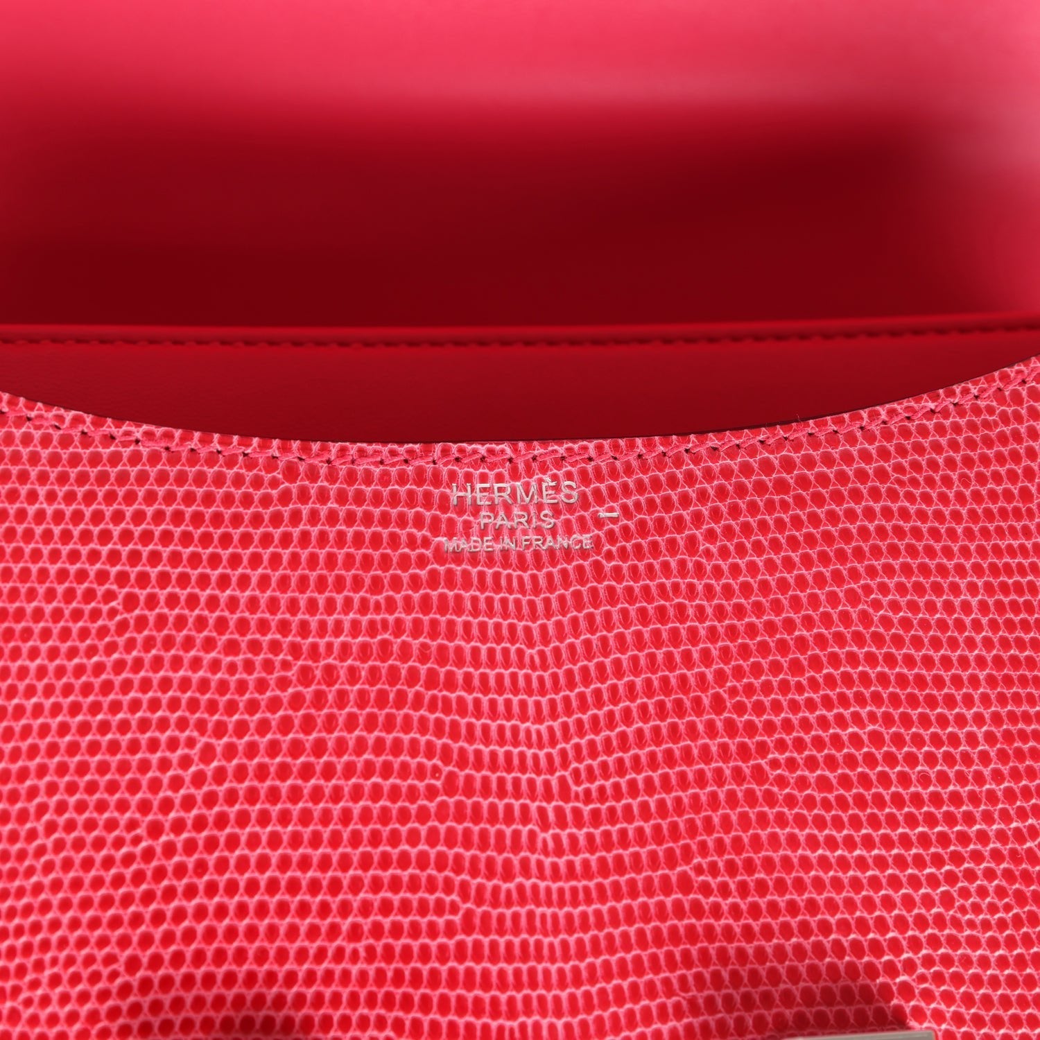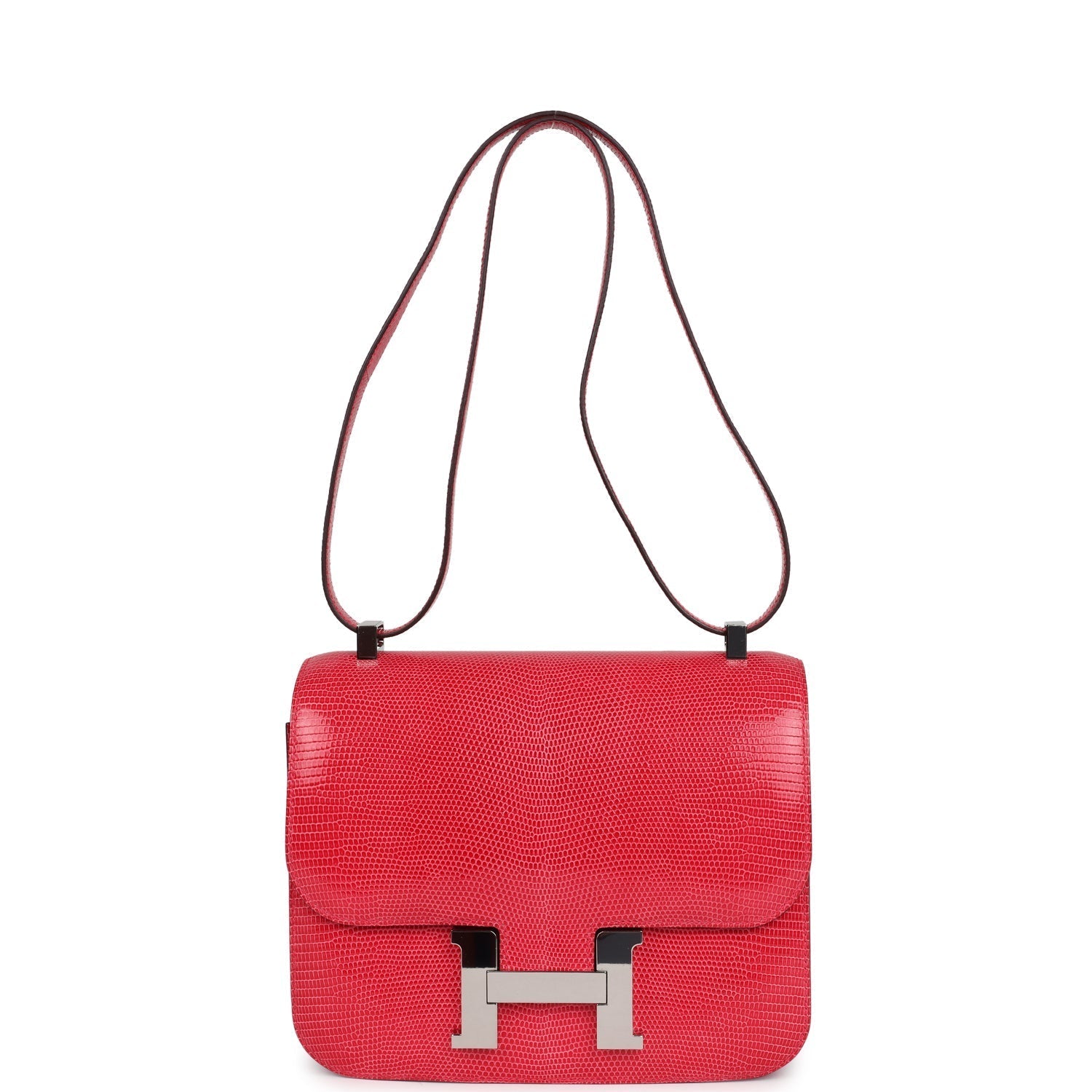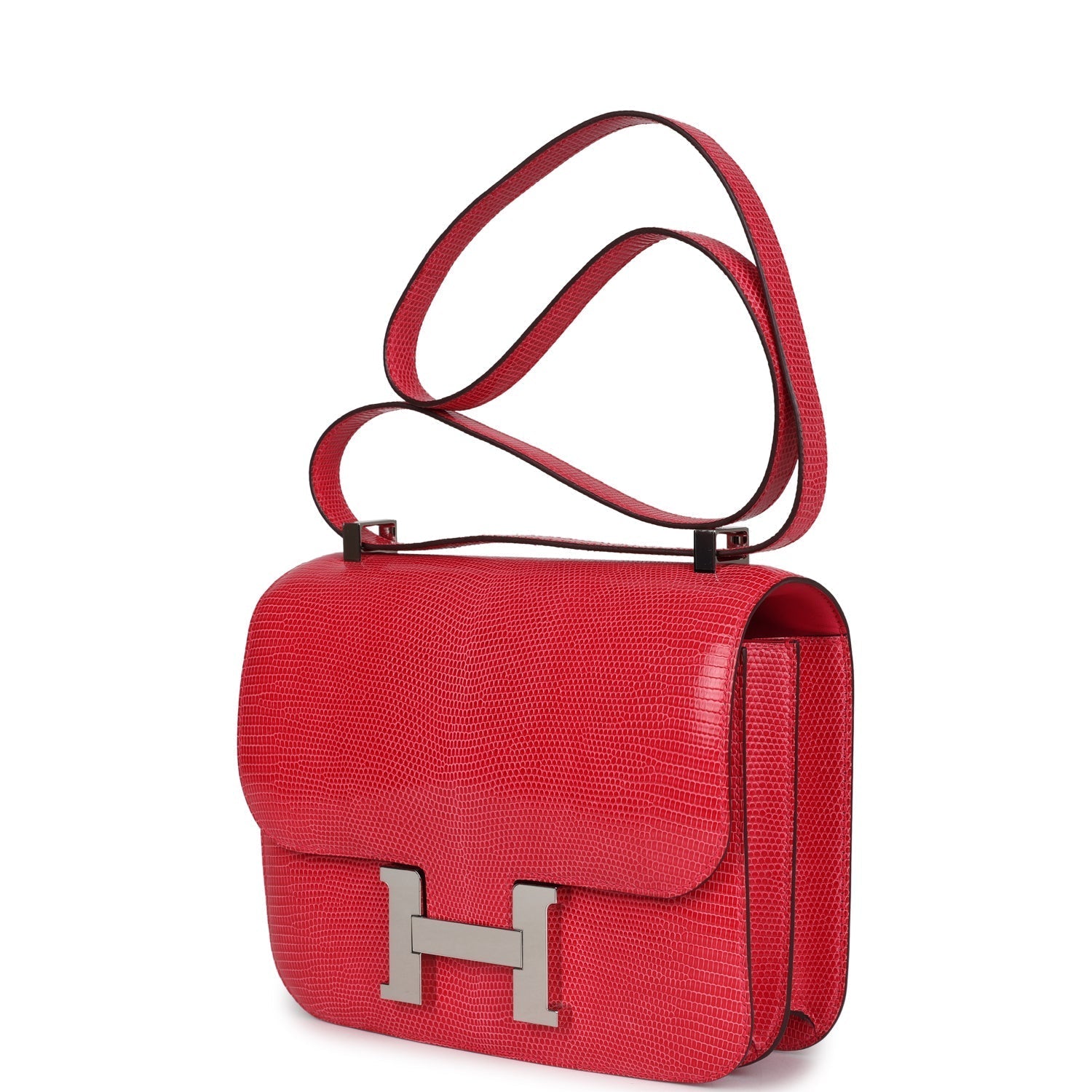 Constance 24 is in Rose Extreme Shiny Varanus Niloticus Lizard leather with palladium hardware and has tonal stitching, a metal "H" snap lock closure and adjustable shoulder strap.