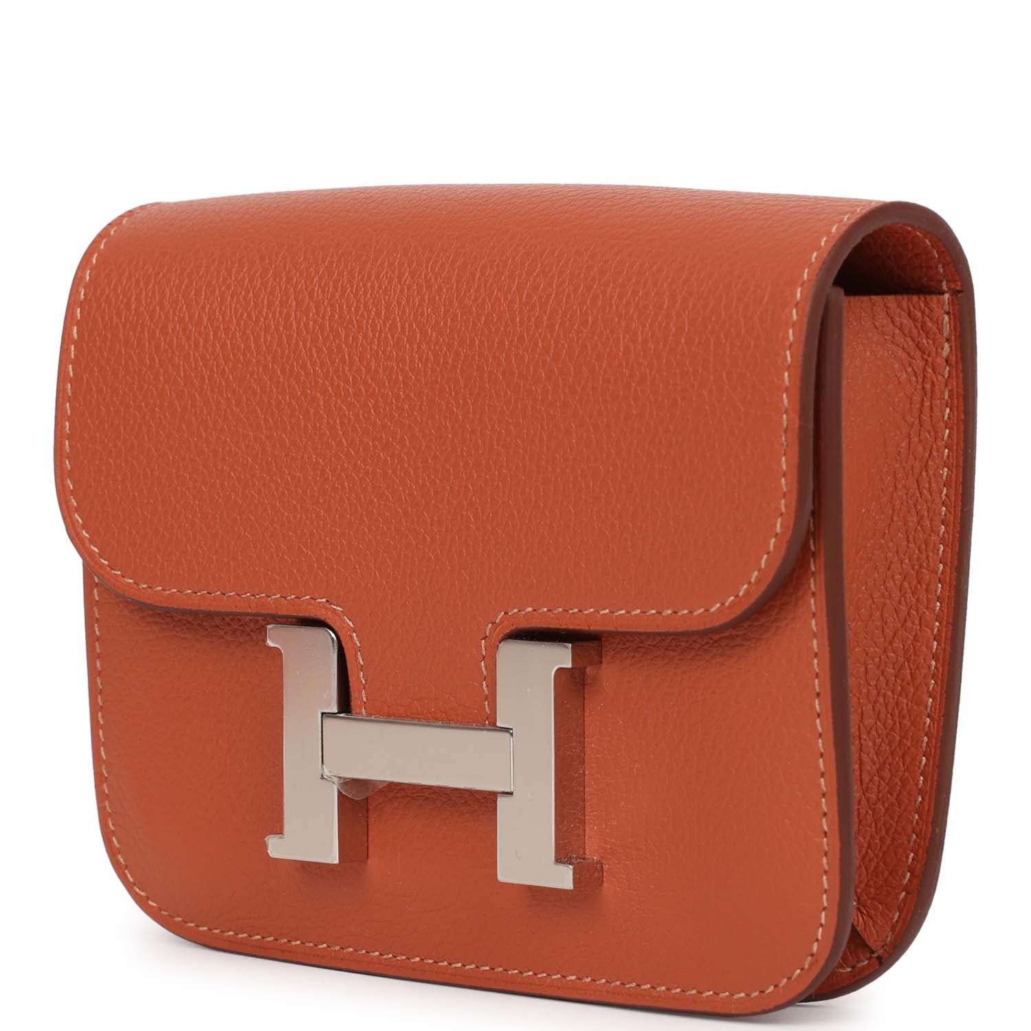 his Constance Slim Wallet is in Brique Evercolor leather with palladium hardware and has tonal stitching, rear belt loop, front flap and removable coin pouch.