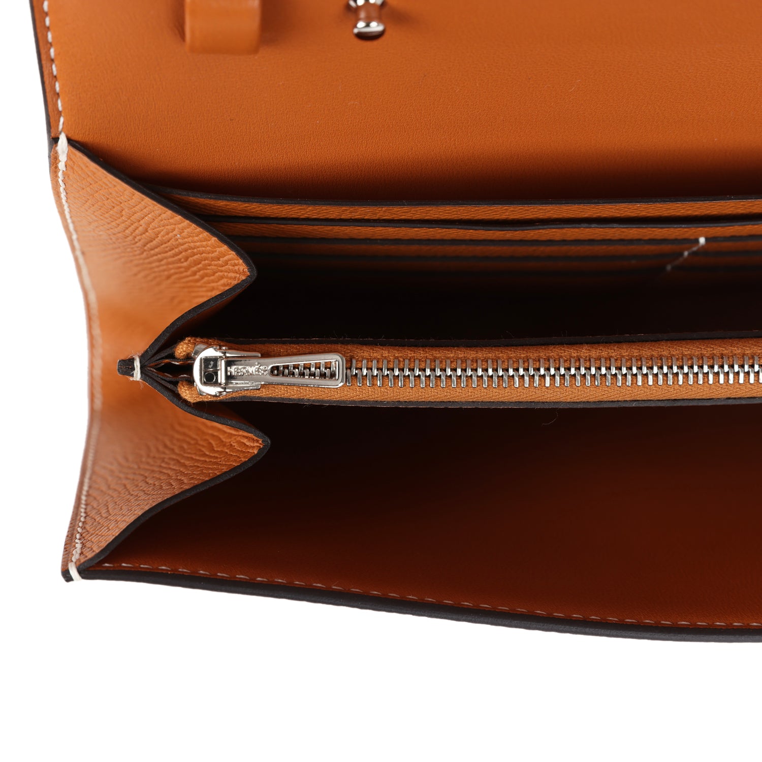 The interior is lined with Toffee leather and two main compartments with six credit card slots and a zippered center compartment with Hermes H lock pull.