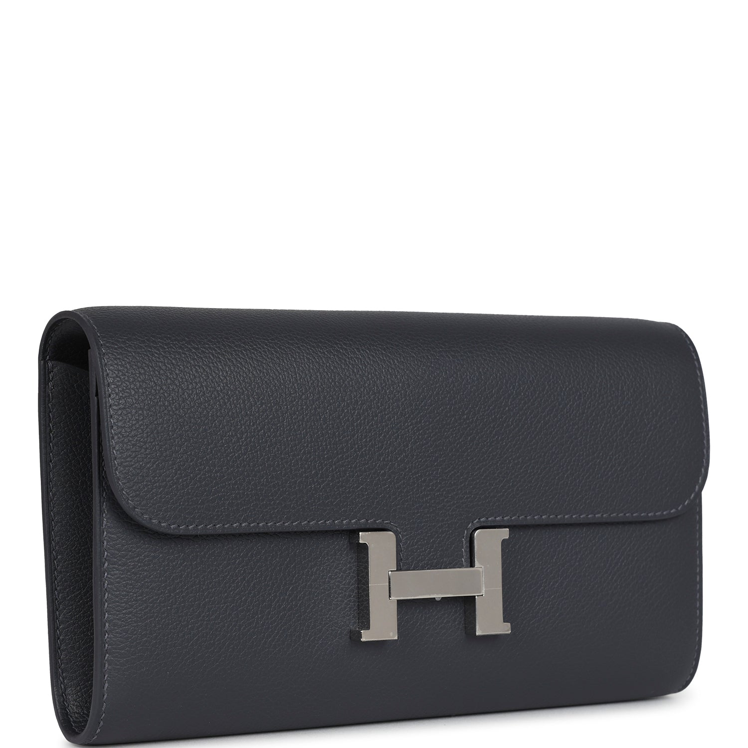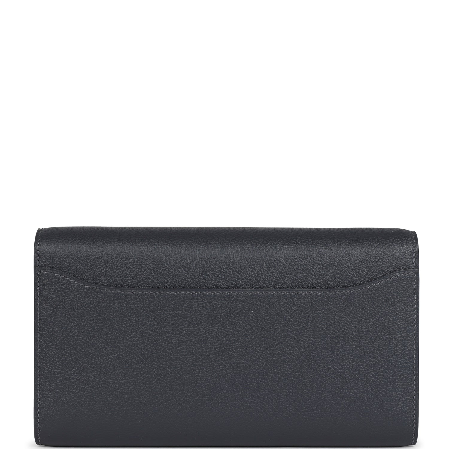 Constance Wallet To Go is in Ardoise evercolor leather with palladium hardware and has tonal stitching, metal "H" snap lock closure, open front compartment and removable crossbody strap.