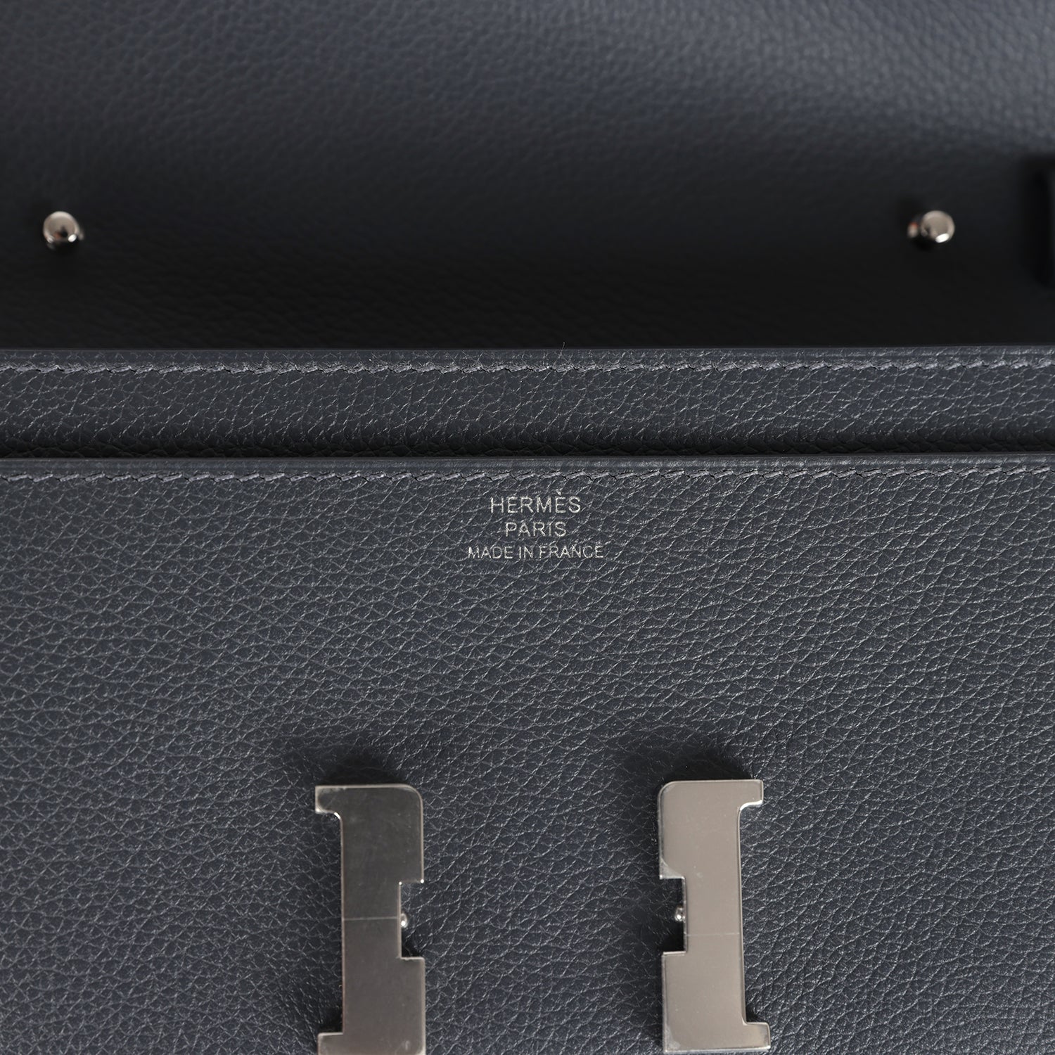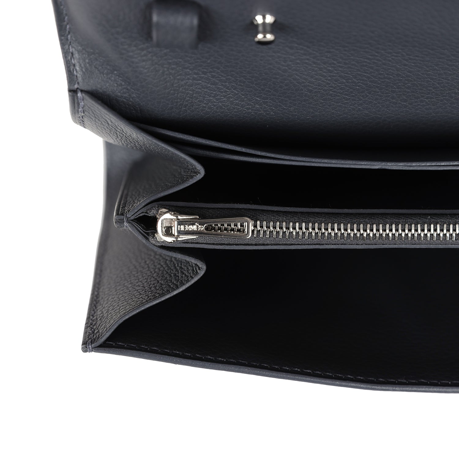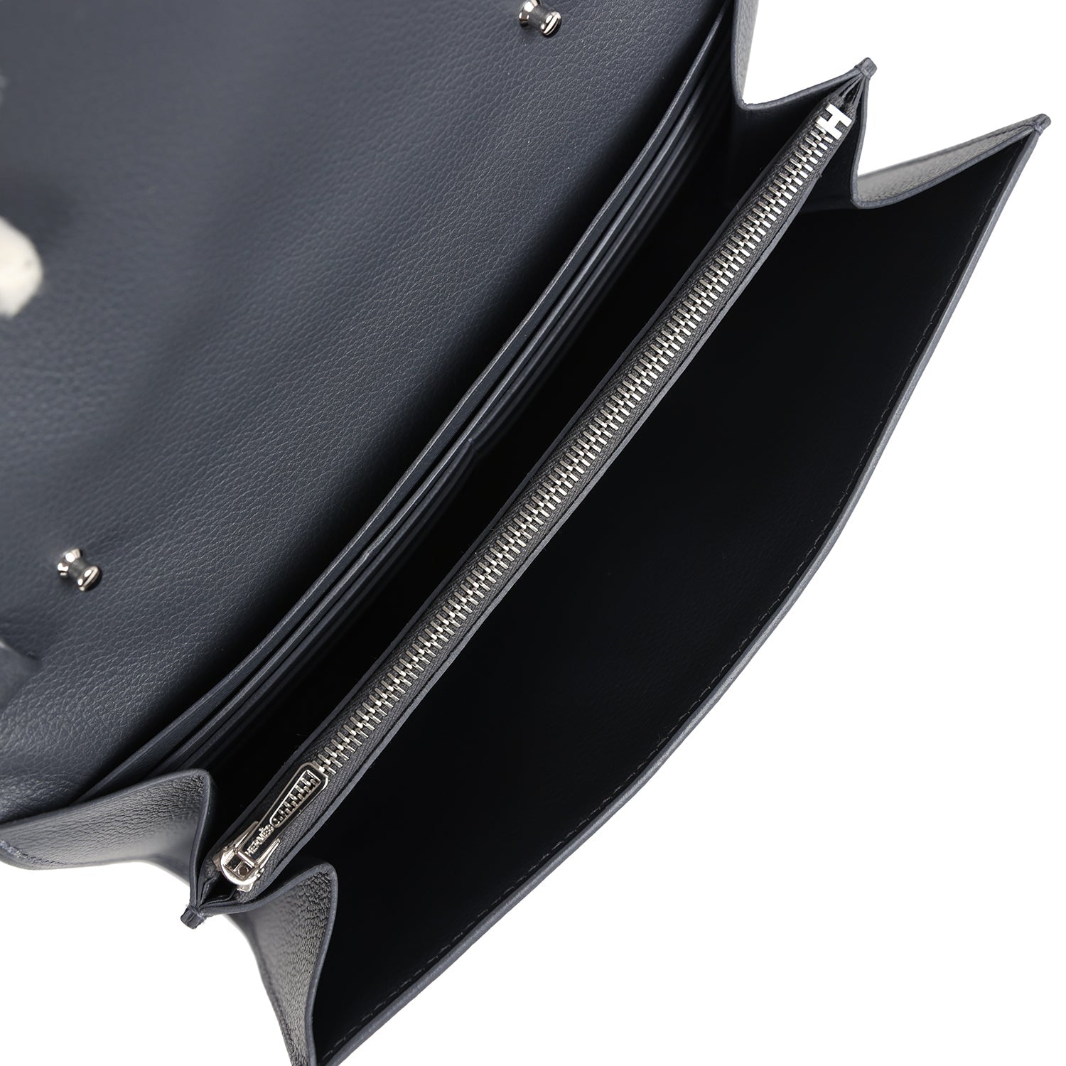 The interior is lined with Ardoise evercolor leather and two main compartments with six credit card slots and a zippered center compartment with Hermes H lock pull.