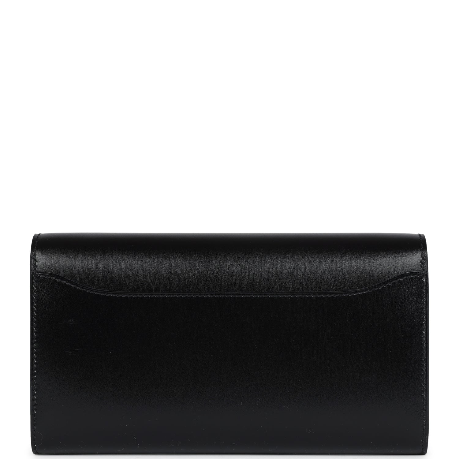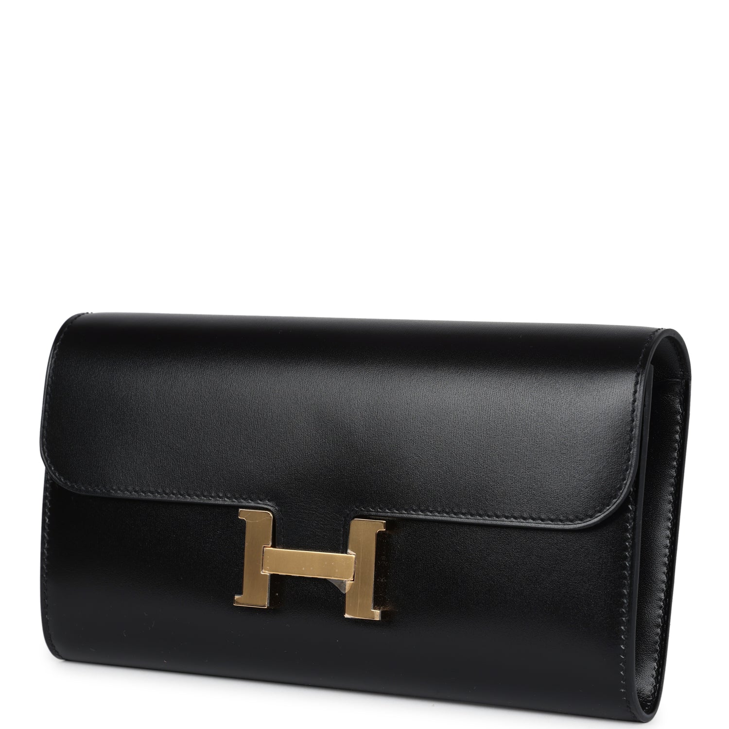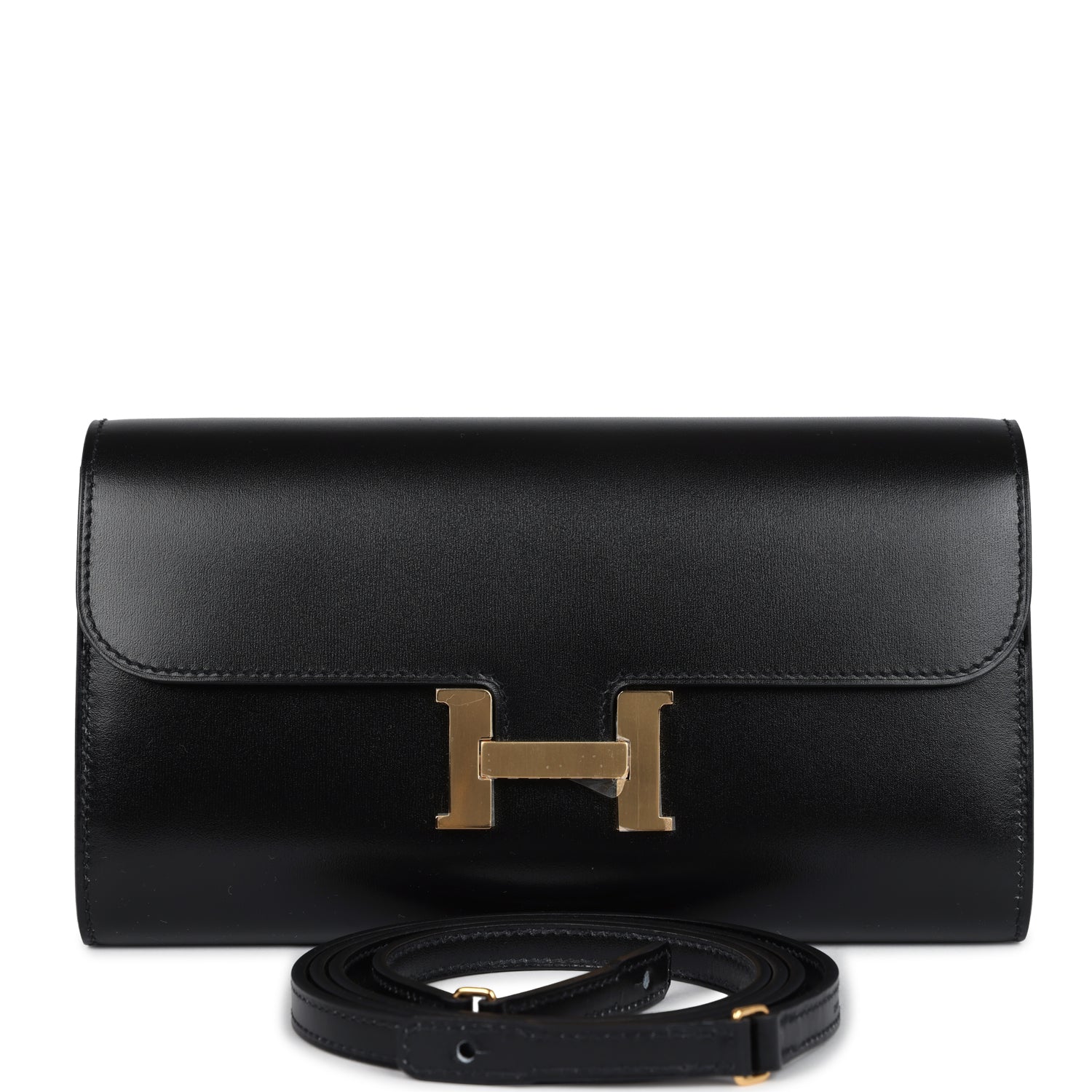 Constance Wallet To Go is in Black box calfskin leather with gold hardware and has tonal stitching, metal "H" snap lock closure, open front compartment and removable crossbody strap.