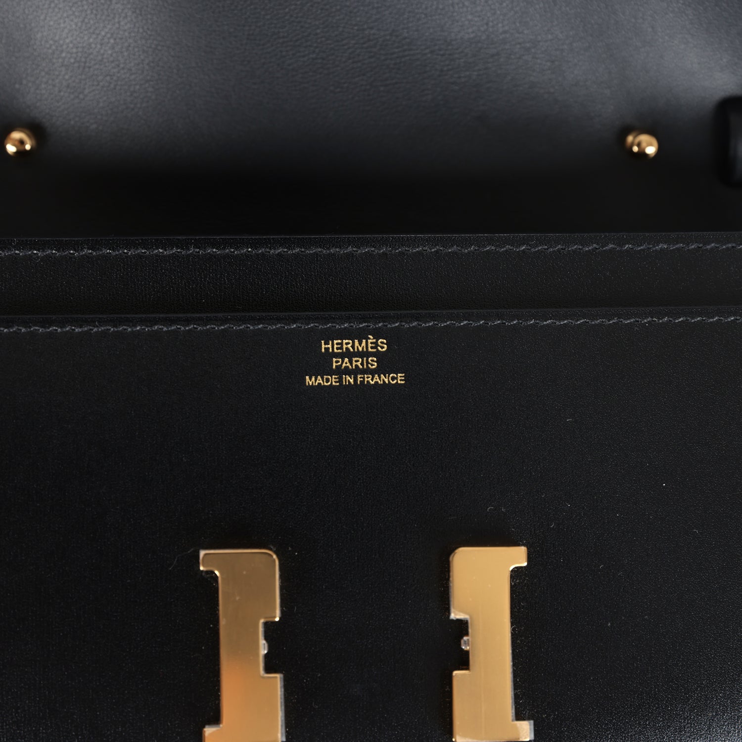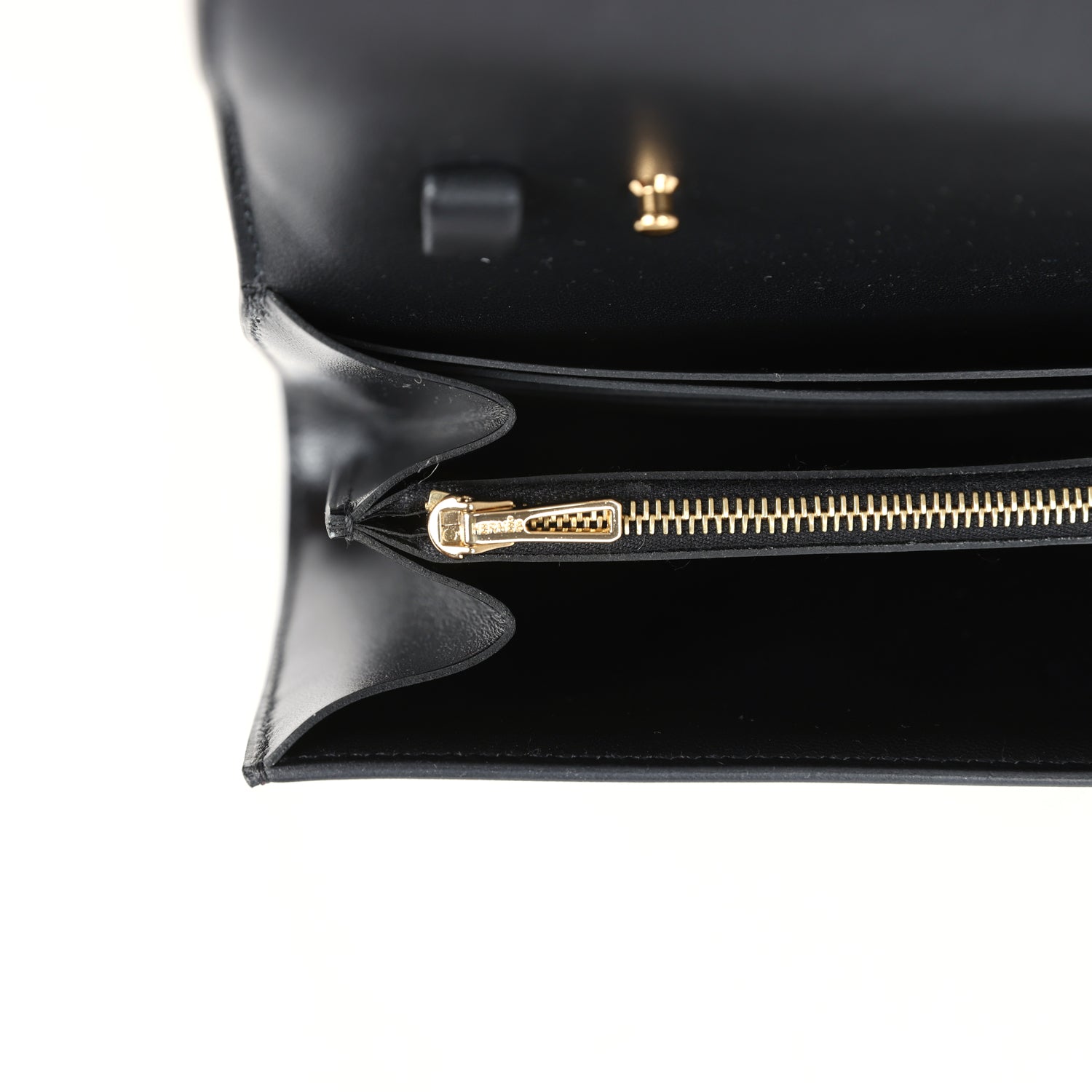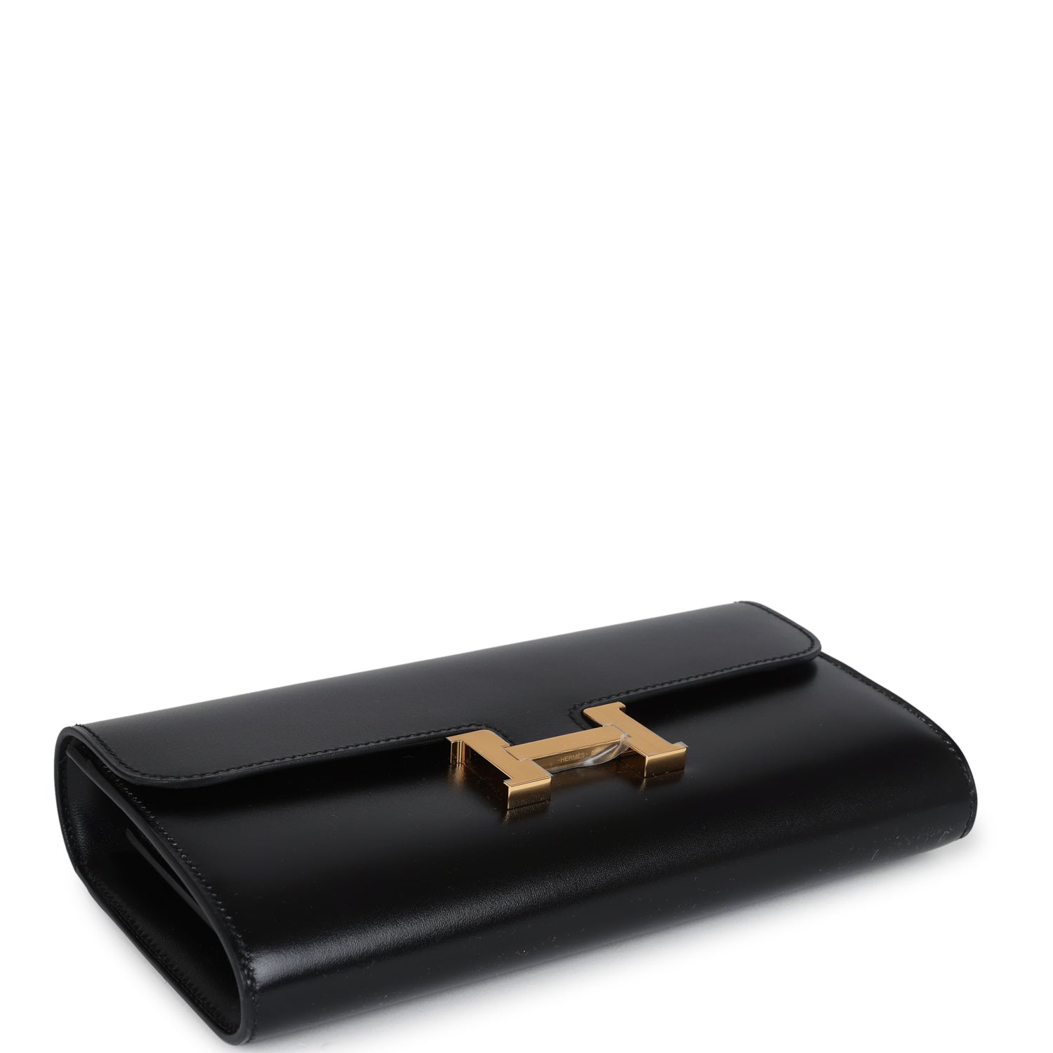 Constance Wallet To Go is in Black box calfskin leather with gold hardware and has tonal stitching, metal "H" snap lock closure, open front compartment and removable crossbody strap.