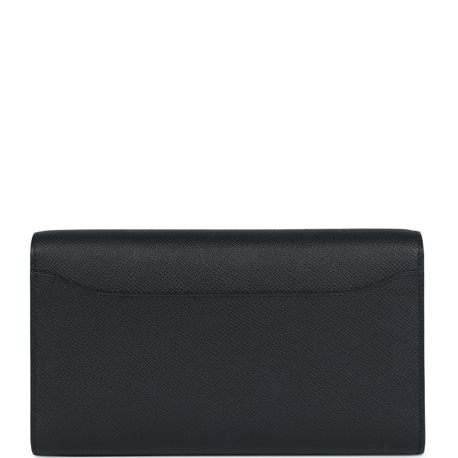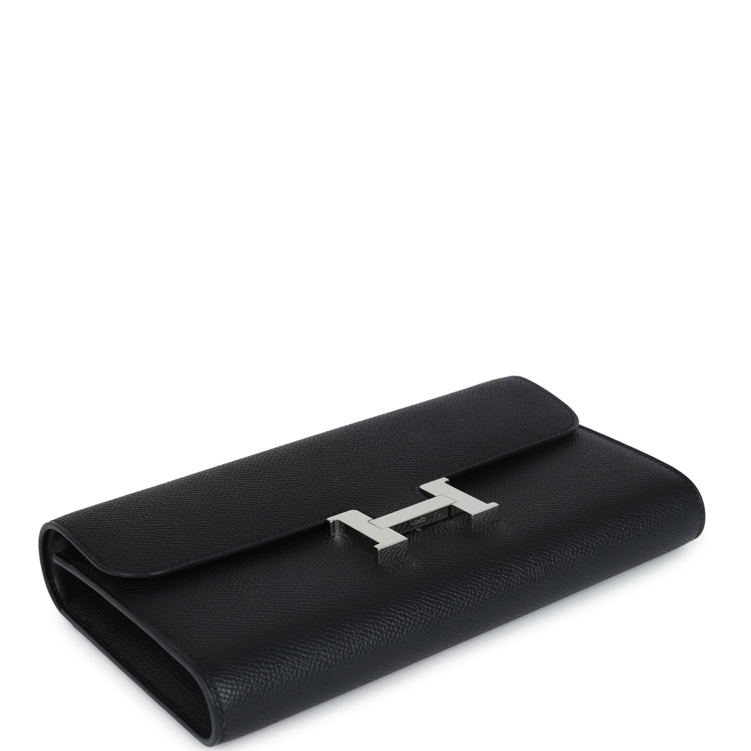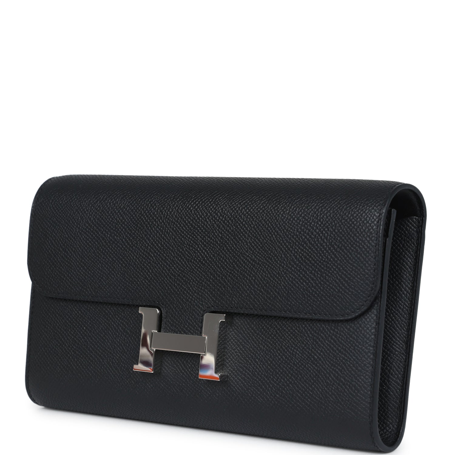 Constance Wallet To Go is in Black epsom leather with palladium hardware and has tonal stitching, metal "H" snap lock closure, open front compartment and removable crossbody strap.