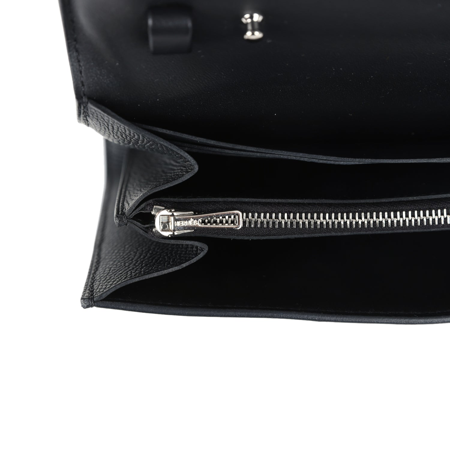 The interior is lined with Black epsom leather and two main compartments with six credit card slots and a zippered center compartment with Hermes H lock pull.