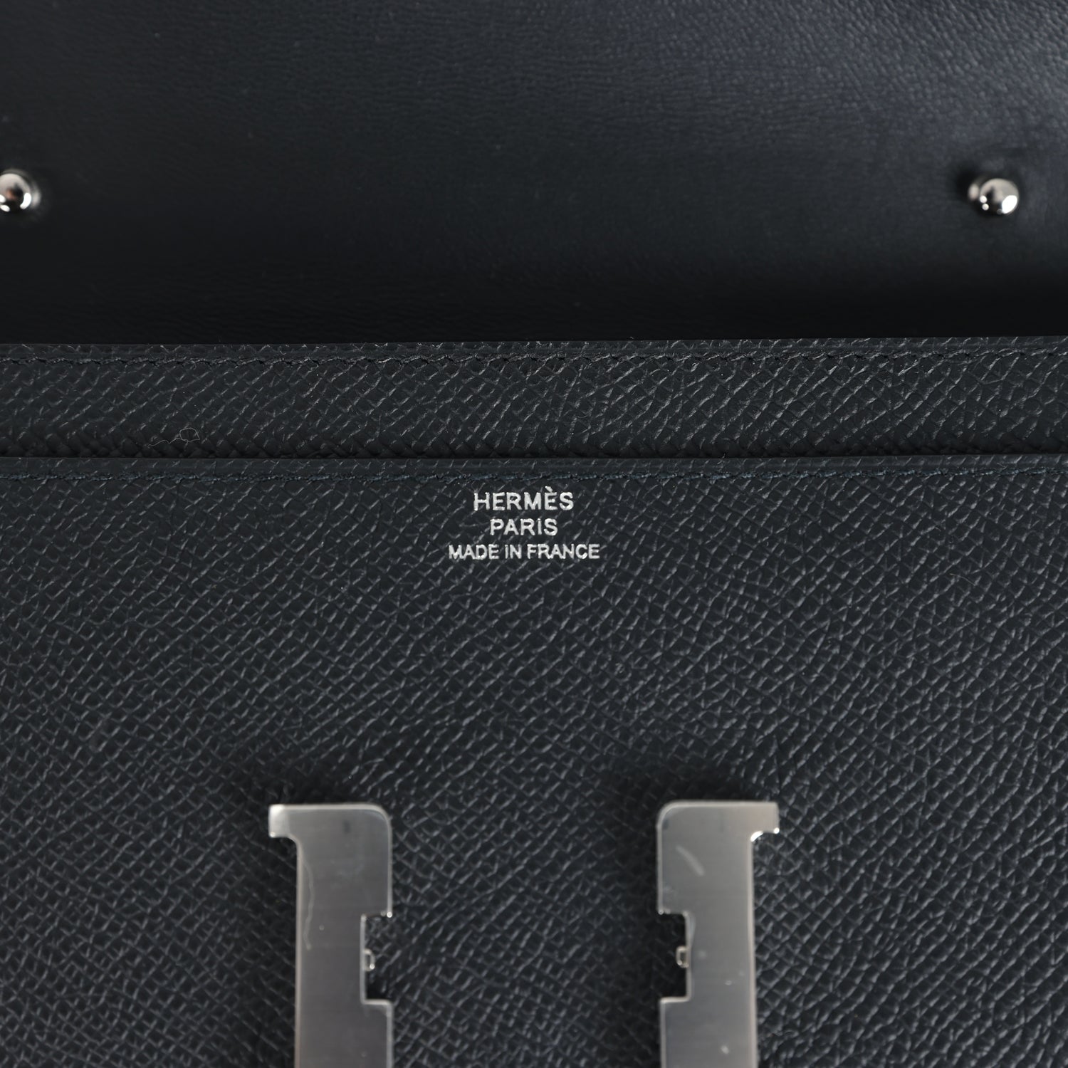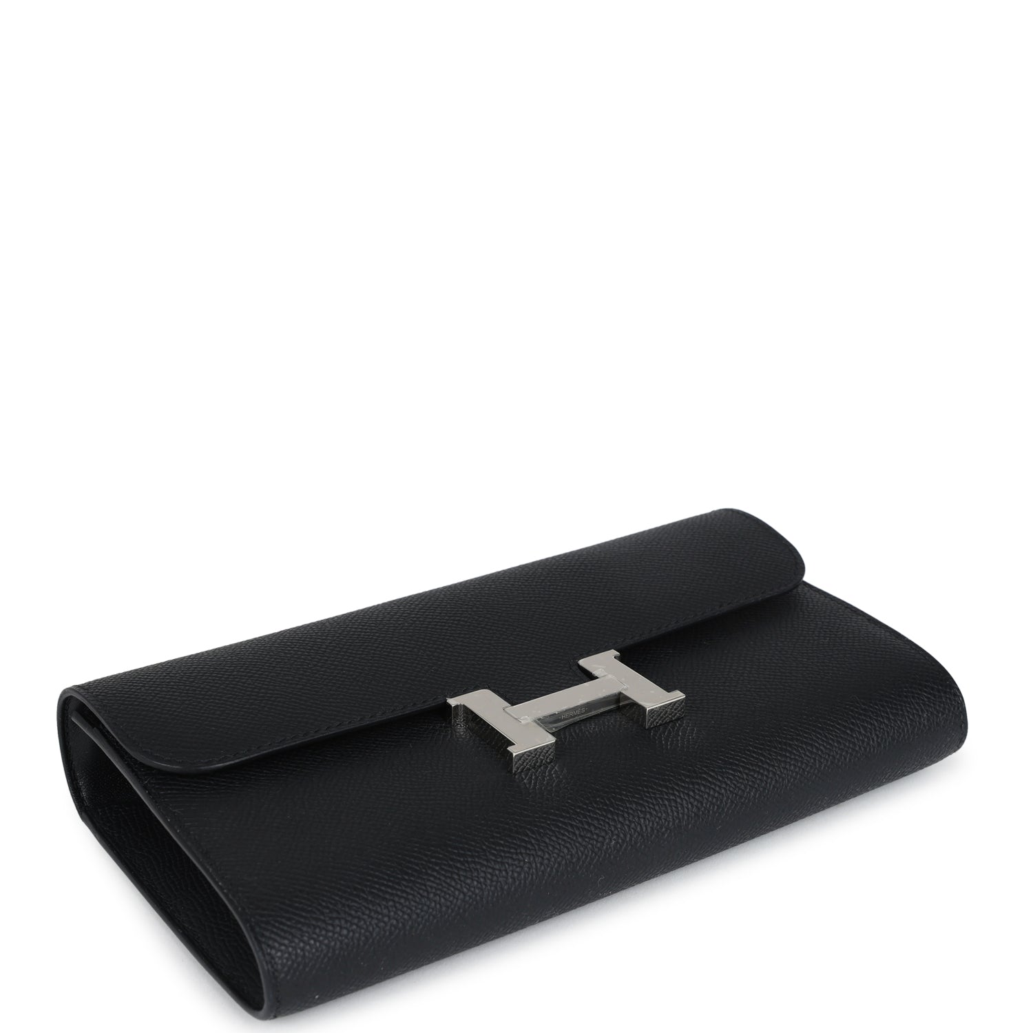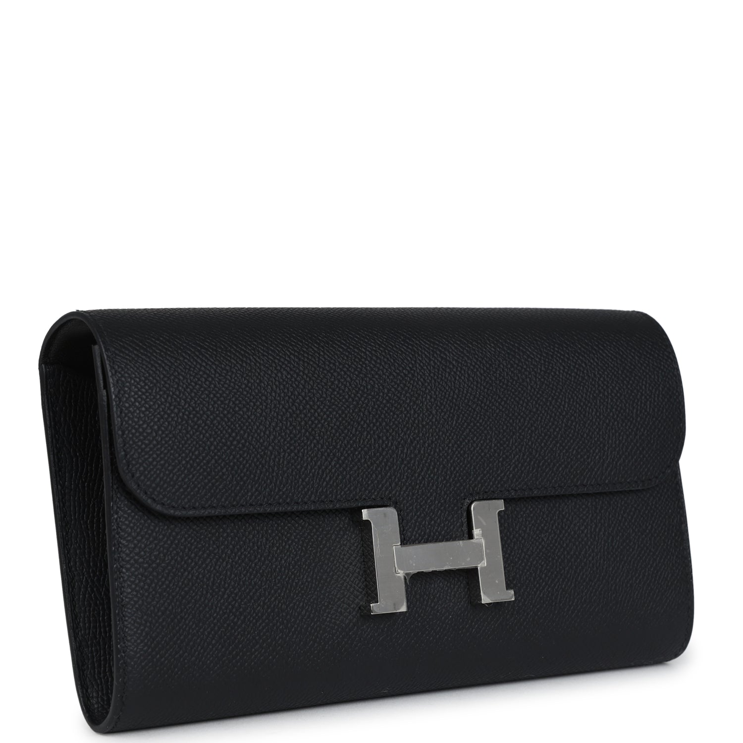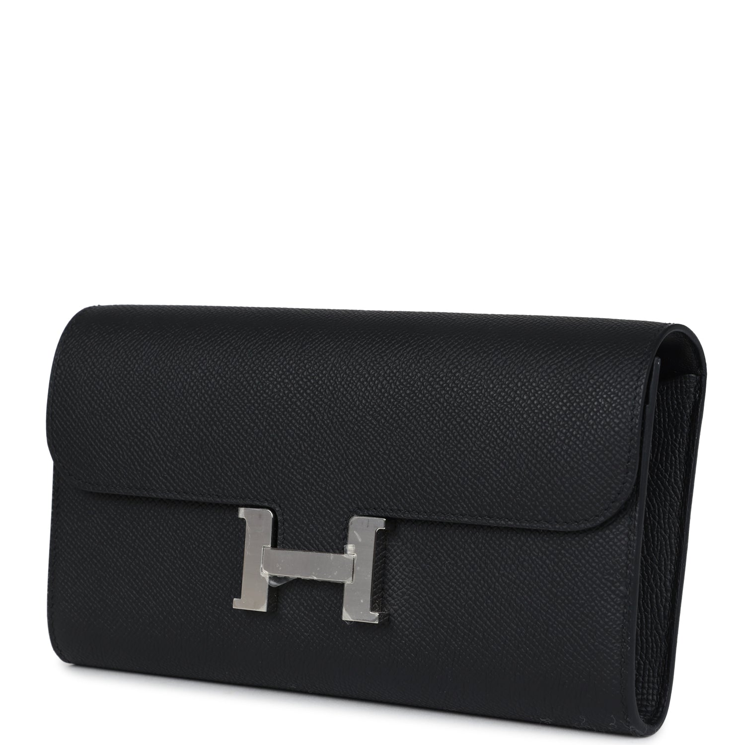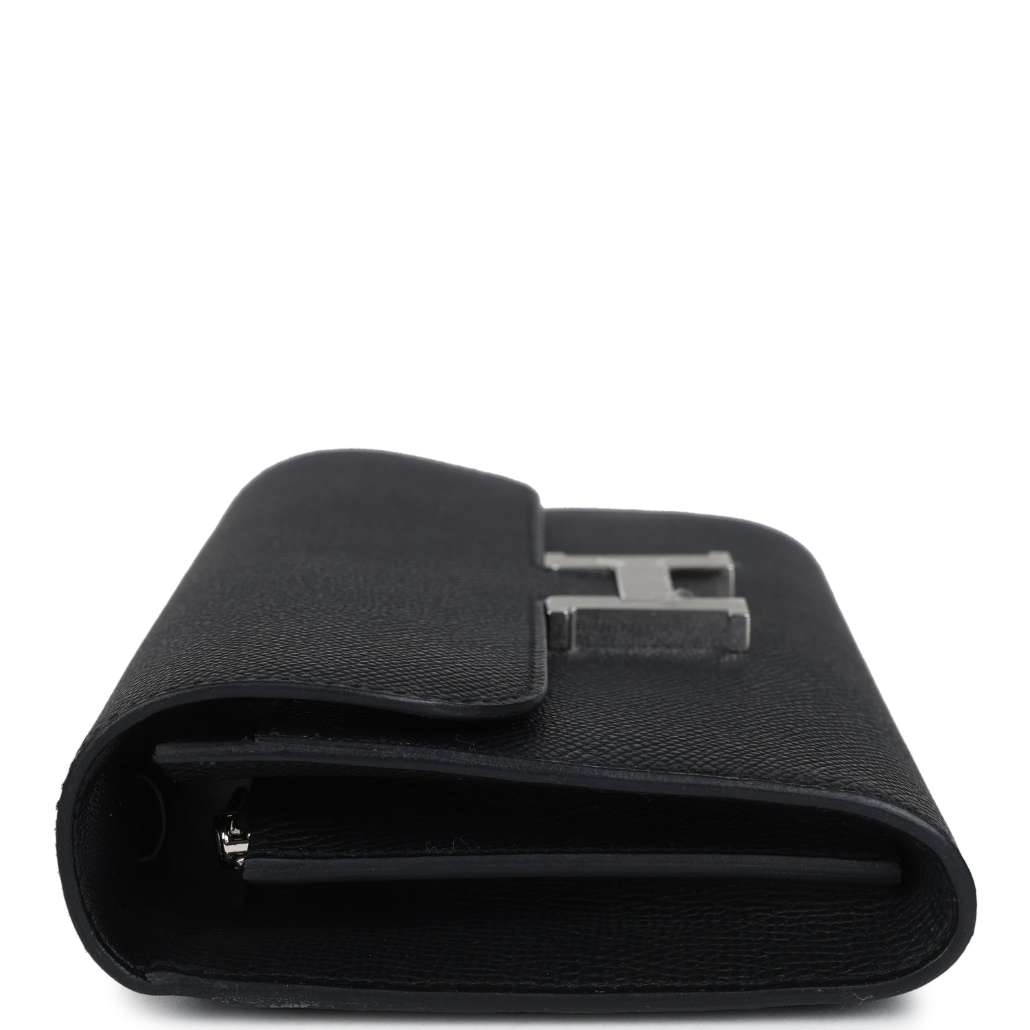 Hermes Constance Wallet To Go is in Black epsom leather with palladium hardware and has tonal stitching, metal "H" snap lock closure, open front compartment and removable crossbody strap.