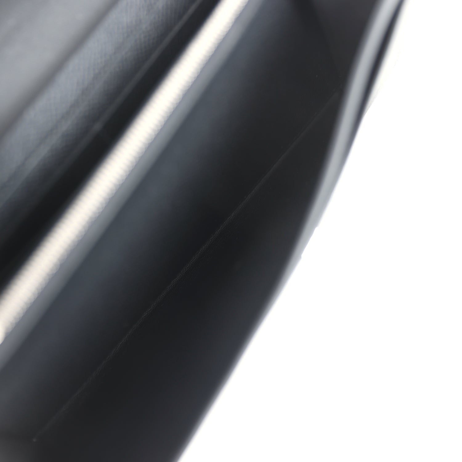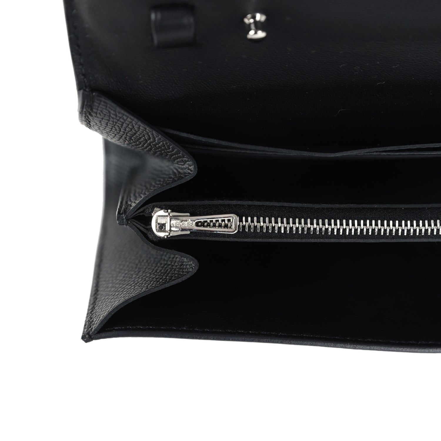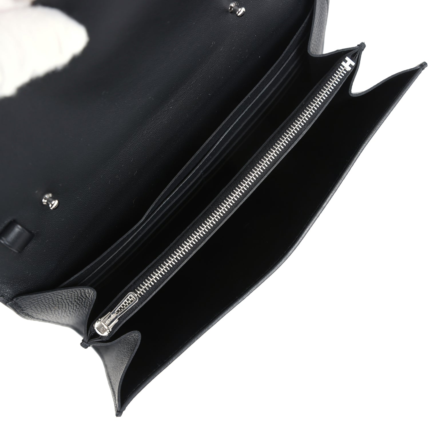The interior is lined with Black epsom leather and has two main compartments with six credit card slots and a zippered center compartment with Hermes H lock pull.