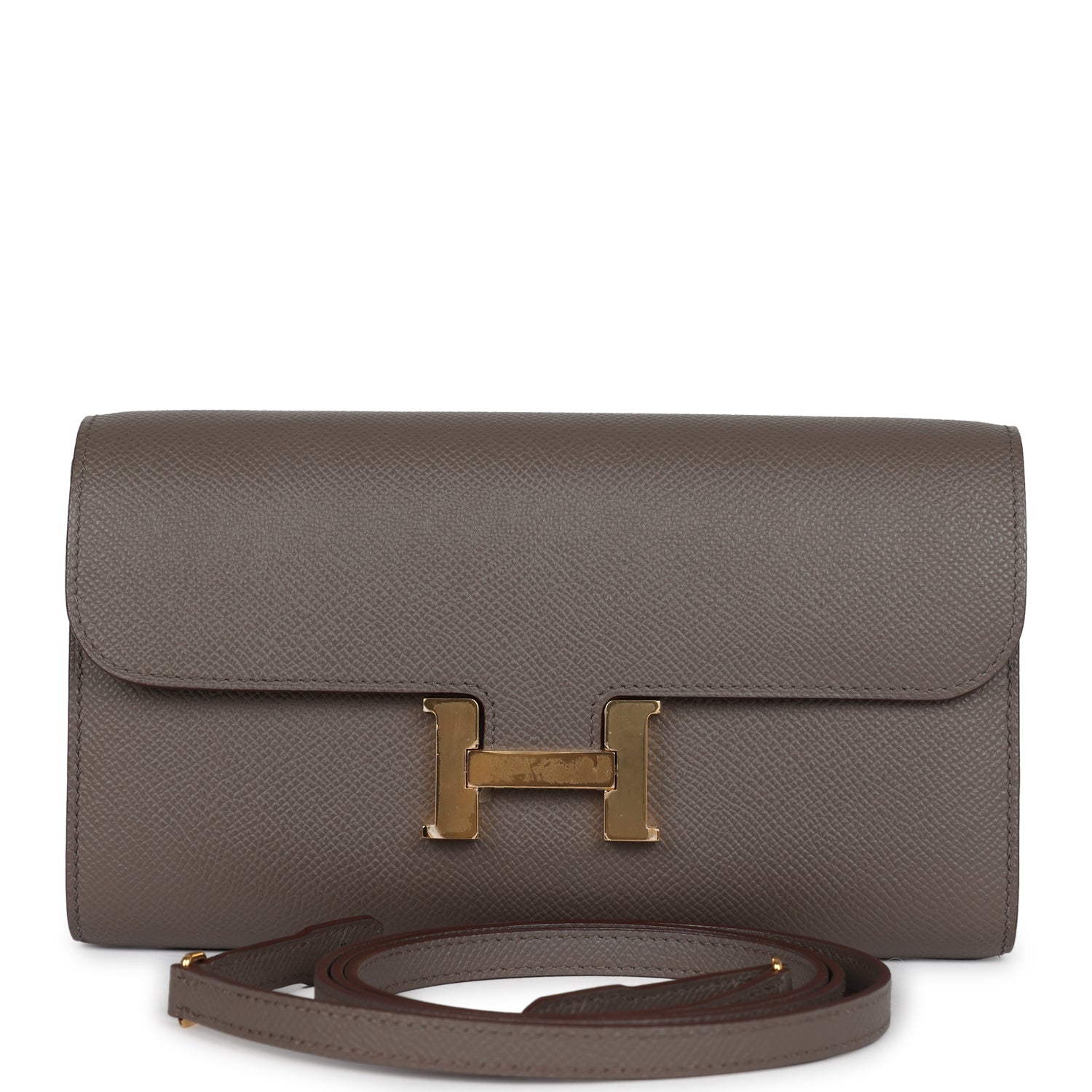 Constance Wallet To Go is in Etain epsom leather with gold hardware and has tonal stitching, metal "H" snap lock closure, open front compartment and removable crossbody strap.