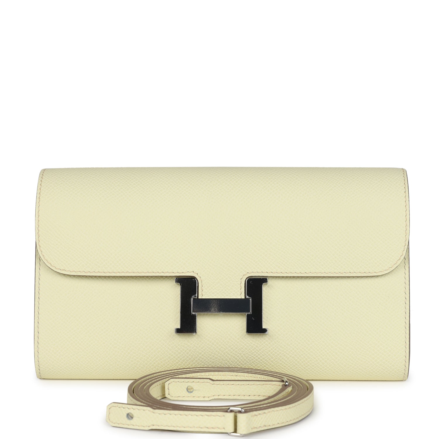 Constance Wallet To Go is in Jaune Milton epsom leather with palladium hardware and has tonal stitching, metal "H" snap lock closure, open front compartment and removable crossbody strap.