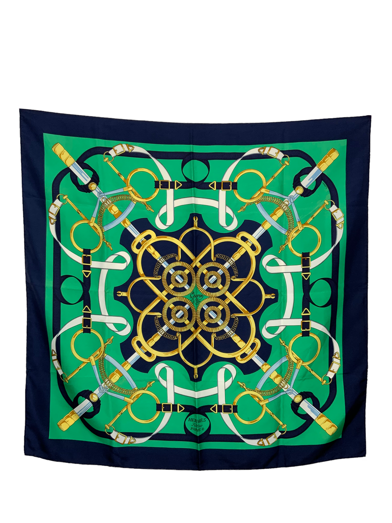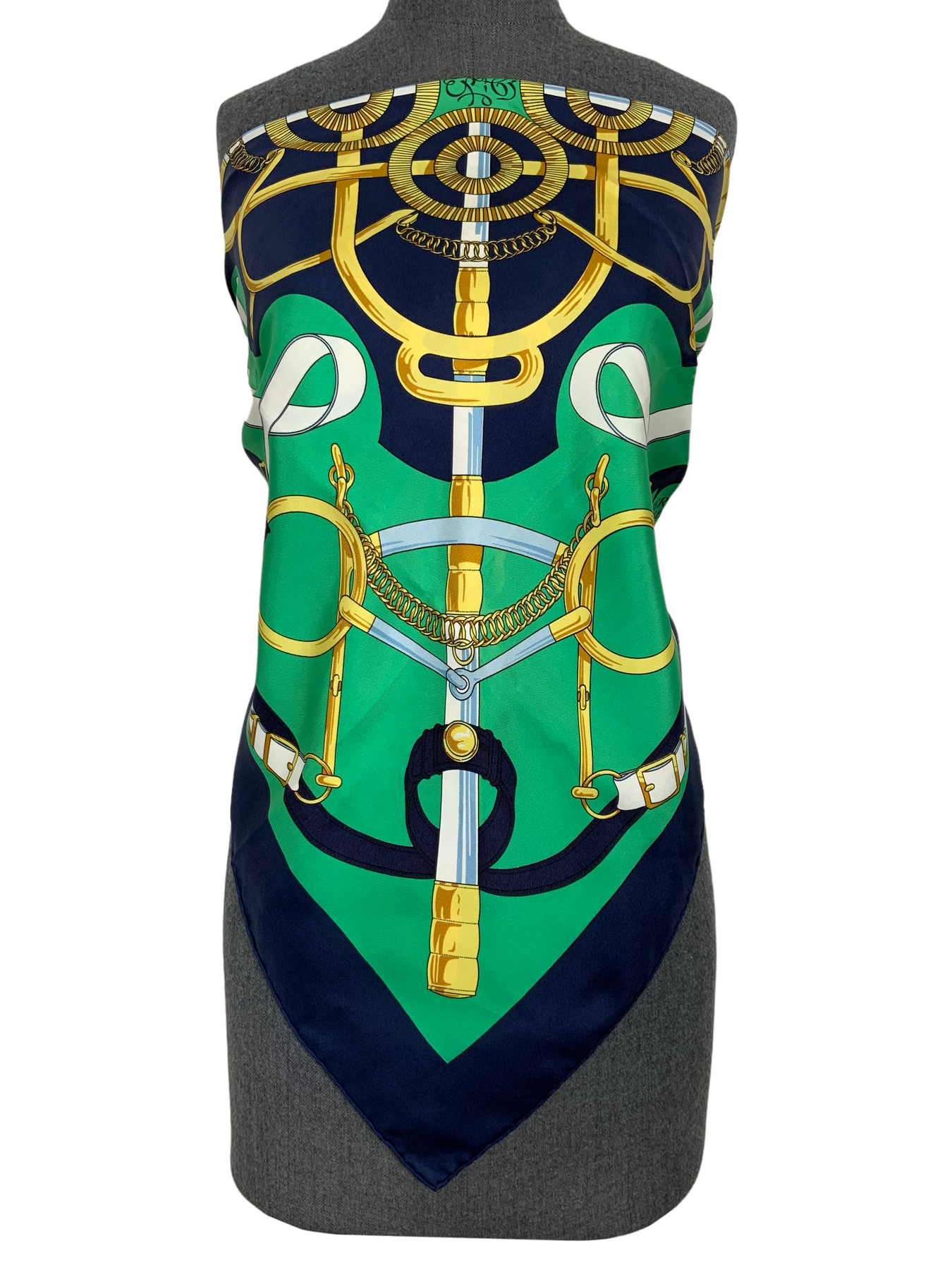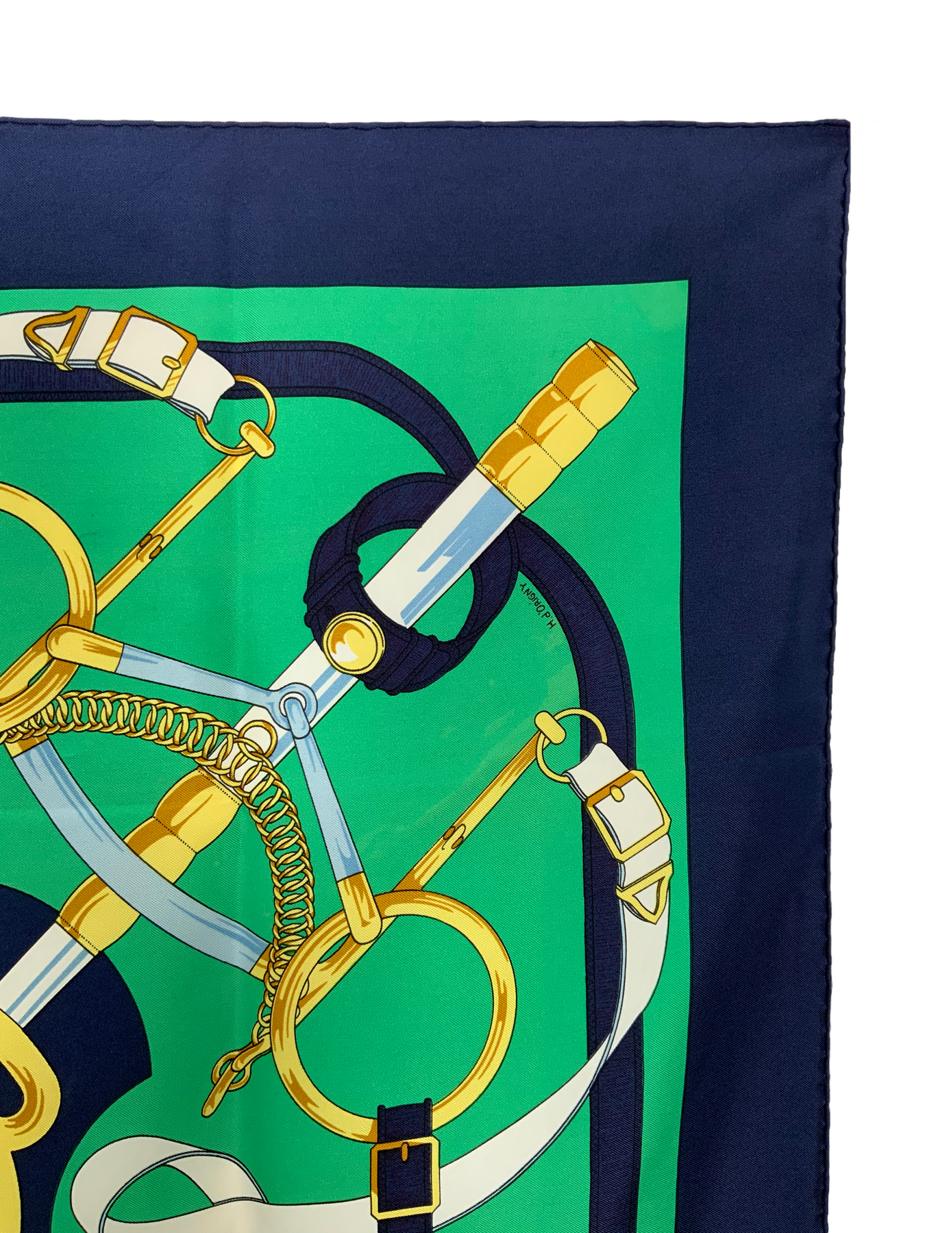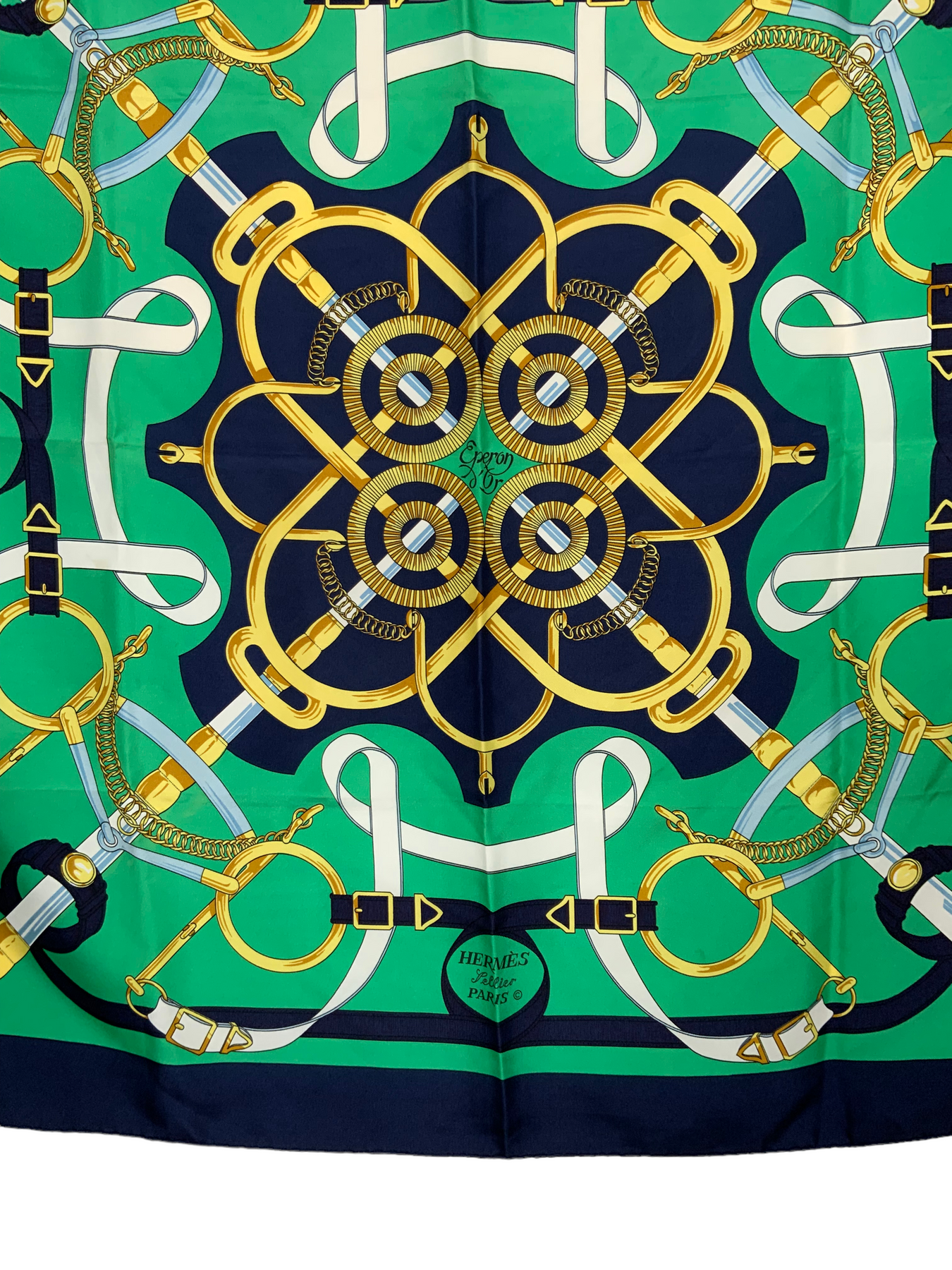 We the ity of this HERMES Eperon D'or Silk Scarf 90 designed by Henri D'origny and was first issued in 1974. Featuring beautiful hues of green, gold and navy blue with hand-rolled edges.