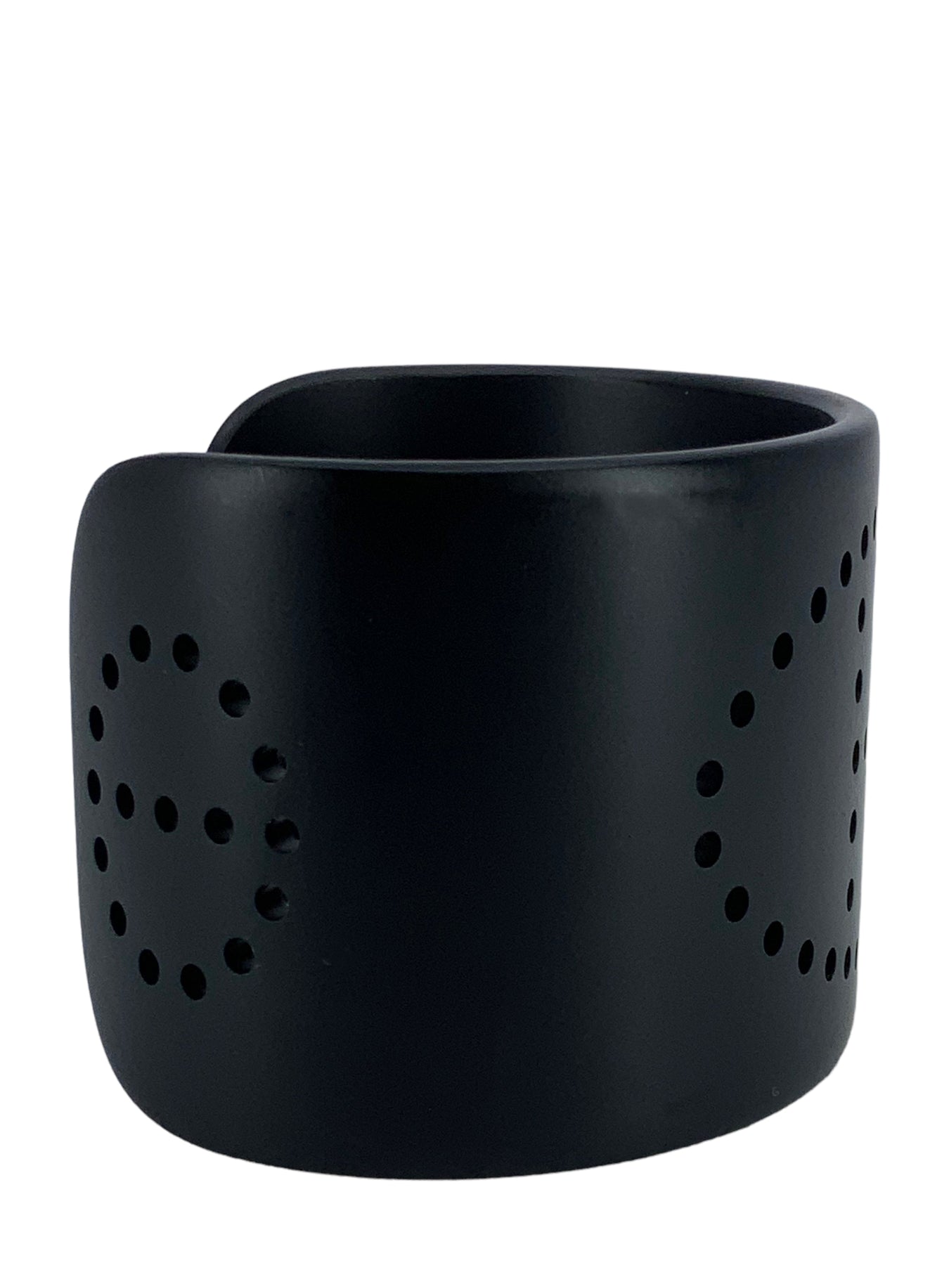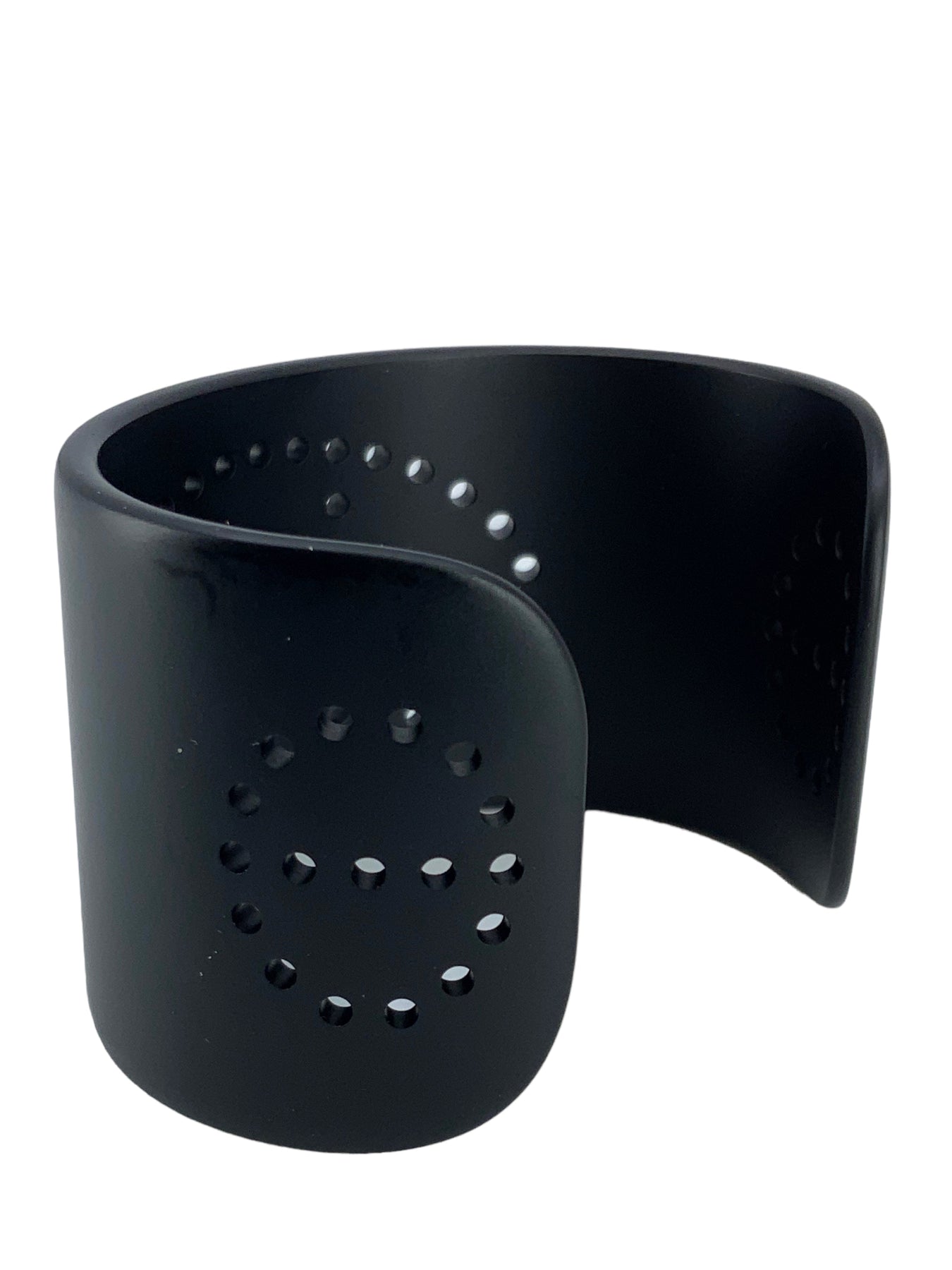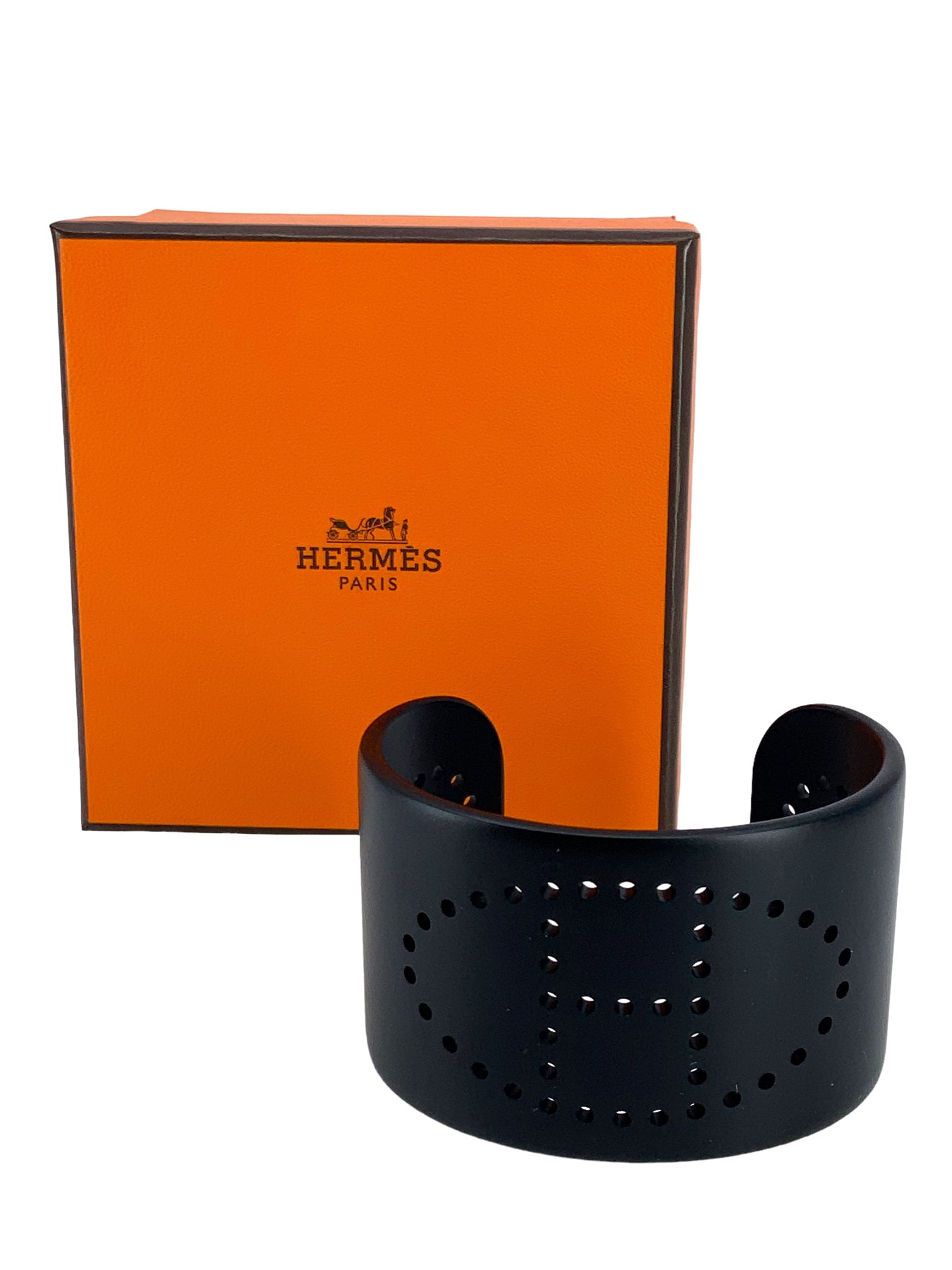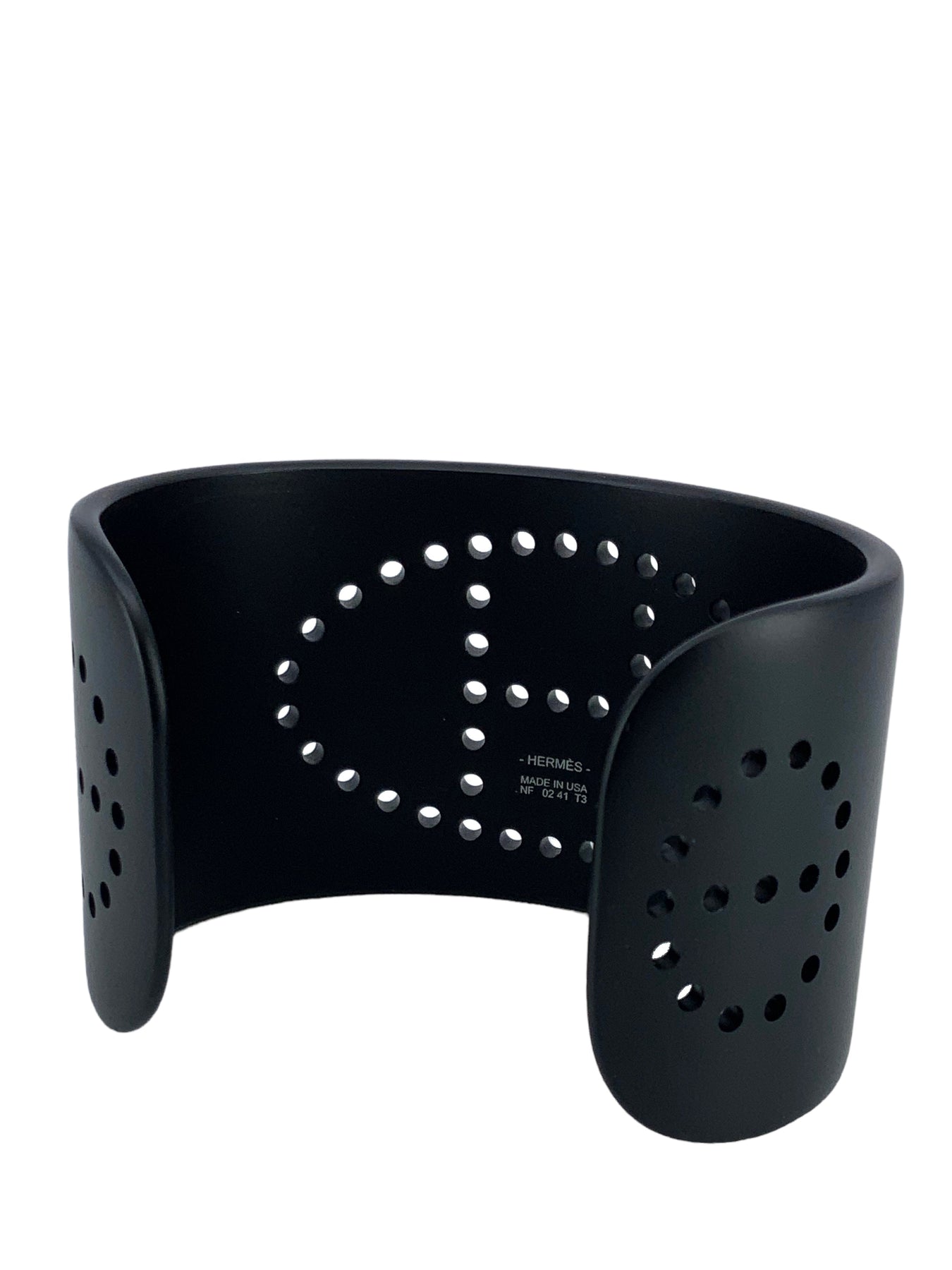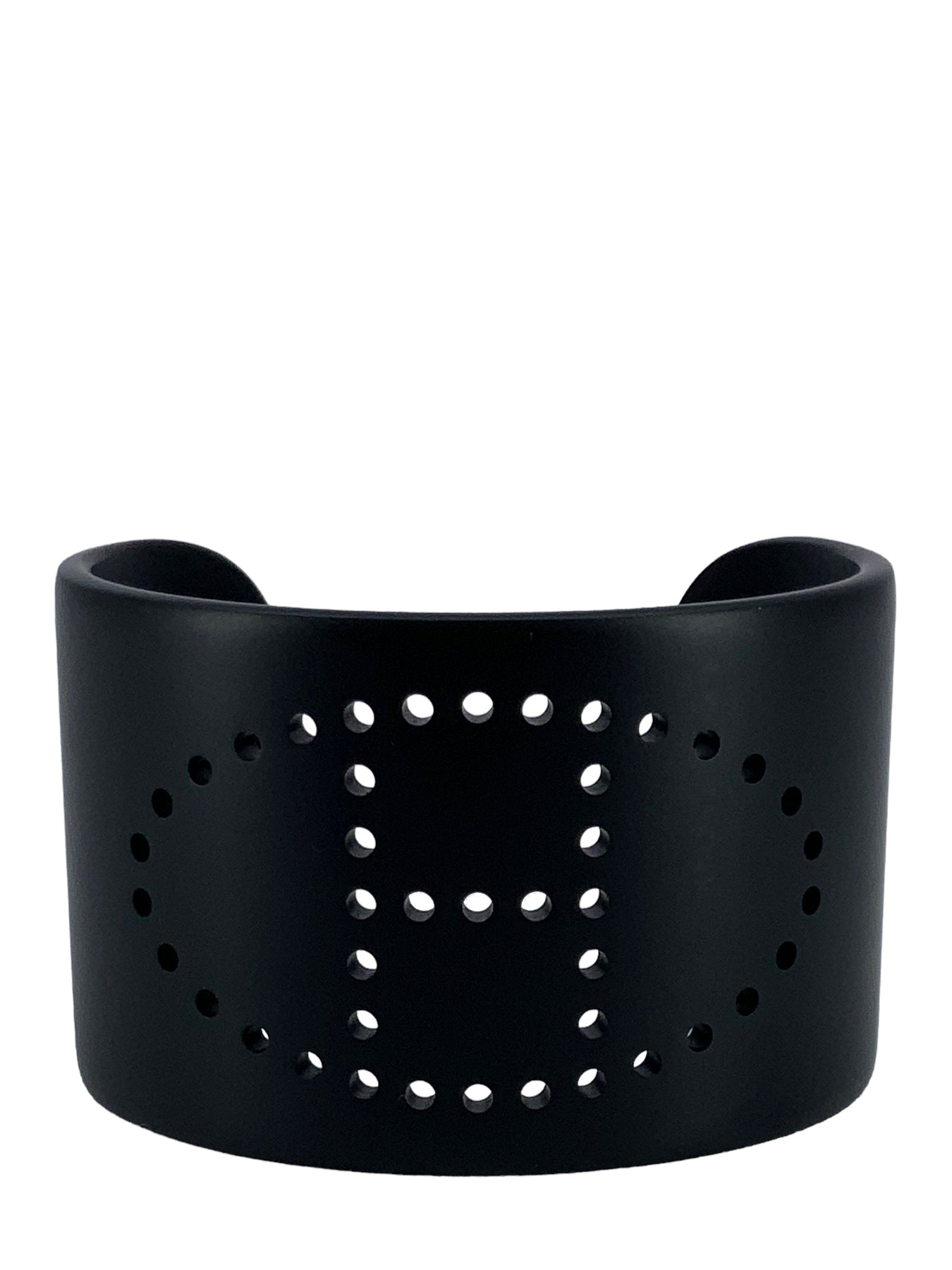 We the ity of this Hermes Evelyn Perforated H Aluminium Sunset Cuff Bracelet T3 crafted from smooth black brushed aluminum with a signature perforated H logo at center.