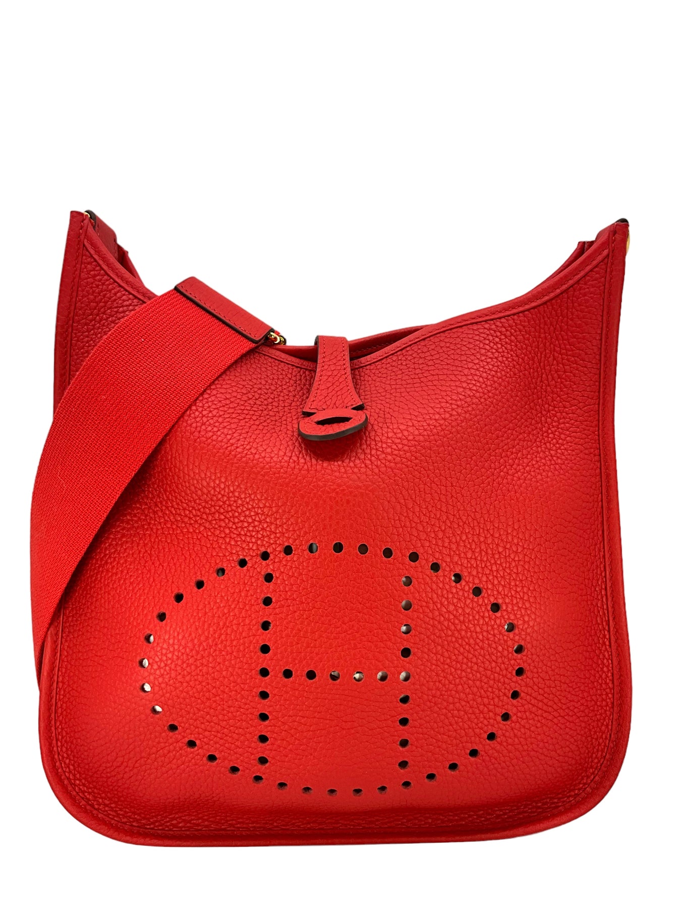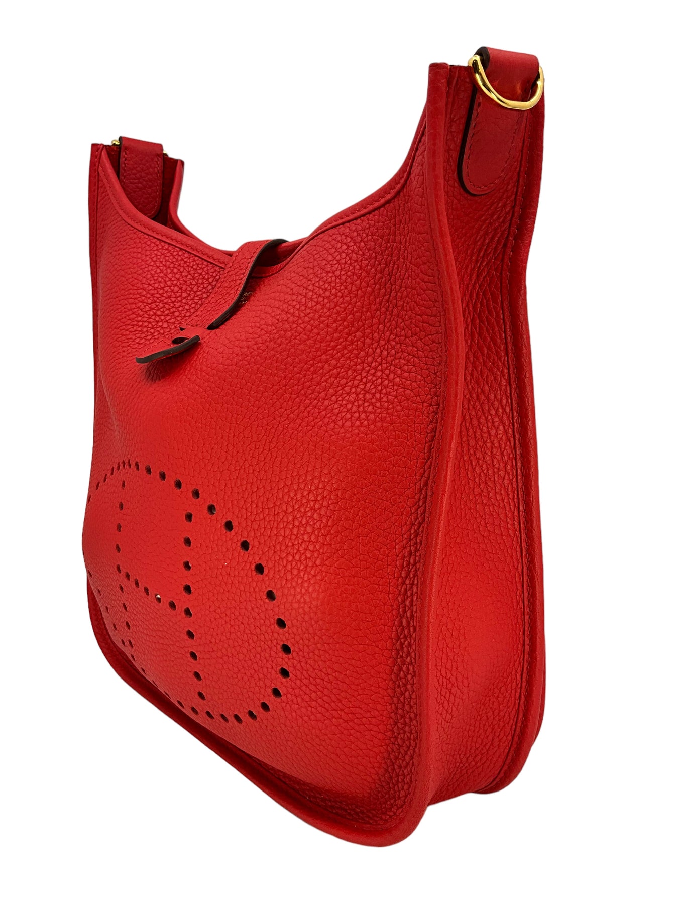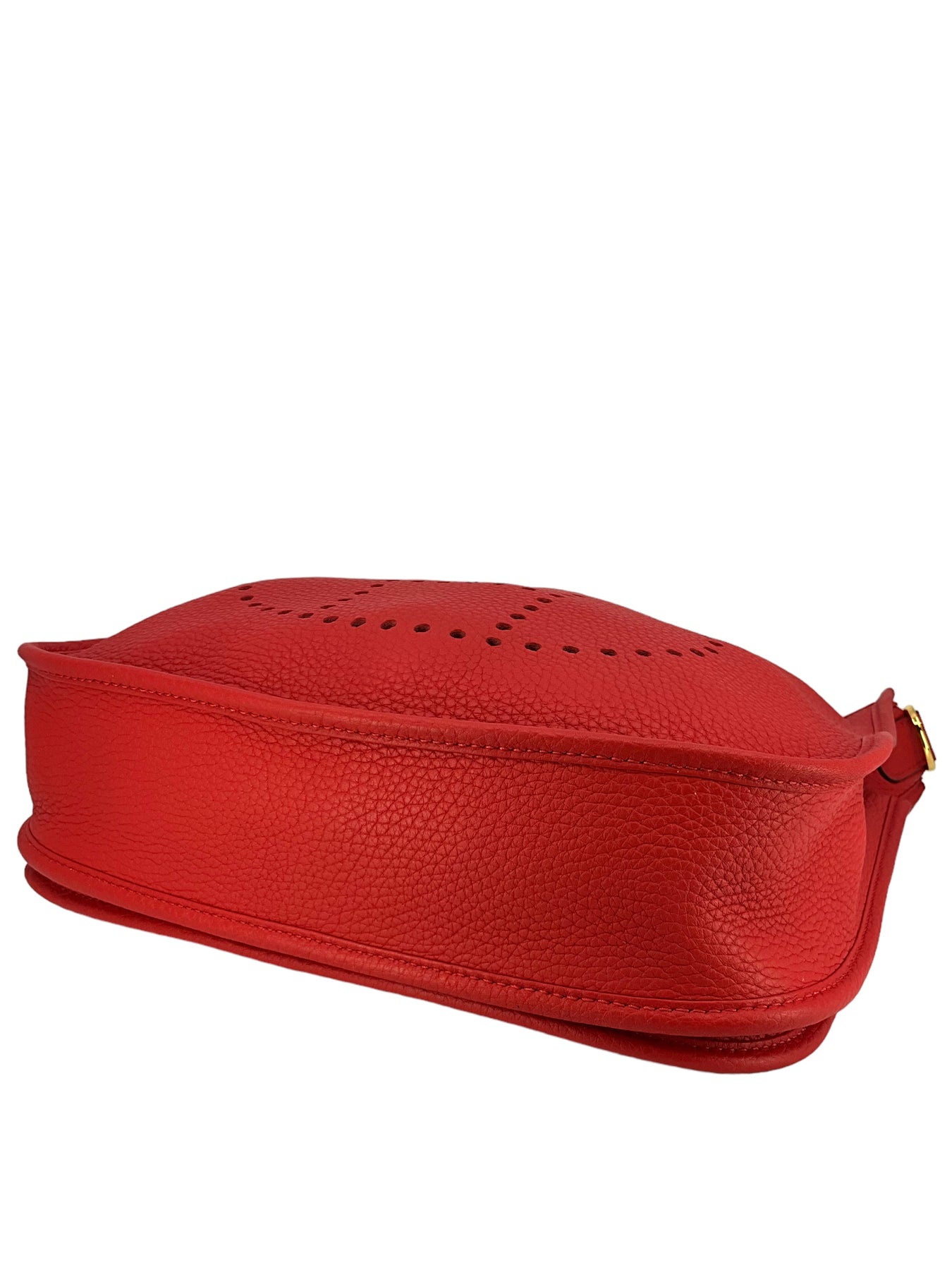 We the ity of this exquisite Hermes Evelyne III Clemence PM Crossbody Bag beautifully crafted in stunning red Clemence leather and gold-tone hardware. This iconic bag features a signature perforated Hermes H oval logo on the front and a large rear compartment pocket. The top of the bag opens to a spacious interior finely lined in tonal red suede.