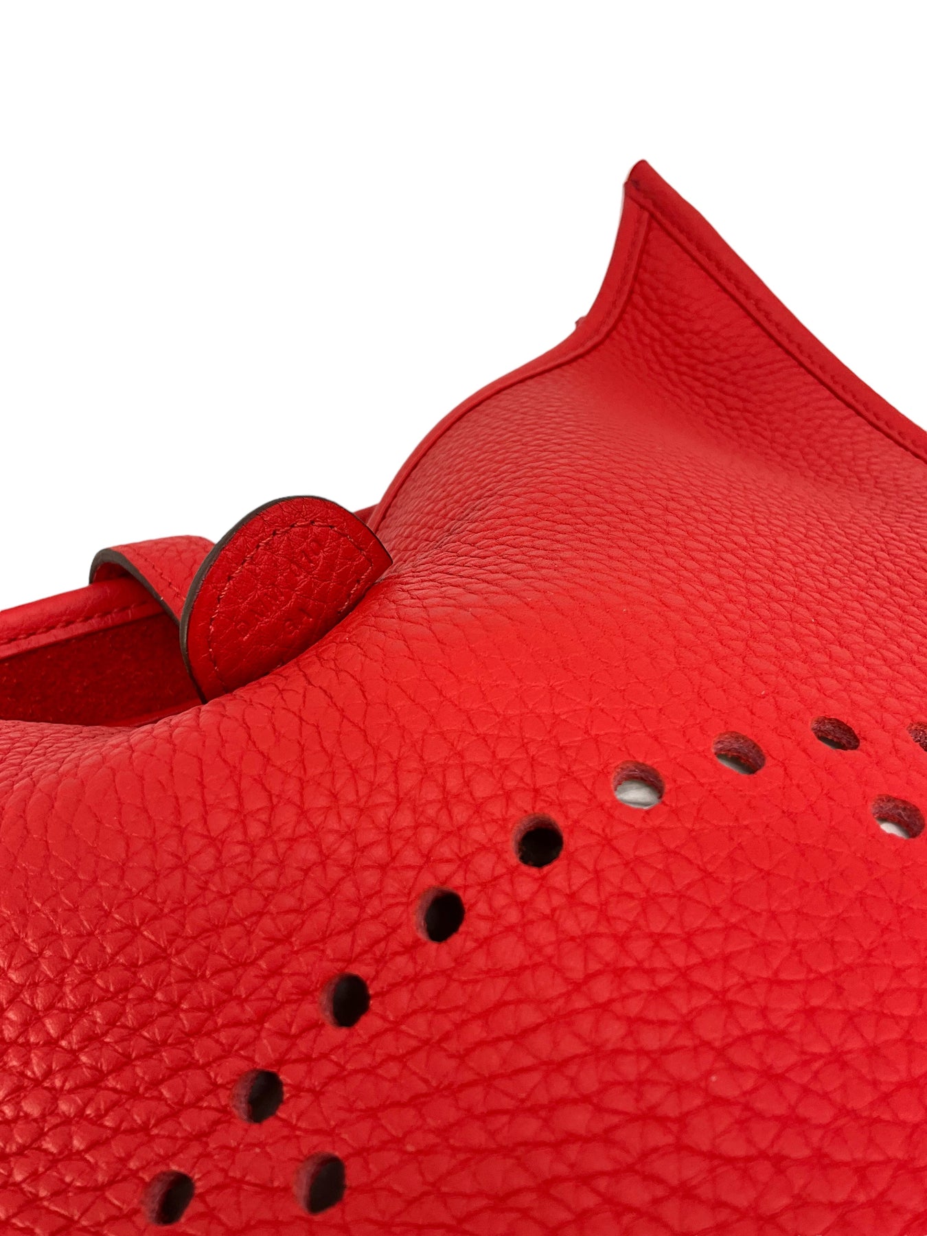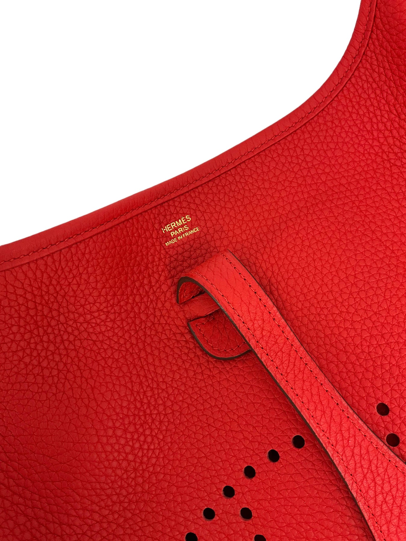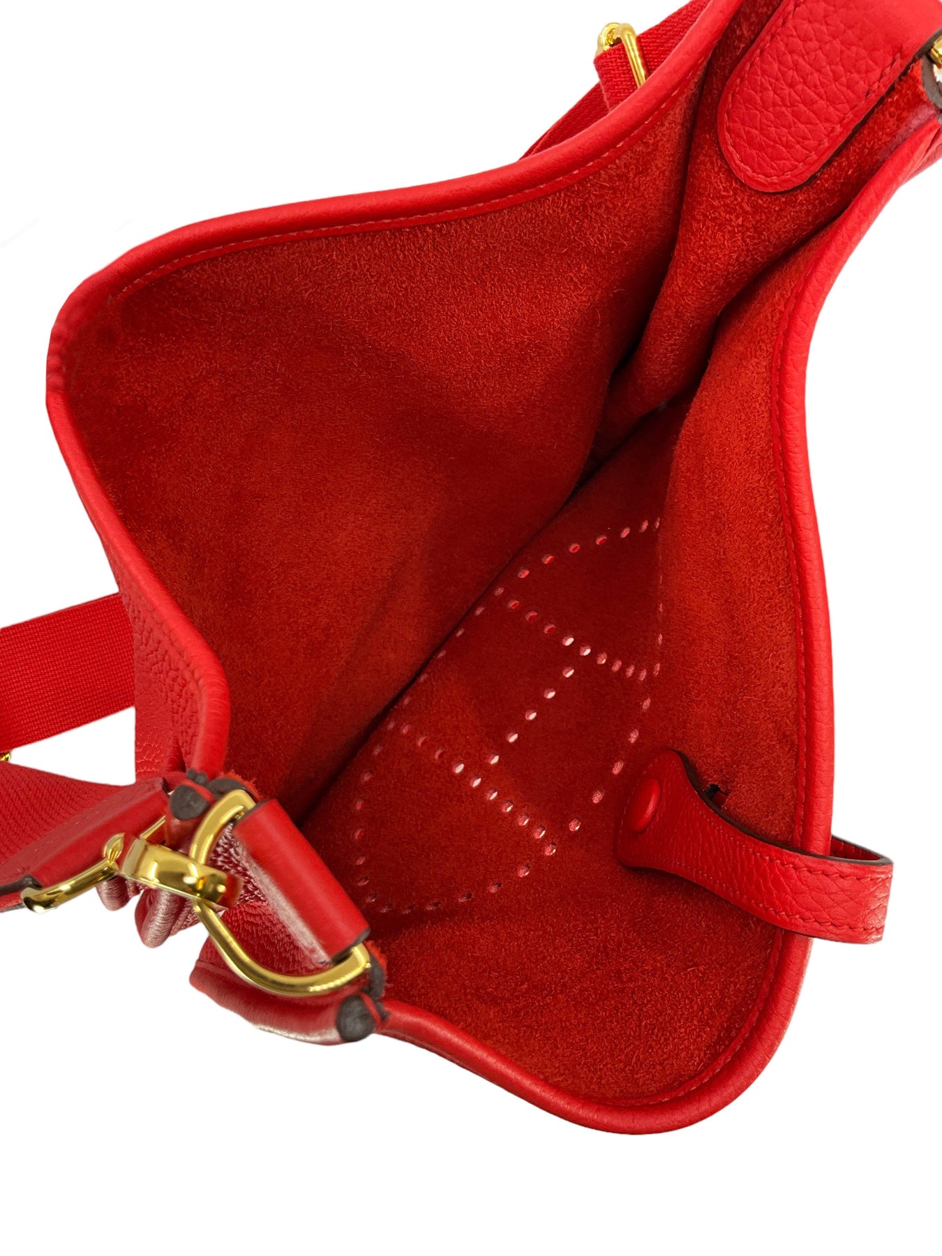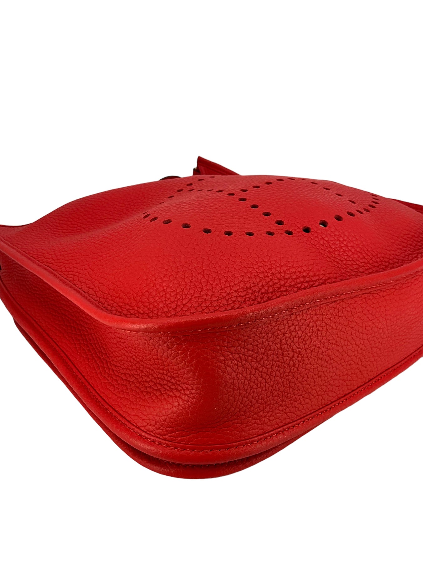 We the ity of this exquisite Hermes Evelyne III Clemence PM Crossbody Bag beautifully crafted in stunning red Clemence leather and gold-tone hardware. This iconic bag features a signature perforated Hermes H oval logo on the front and a large rear compartment pocket. The top of the bag opens to a spacious interior finely lined in tonal red suede.