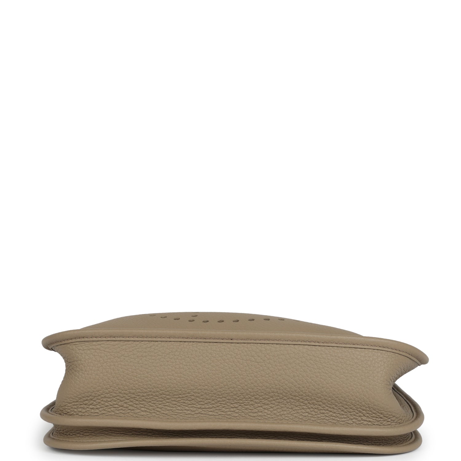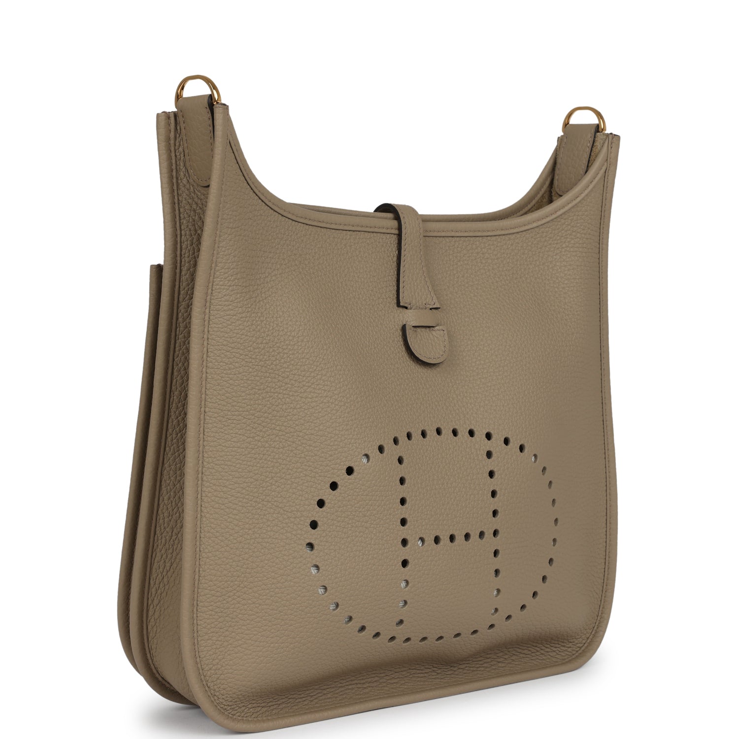 Evelyne is in Beige Marfa clemence leather with gold hardware and has tonal stitching, pull tab top closure and Beige Marfa removable canvas and leather shoulder/crossbody strap.