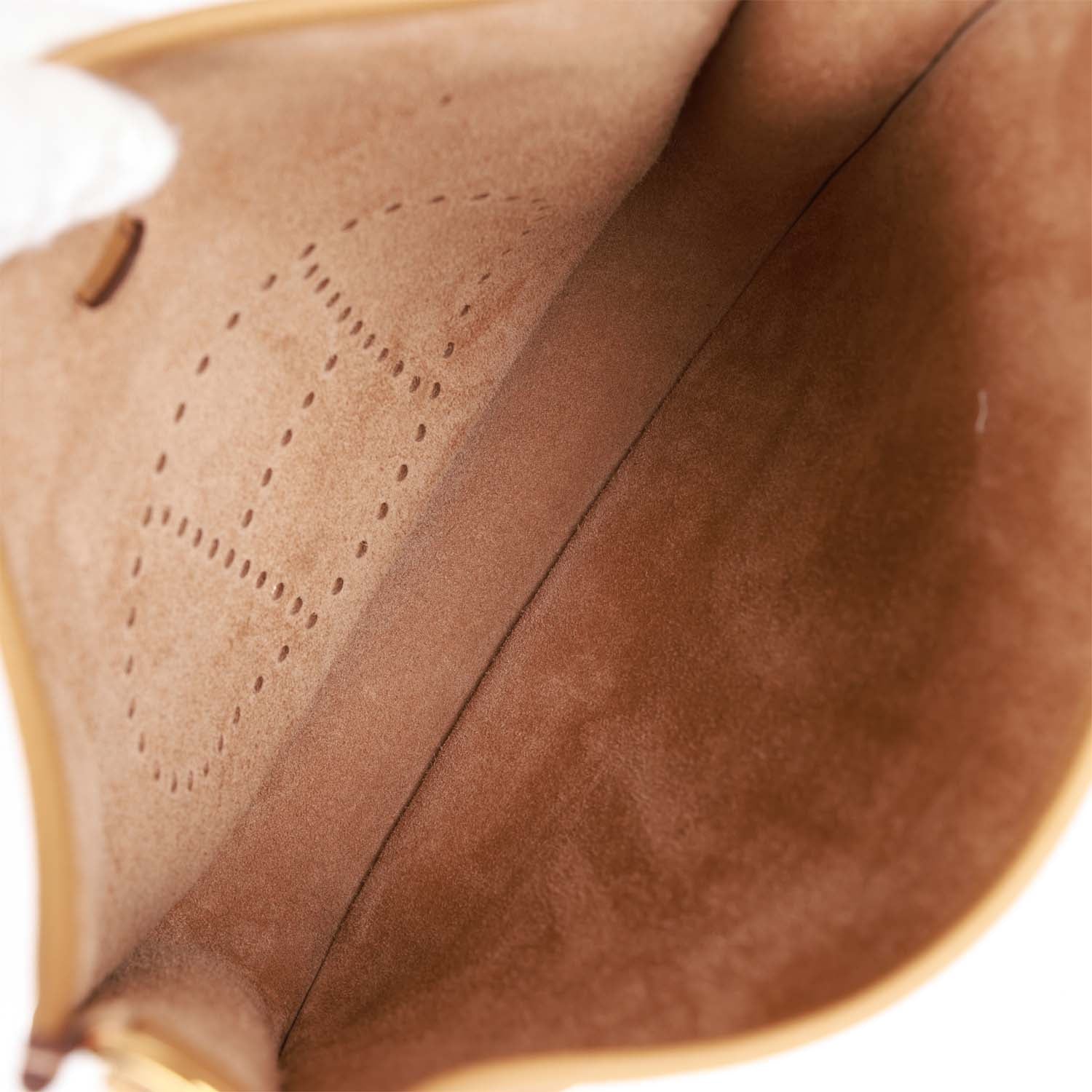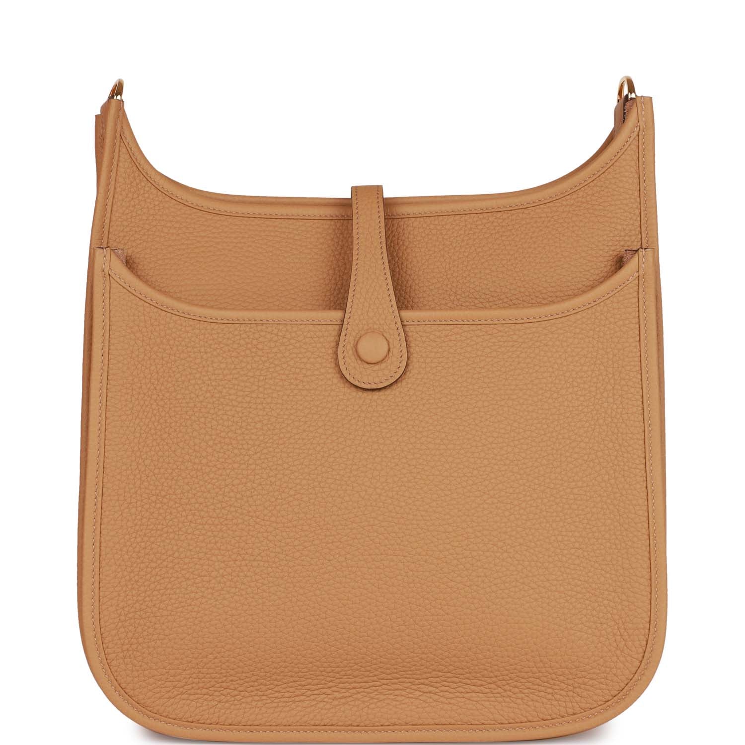 This Evelyne is in Biscuit clemence leather with gold hardware and has tonal stitching, pull tab top closure and Biscuit removable canvas and leather shoulder/crossbody strap.