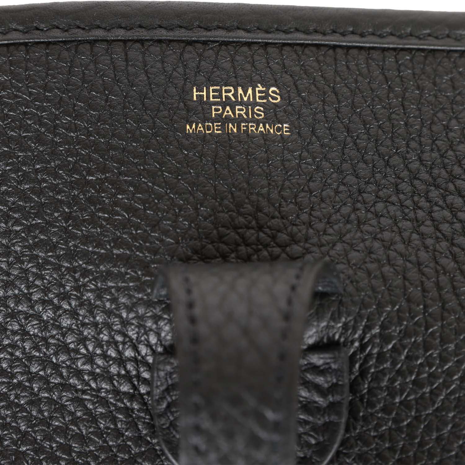 This Evelyne is in Black clemence leather with gold hardware and has tonal stitching, pull tab top closure and Black removable canvas and leather shoulder/crossbody strap.