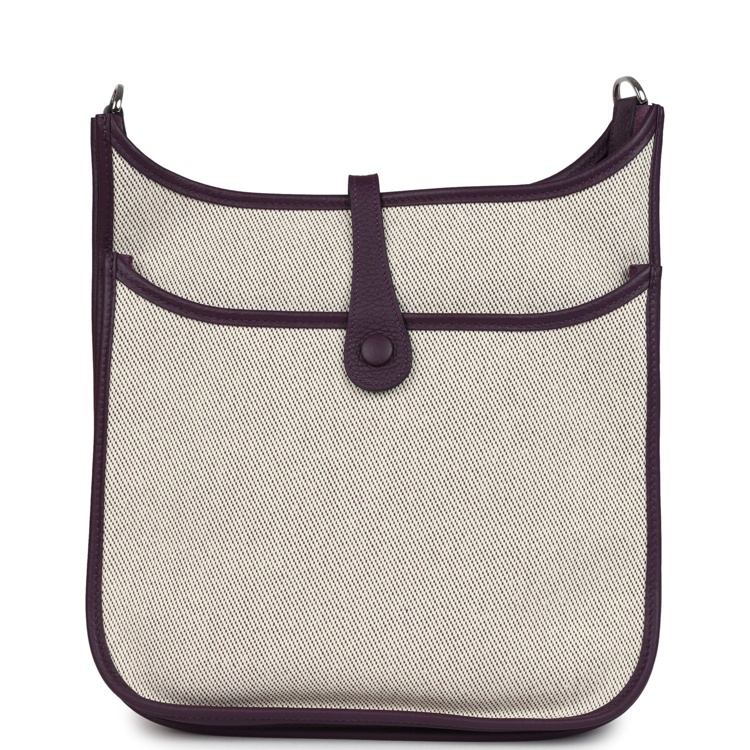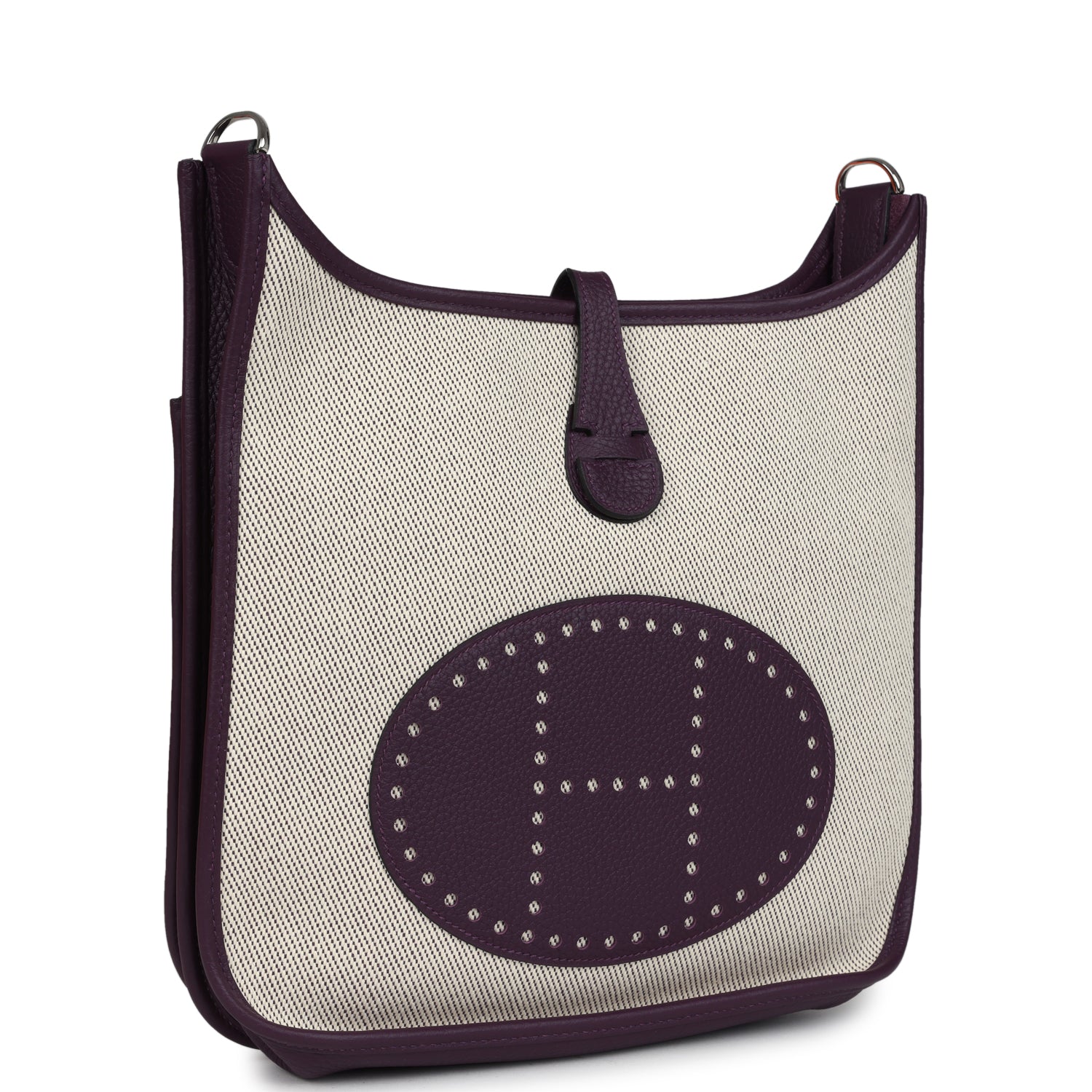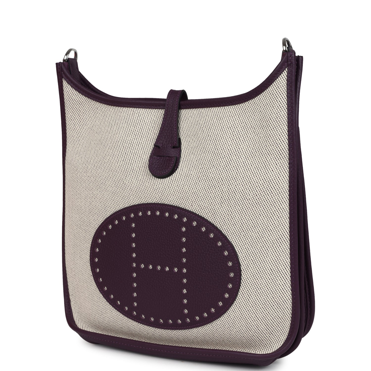 Hermes Evelyne PM messenger bag is of Cassis Clemence leather and Ecru Toile H canvas leather with Palladium Hardware, tonal stitching, large perforated H in circle (front), pull tab top snap closure and removable Cassis shoulder/crossbody strap.